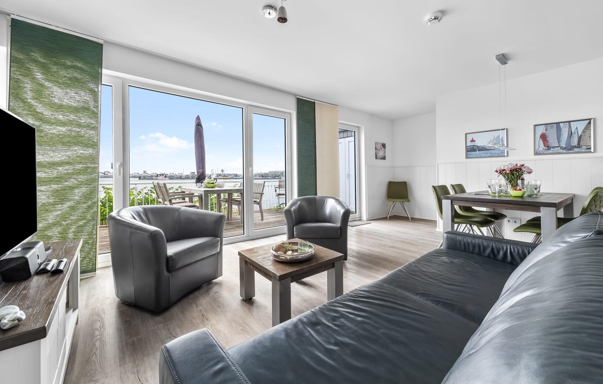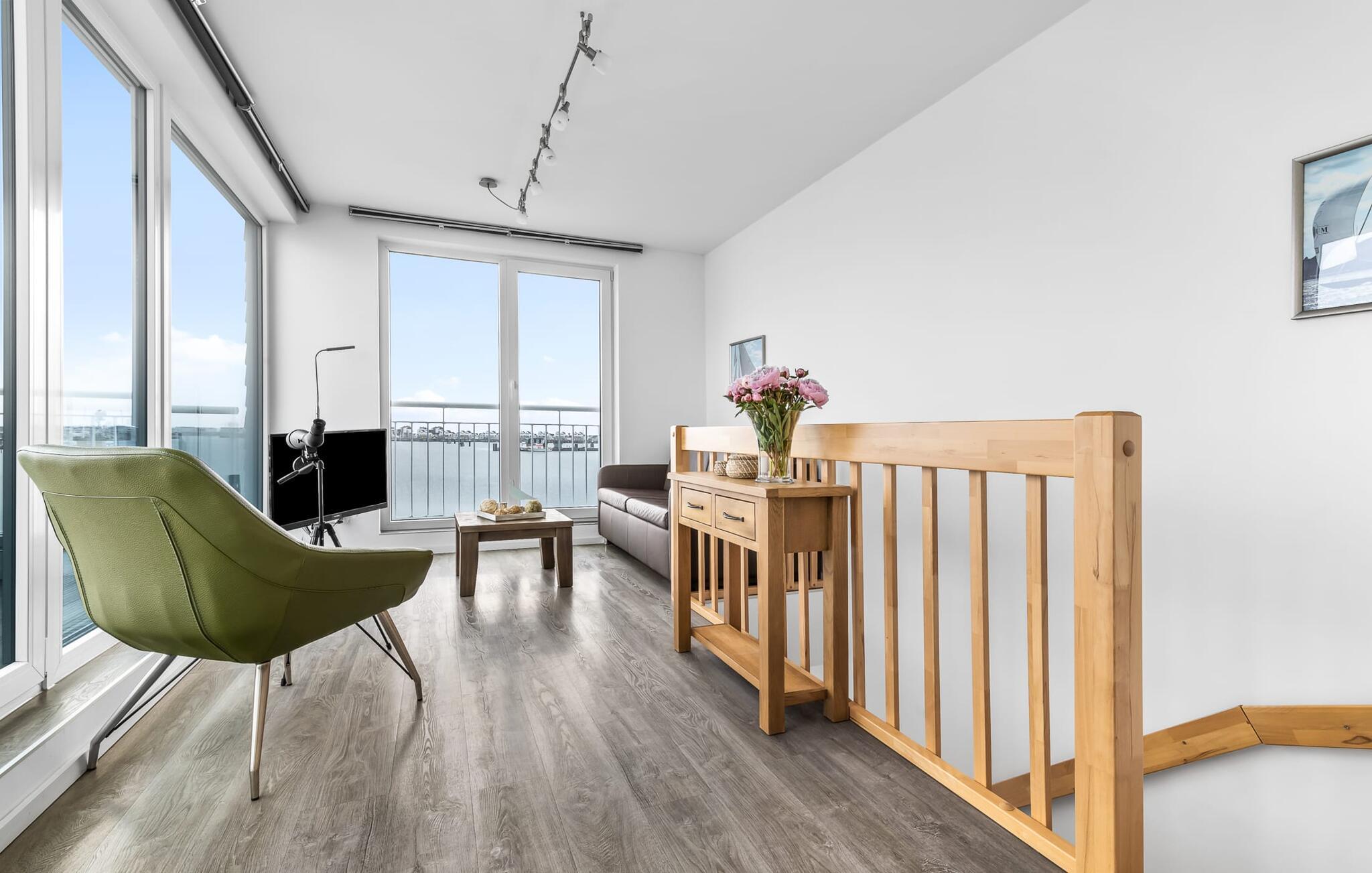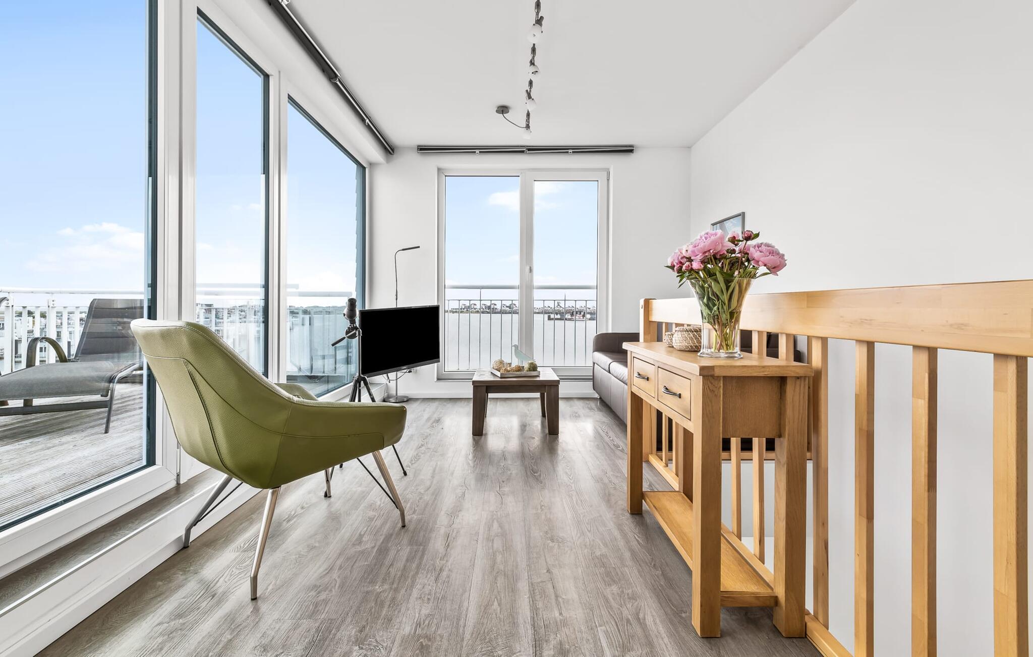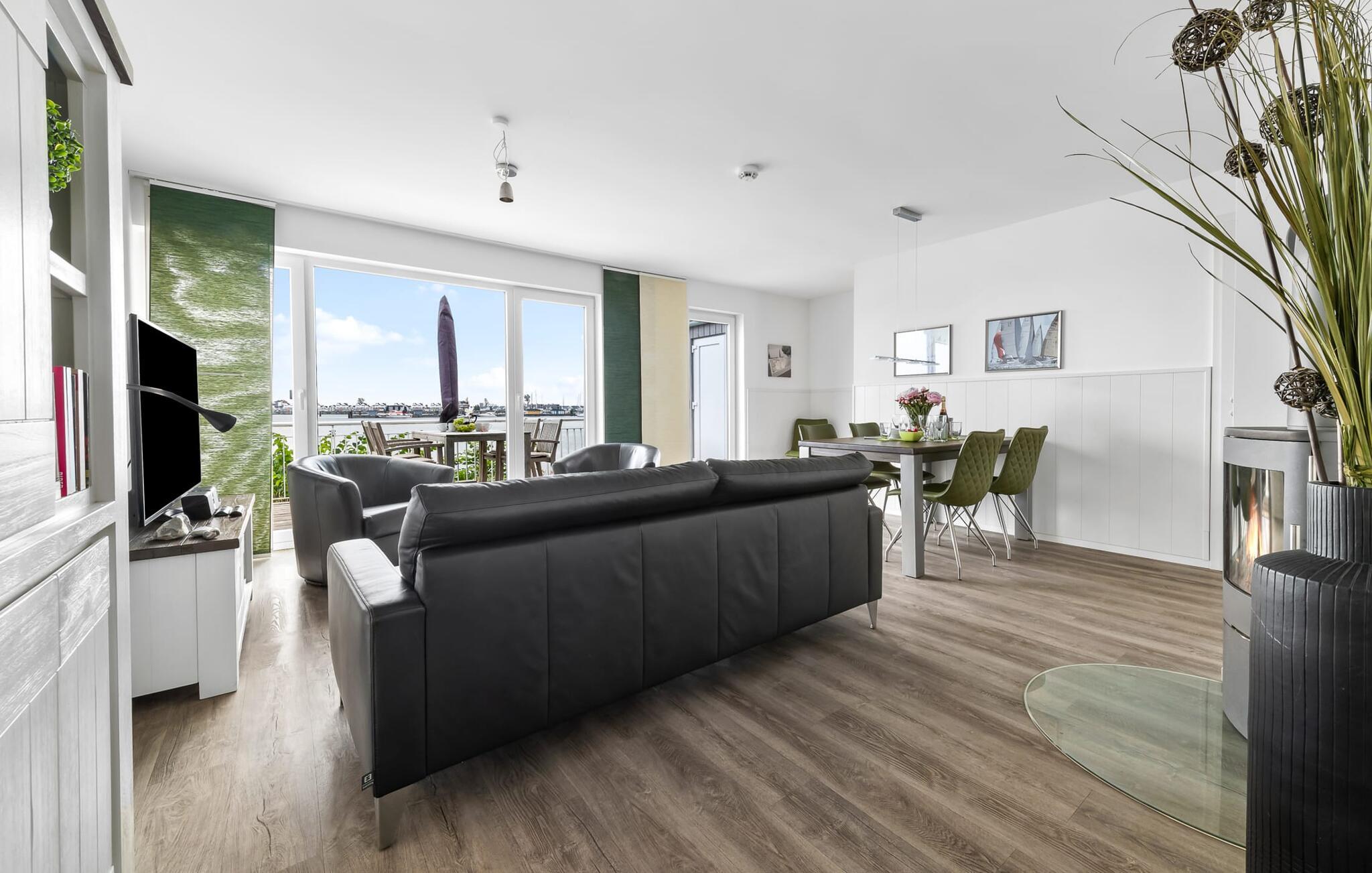 Denne moderne ferielejlighed har en enestående beliggenhed på et smalt næs mellem det beskyttede landskabsområde ved østersøfjorden Slien og sejl- og sportsbådshavnen i Østersøresortet Olpenitz. Vandbeliggenheden overalt, den uhindrede udsigt over Sleien, to terrasser og et privat wellnessområde kendetegner denne ferielejlighed. Ferielejligheden strækker sig over tre plan. I kommer ind i den lyse stueetage i opholdsstuen. Takket være panoramavinduerne fra gulv til loft kan I nyde en fantastisk udsigt over vandet over lystbådehavnen. Den store terrasse med havemøbler af høj kvalitet indbyder til afslappende timer med udsigt til bølgerne og sejlbådene, der passerer forbi. Uanset om det er til en hyggelig grillaften eller slapper af med en bog, får den betagende natur lige foran huset feriehjerter til at banke hurtigere. Stuen/alrummet er meget hyggeligt: På det komfortable siddeområde eller ved det store spisebord sørger den knitrende pejs og gulvvarmen i hele ejendommen for komfort på alle tider af året. Køkkenet er omfattende udstyret og tilbyder fuld feriekomfort. Afslapningsområdet er på første sal: her har to soveværelser plads nok til at genoplade jeres batterier. En af dobbeltsengene kan skubbes fra hinanden for at skabe to enkeltsenge. Også på dette niveau er der et komplet badeværelse med bruser og afslappende boblebadekar til det private wellness-program. Et gæstetoilet i stueetagen giver ekstra komfort. Studiet er på andet niveau, hvor I kan slappe af på en behagelig sovesofa (1,40 x 2,00 m). Her er også udgang til den anden terrasse. Selvom I ikke kan lade arbejdet blive hjemme, er ferielejligheden med højhastighedsinternet og mobil arbejdsstation perfekt til at flytte jeres hjemmekontor til havet. Der er en parkeringsplads lige foran huset. Cykler kan opbevares i vores eget cykelskur lige foran hoveddøren. Vores yndlingssted: At skele til den nedgående sol på tagterrassen... Bemærk venligst, at OstseeResort Olpenitz stadig er under opførelse. På grund byggearbejdet af husene kan udendørsfaciliteterne og bygningstætheden ændre sig og afvige fra de viste billeder. Lejeprisen er allerede beregnet på baggrund af denne byggesituation, hvorfor yderligere rabatter ikke er muligt.