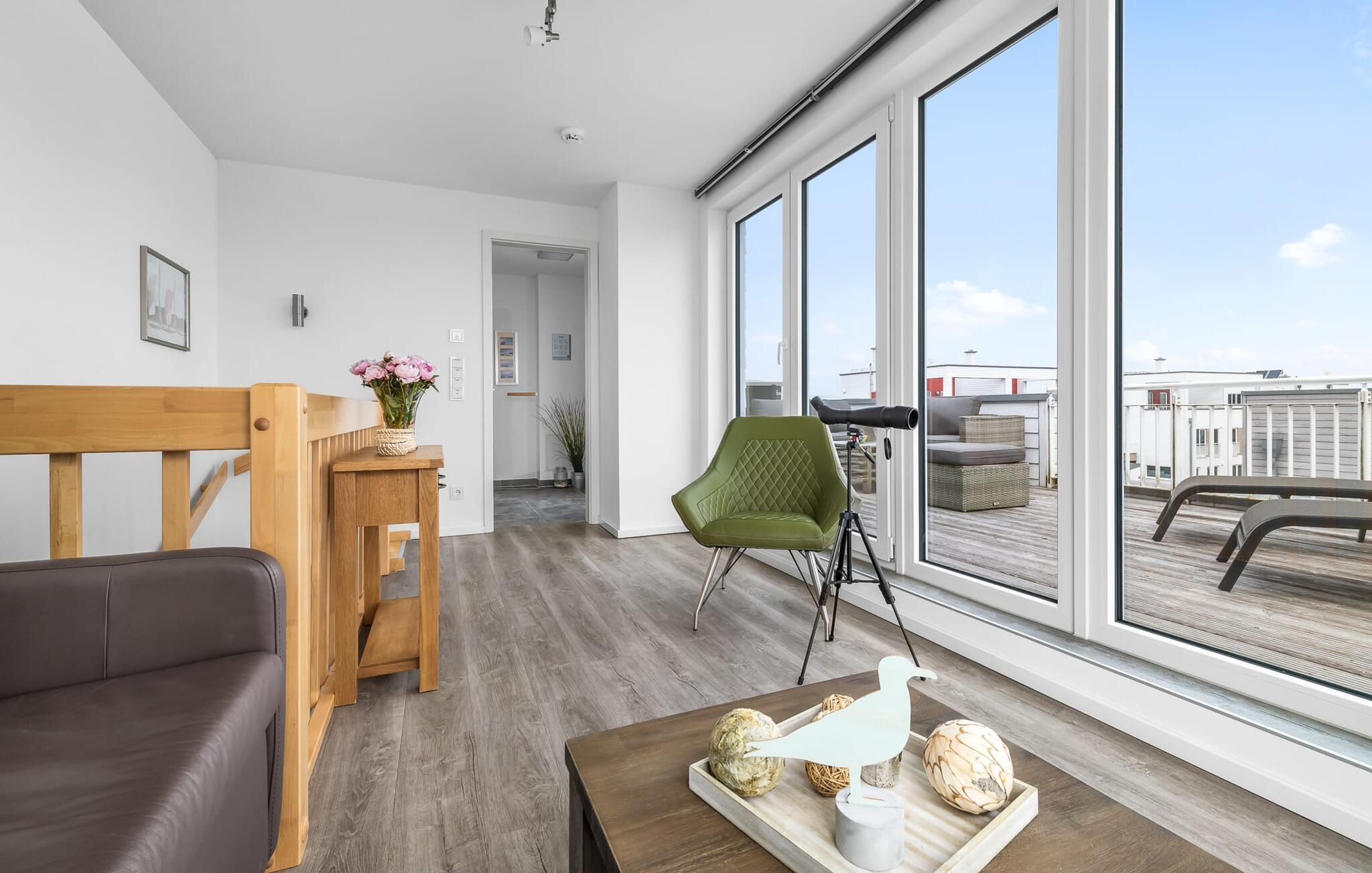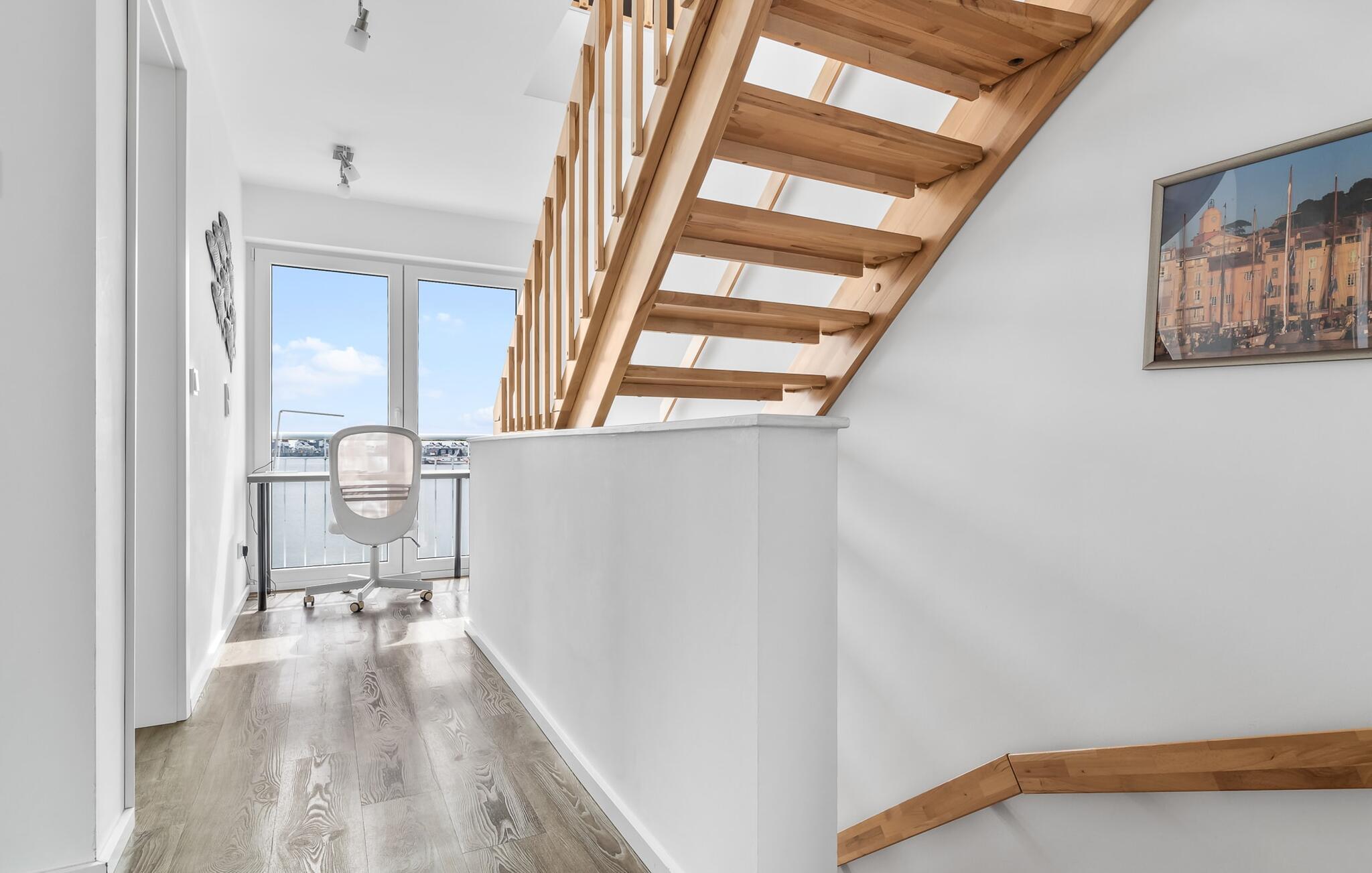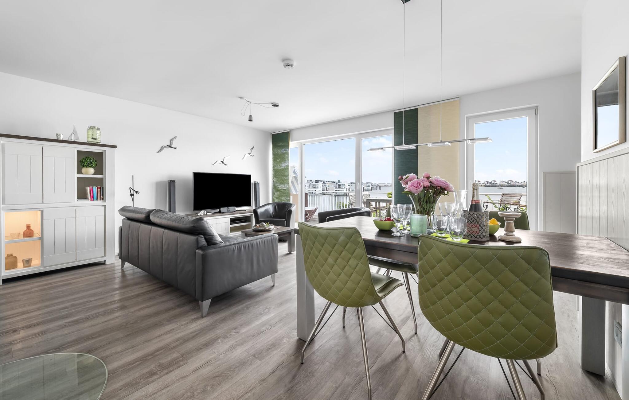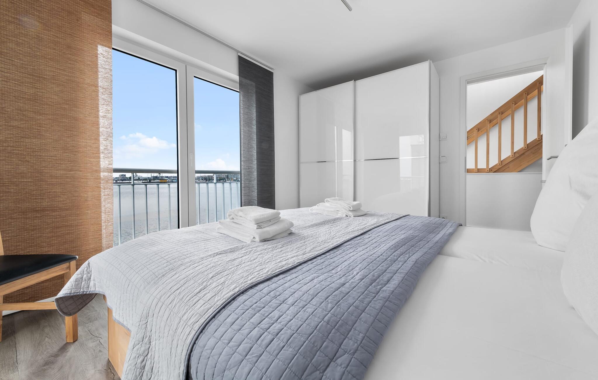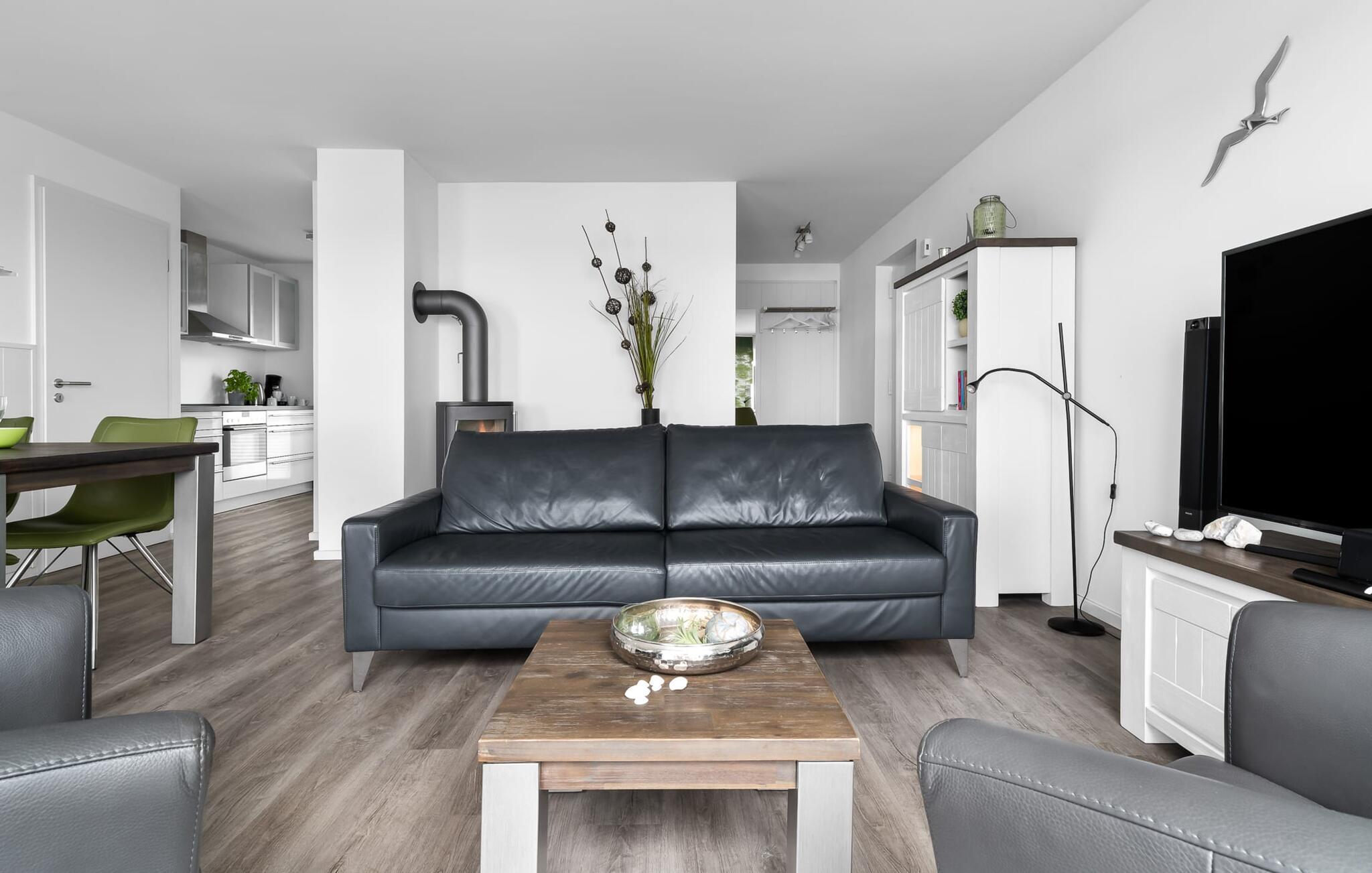 Denne moderne ferielejlighed har en enestående beliggenhed på et smalt næs mellem det beskyttede landskabsområde ved østersøfjorden Slien og sejl- og sportsbådshavnen i Østersøresortet Olpenitz. Vandbeliggenheden overalt, den uhindrede udsigt over Sleien, to terrasser og et privat wellnessområde kendetegner denne ferielejlighed. Ferielejligheden strækker sig over tre plan. I kommer ind i den lyse stueetage i opholdsstuen. Takket være panoramavinduerne fra gulv til loft kan I nyde en fantastisk udsigt over vandet over lystbådehavnen. Den store terrasse med havemøbler af høj kvalitet indbyder til afslappende timer med udsigt til bølgerne og sejlbådene, der passerer forbi. Uanset om det er til en hyggelig grillaften eller slapper af med en bog, får den betagende natur lige foran huset feriehjerter til at banke hurtigere. Stuen/alrummet er meget hyggeligt: På det komfortable siddeområde eller ved det store spisebord sørger den knitrende pejs og gulvvarmen i hele ejendommen for komfort på alle tider af året. Køkkenet er omfattende udstyret og tilbyder fuld feriekomfort. Afslapningsområdet er på første sal: her har to soveværelser plads nok til at genoplade jeres batterier. En af dobbeltsengene kan skubbes fra hinanden for at skabe to enkeltsenge. Også på dette niveau er der et komplet badeværelse med bruser og afslappende boblebadekar til det private wellness-program. Et gæstetoilet i stueetagen giver ekstra komfort. Studiet er på andet niveau, hvor I kan slappe af på en behagelig sovesofa (1,40 x 2,00 m). Her er også udgang til den anden terrasse. Selvom I ikke kan lade arbejdet blive hjemme, er ferielejligheden med højhastighedsinternet og mobil arbejdsstation perfekt til at flytte jeres hjemmekontor til havet. Der er en parkeringsplads lige foran huset. Cykler kan opbevares i vores eget cykelskur lige foran hoveddøren. Vores yndlingssted: At skele til den nedgående sol på tagterrassen... Bemærk venligst, at OstseeResort Olpenitz stadig er under opførelse. På grund byggearbejdet af husene kan udendørsfaciliteterne og bygningstætheden ændre sig og afvige fra de viste billeder. Lejeprisen er allerede beregnet på baggrund af denne byggesituation, hvorfor yderligere rabatter ikke er muligt.