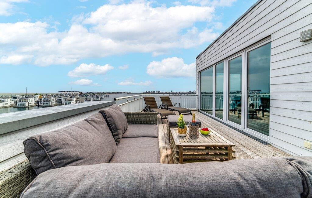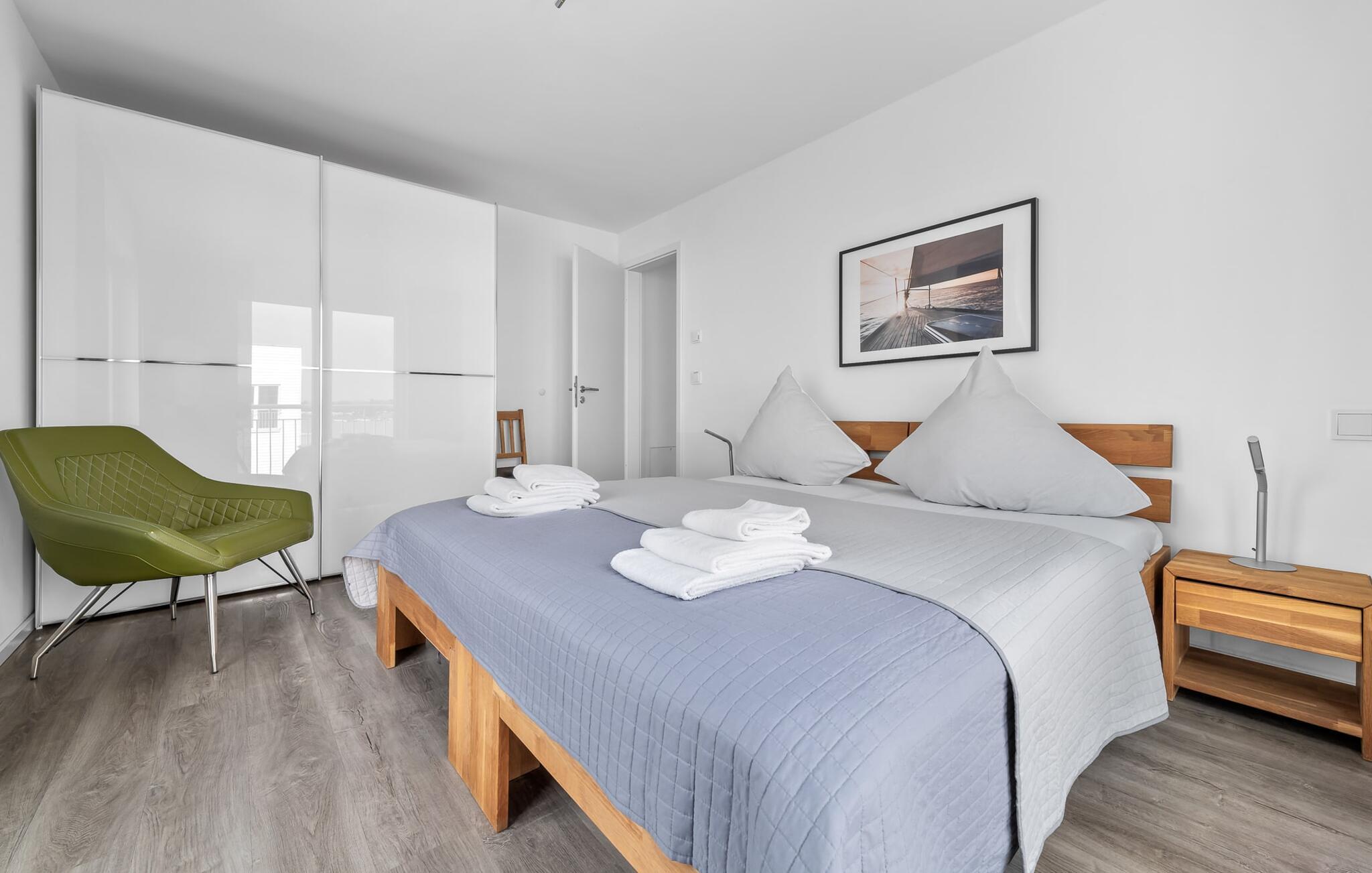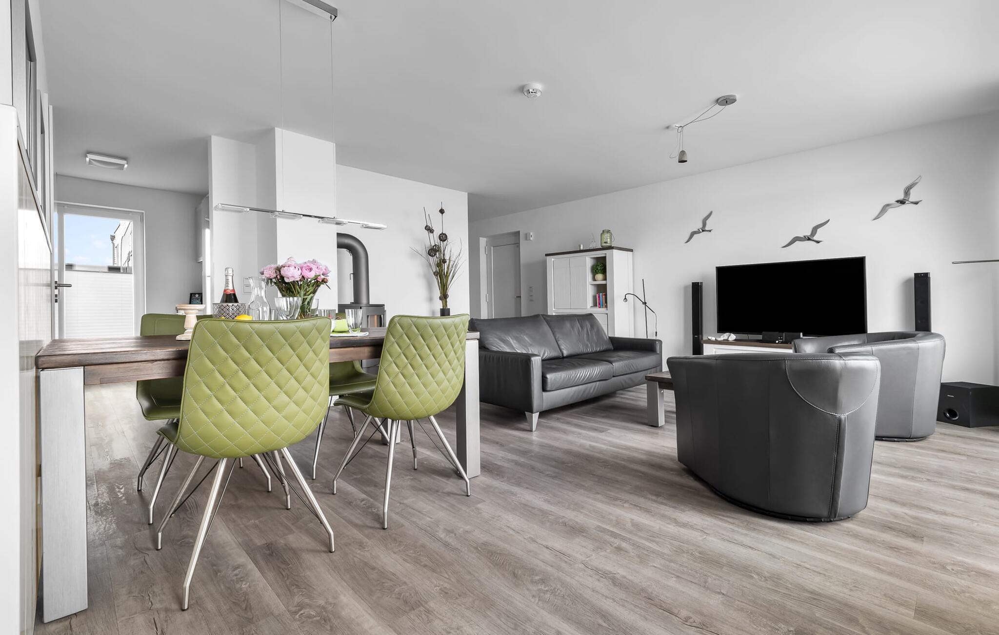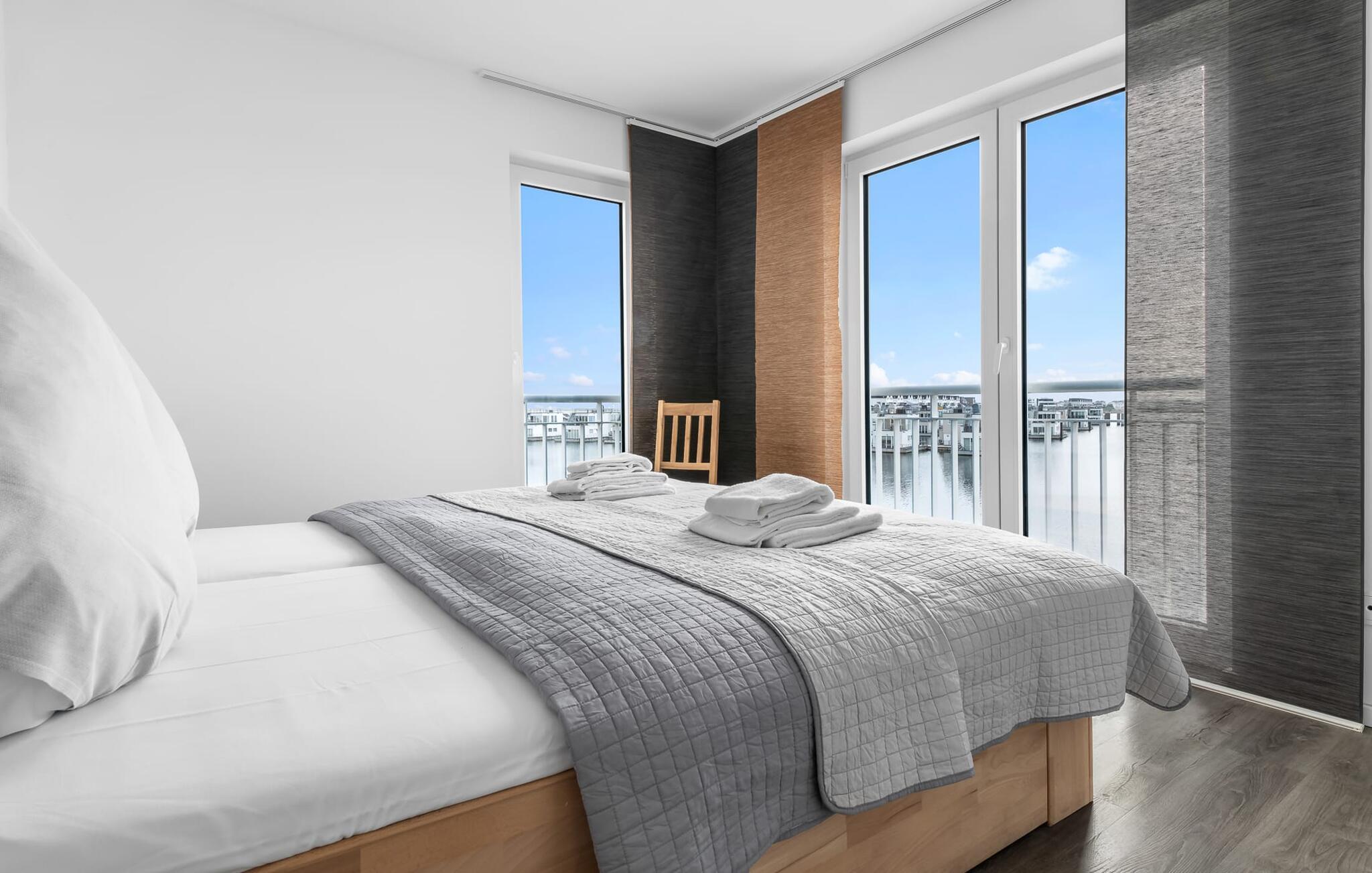 Denne moderne ferielejlighed har en enestående beliggenhed på et smalt næs mellem det beskyttede landskabsområde ved østersøfjorden Slien og sejl- og sportsbådshavnen i Østersøresortet Olpenitz. Vandbeliggenheden overalt, den uhindrede udsigt over Sleien, to terrasser og et privat wellnessområde kendetegner denne ferielejlighed. Ferielejligheden strækker sig over tre plan. I kommer ind i den lyse stueetage i opholdsstuen. Takket være panoramavinduerne fra gulv til loft kan I nyde en fantastisk udsigt over vandet over lystbådehavnen. Den store terrasse med havemøbler af høj kvalitet indbyder til afslappende timer med udsigt til bølgerne og sejlbådene, der passerer forbi. Uanset om det er til en hyggelig grillaften eller slapper af med en bog, får den betagende natur lige foran huset feriehjerter til at banke hurtigere. Stuen/alrummet er meget hyggeligt: På det komfortable siddeområde eller ved det store spisebord sørger den knitrende pejs og gulvvarmen i hele ejendommen for komfort på alle tider af året. Køkkenet er omfattende udstyret og tilbyder fuld feriekomfort. Afslapningsområdet er på første sal: her har to soveværelser plads nok til at genoplade jeres batterier. En af dobbeltsengene kan skubbes fra hinanden for at skabe to enkeltsenge. Også på dette niveau er der et komplet badeværelse med bruser og afslappende boblebadekar til det private wellness-program. Et gæstetoilet i stueetagen giver ekstra komfort. Studiet er på andet niveau, hvor I kan slappe af på en behagelig sovesofa (1,40 x 2,00 m). Her er også udgang til den anden terrasse. Selvom I ikke kan lade arbejdet blive hjemme, er ferielejligheden med højhastighedsinternet og mobil arbejdsstation perfekt til at flytte jeres hjemmekontor til havet. Der er en parkeringsplads lige foran huset. Cykler kan opbevares i vores eget cykelskur lige foran hoveddøren. Vores yndlingssted: At skele til den nedgående sol på tagterrassen... Bemærk venligst, at OstseeResort Olpenitz stadig er under opførelse. På grund byggearbejdet af husene kan udendørsfaciliteterne og bygningstætheden ændre sig og afvige fra de viste billeder. Lejeprisen er allerede beregnet på baggrund af denne byggesituation, hvorfor yderligere rabatter ikke er muligt.
