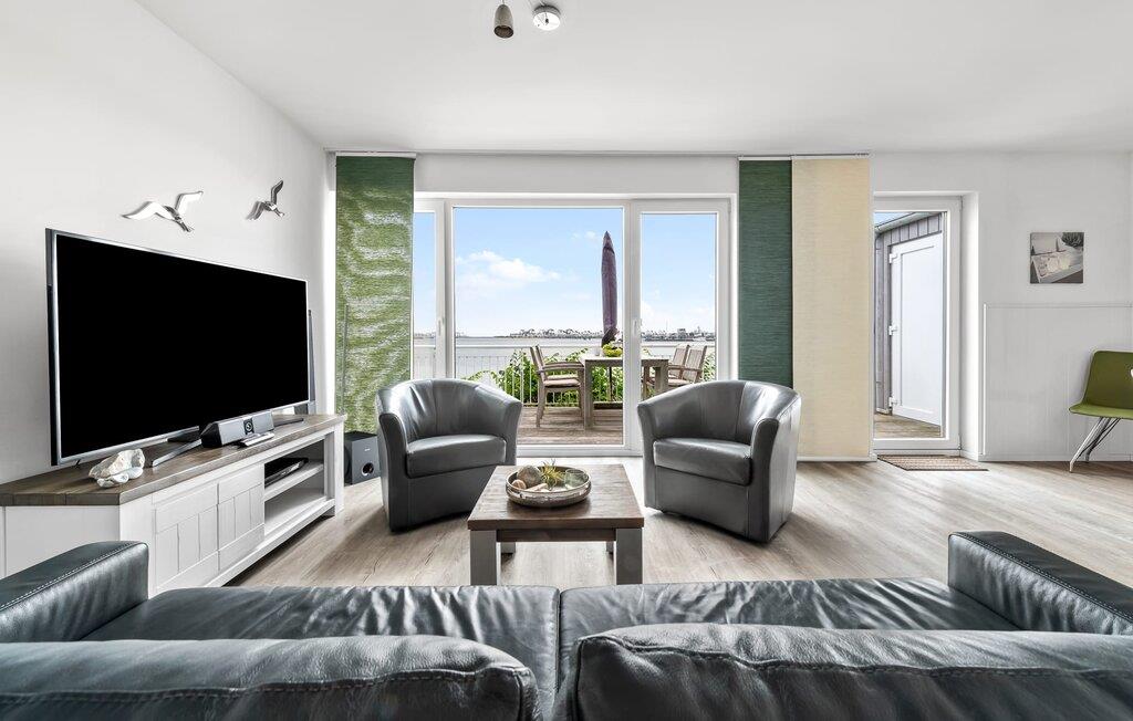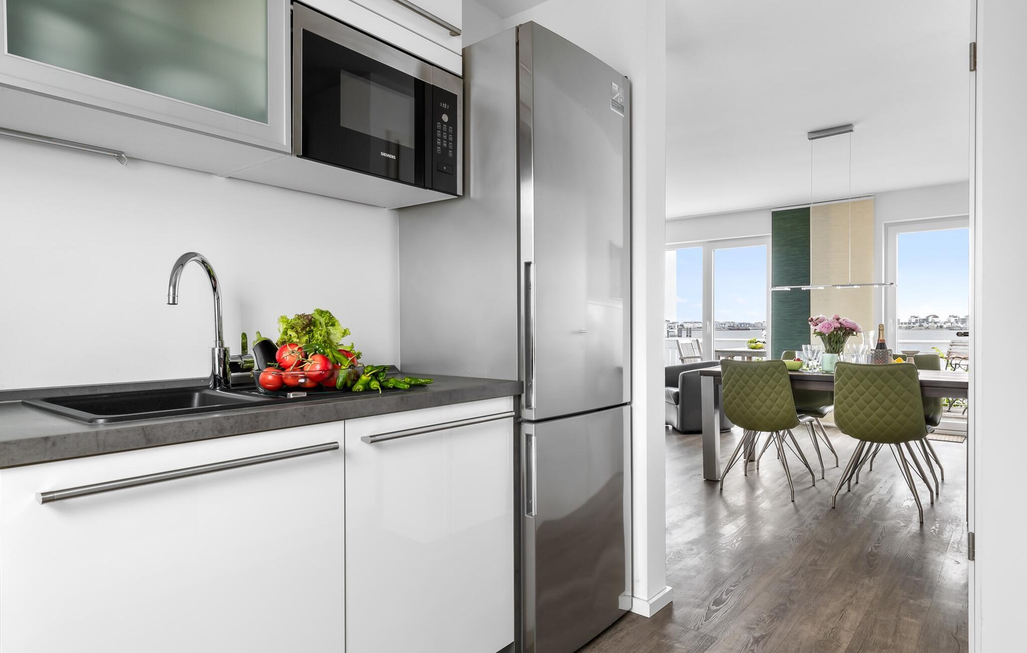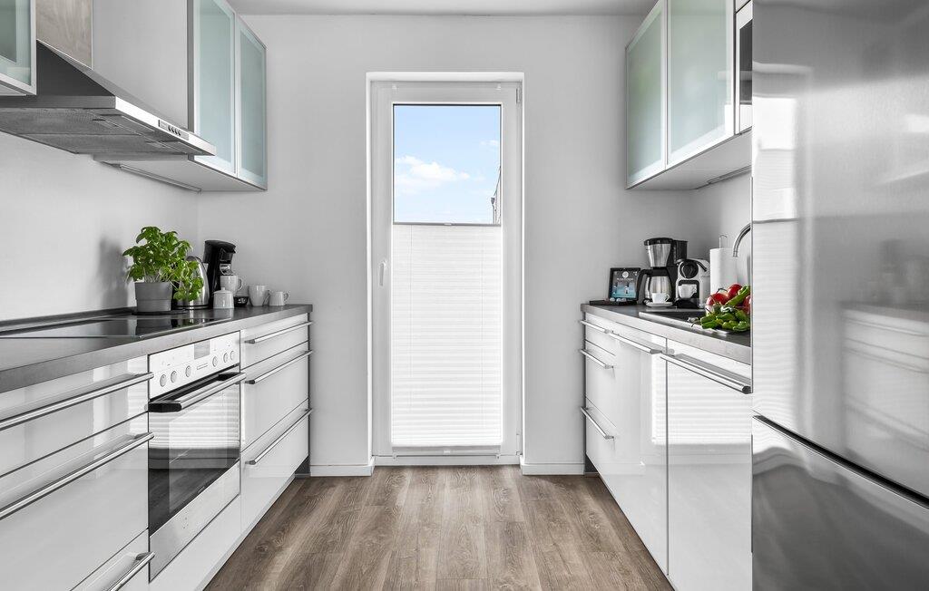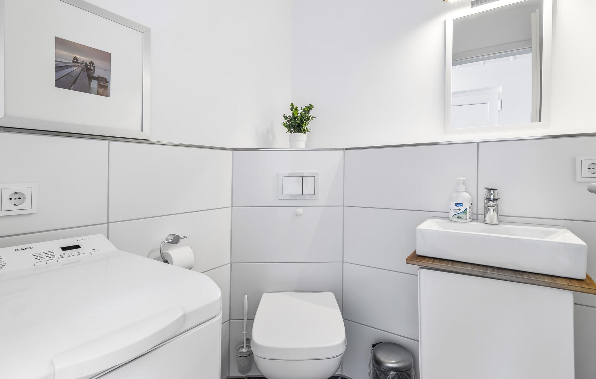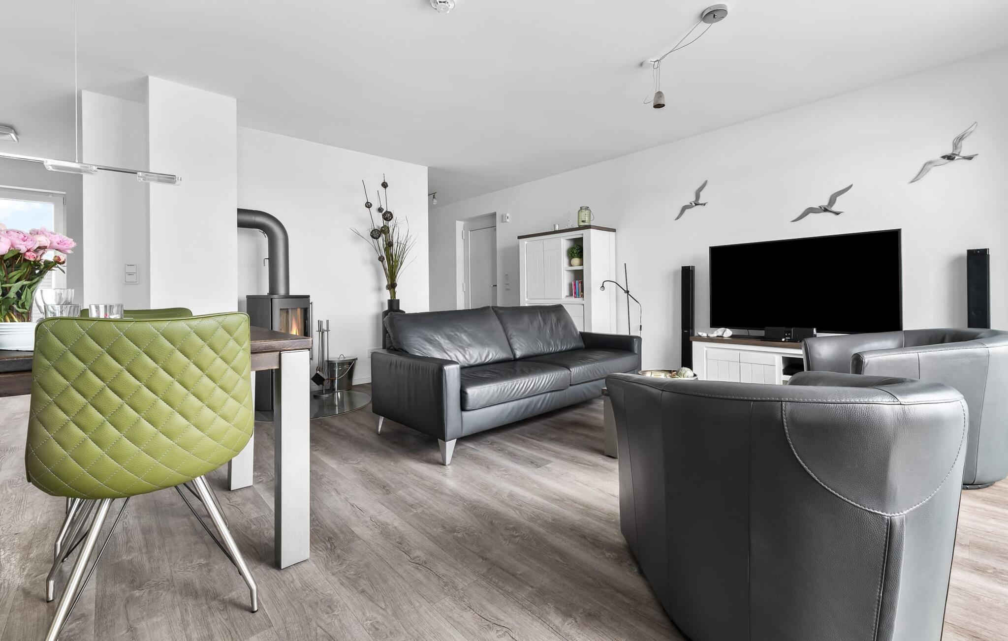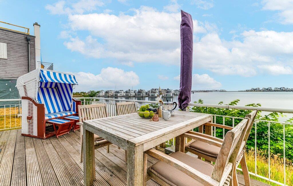 Denne moderne ferielejlighed har en enestående beliggenhed på et smalt næs mellem det beskyttede landskabsområde ved østersøfjorden Slien og sejl- og sportsbådshavnen i Østersøresortet Olpenitz. Vandbeliggenheden overalt, den uhindrede udsigt over Sleien, to terrasser og et privat wellnessområde kendetegner denne ferielejlighed. Ferielejligheden strækker sig over tre plan. I kommer ind i den lyse stueetage i opholdsstuen. Takket være panoramavinduerne fra gulv til loft kan I nyde en fantastisk udsigt over vandet over lystbådehavnen. Den store terrasse med havemøbler af høj kvalitet indbyder til afslappende timer med udsigt til bølgerne og sejlbådene, der passerer forbi. Uanset om det er til en hyggelig grillaften eller slapper af med en bog, får den betagende natur lige foran huset feriehjerter til at banke hurtigere. Stuen/alrummet er meget hyggeligt: På det komfortable siddeområde eller ved det store spisebord sørger den knitrende pejs og gulvvarmen i hele ejendommen for komfort på alle tider af året. Køkkenet er omfattende udstyret og tilbyder fuld feriekomfort. Afslapningsområdet er på første sal: her har to soveværelser plads nok til at genoplade jeres batterier. En af dobbeltsengene kan skubbes fra hinanden for at skabe to enkeltsenge. Også på dette niveau er der et komplet badeværelse med bruser og afslappende boblebadekar til det private wellness-program. Et gæstetoilet i stueetagen giver ekstra komfort. Studiet er på andet niveau, hvor I kan slappe af på en behagelig sovesofa (1,40 x 2,00 m). Her er også udgang til den anden terrasse. Selvom I ikke kan lade arbejdet blive hjemme, er ferielejligheden med højhastighedsinternet og mobil arbejdsstation perfekt til at flytte jeres hjemmekontor til havet. Der er en parkeringsplads lige foran huset. Cykler kan opbevares i vores eget cykelskur lige foran hoveddøren. Vores yndlingssted: At skele til den nedgående sol på tagterrassen... Bemærk venligst, at OstseeResort Olpenitz stadig er under opførelse. På grund byggearbejdet af husene kan udendørsfaciliteterne og bygningstætheden ændre sig og afvige fra de viste billeder. Lejeprisen er allerede beregnet på baggrund af denne byggesituation, hvorfor yderligere rabatter ikke er muligt.