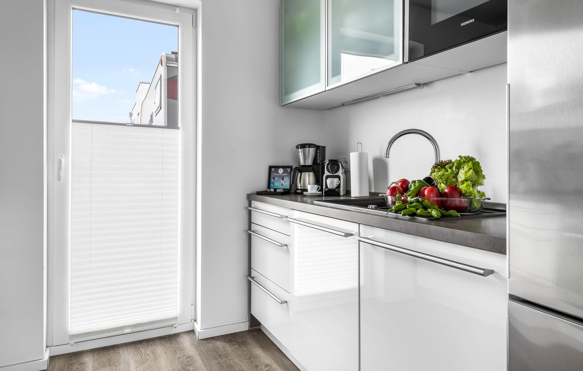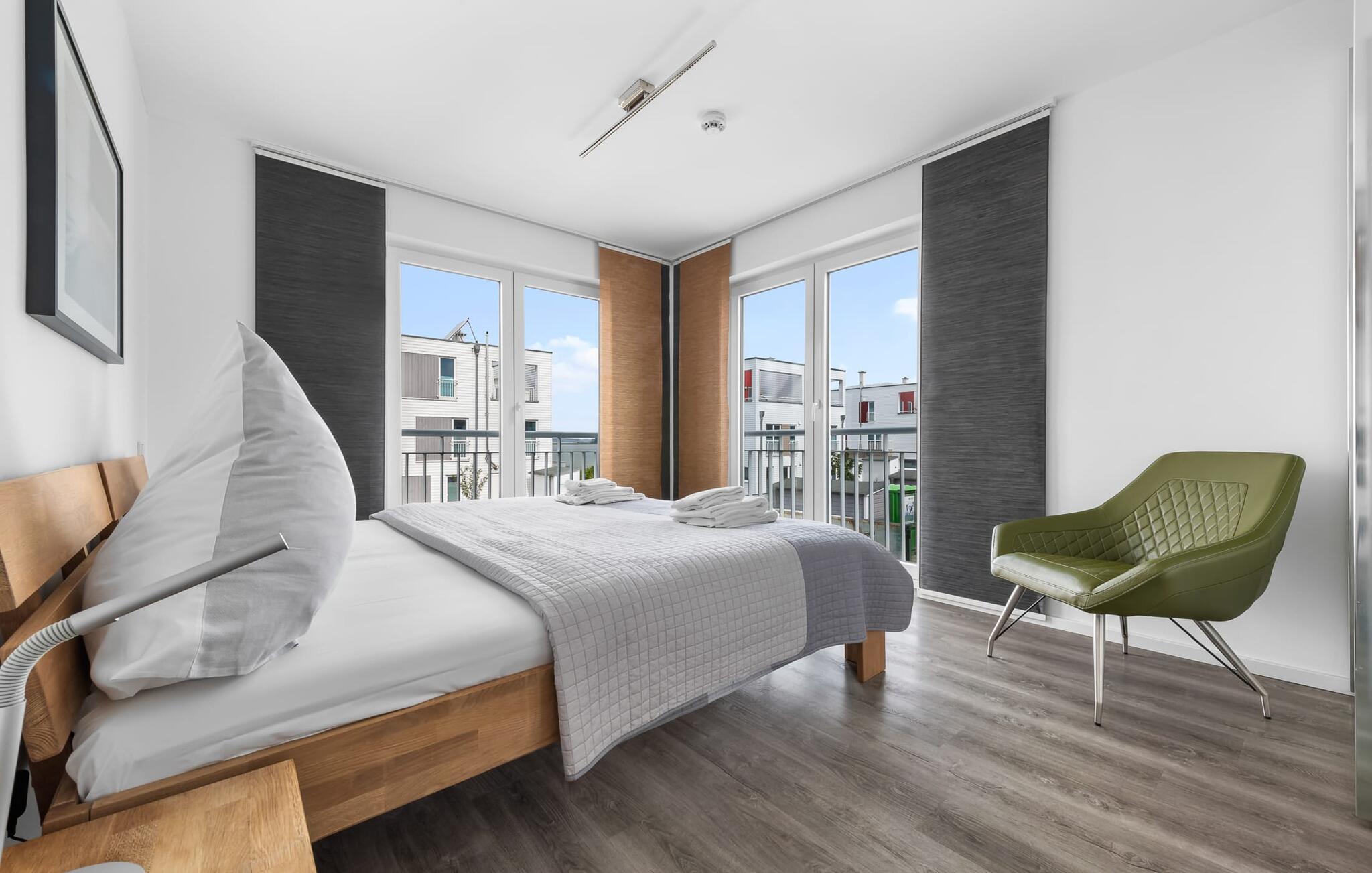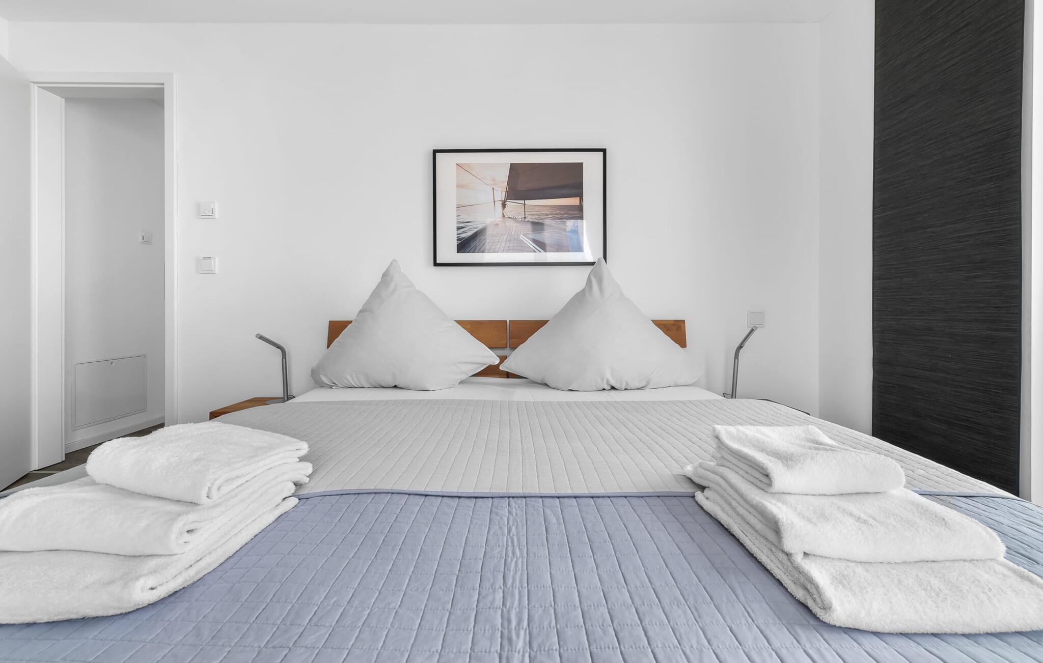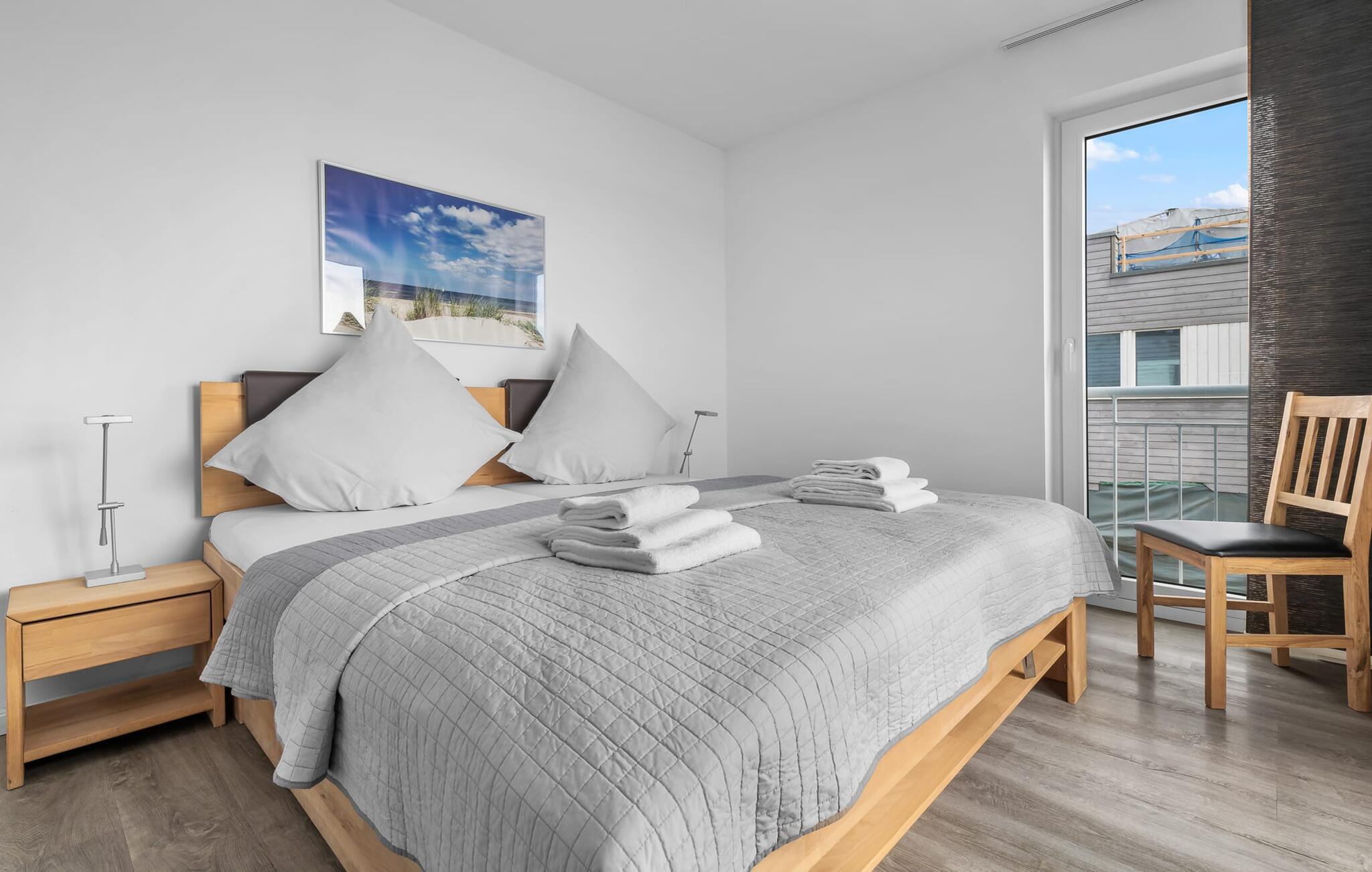 Denne moderne ferielejlighed har en enestående beliggenhed på et smalt næs mellem det beskyttede landskabsområde ved østersøfjorden Slien og sejl- og sportsbådshavnen i Østersøresortet Olpenitz. Vandbeliggenheden overalt, den uhindrede udsigt over Sleien, to terrasser og et privat wellnessområde kendetegner denne ferielejlighed. Ferielejligheden strækker sig over tre plan. I kommer ind i den lyse stueetage i opholdsstuen. Takket være panoramavinduerne fra gulv til loft kan I nyde en fantastisk udsigt over vandet over lystbådehavnen. Den store terrasse med havemøbler af høj kvalitet indbyder til afslappende timer med udsigt til bølgerne og sejlbådene, der passerer forbi. Uanset om det er til en hyggelig grillaften eller slapper af med en bog, får den betagende natur lige foran huset feriehjerter til at banke hurtigere. Stuen/alrummet er meget hyggeligt: På det komfortable siddeområde eller ved det store spisebord sørger den knitrende pejs og gulvvarmen i hele ejendommen for komfort på alle tider af året. Køkkenet er omfattende udstyret og tilbyder fuld feriekomfort. Afslapningsområdet er på første sal: her har to soveværelser plads nok til at genoplade jeres batterier. En af dobbeltsengene kan skubbes fra hinanden for at skabe to enkeltsenge. Også på dette niveau er der et komplet badeværelse med bruser og afslappende boblebadekar til det private wellness-program. Et gæstetoilet i stueetagen giver ekstra komfort. Studiet er på andet niveau, hvor I kan slappe af på en behagelig sovesofa (1,40 x 2,00 m). Her er også udgang til den anden terrasse. Selvom I ikke kan lade arbejdet blive hjemme, er ferielejligheden med højhastighedsinternet og mobil arbejdsstation perfekt til at flytte jeres hjemmekontor til havet. Der er en parkeringsplads lige foran huset. Cykler kan opbevares i vores eget cykelskur lige foran hoveddøren. Vores yndlingssted: At skele til den nedgående sol på tagterrassen... Bemærk venligst, at OstseeResort Olpenitz stadig er under opførelse. På grund byggearbejdet af husene kan udendørsfaciliteterne og bygningstætheden ændre sig og afvige fra de viste billeder. Lejeprisen er allerede beregnet på baggrund af denne byggesituation, hvorfor yderligere rabatter ikke er muligt.
