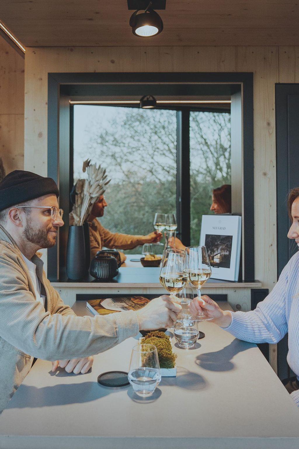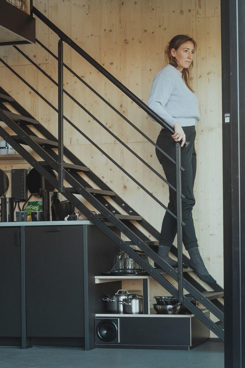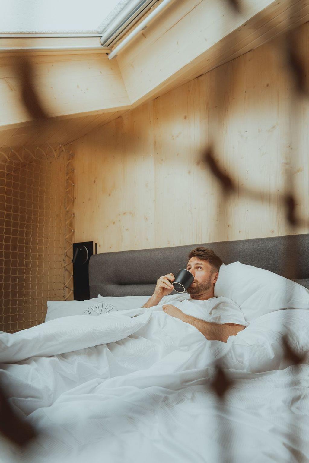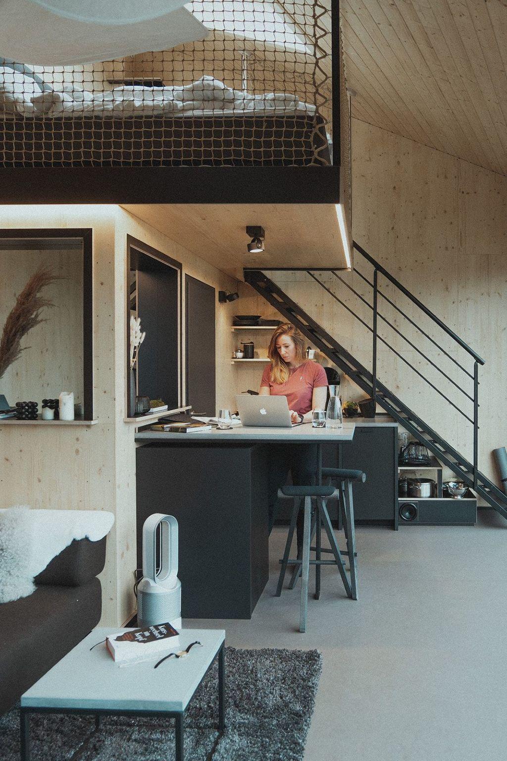 The double bed is located on a sleeping loft. There is a large skylight directly above the bed so that you can marvel at the starry sky at night.