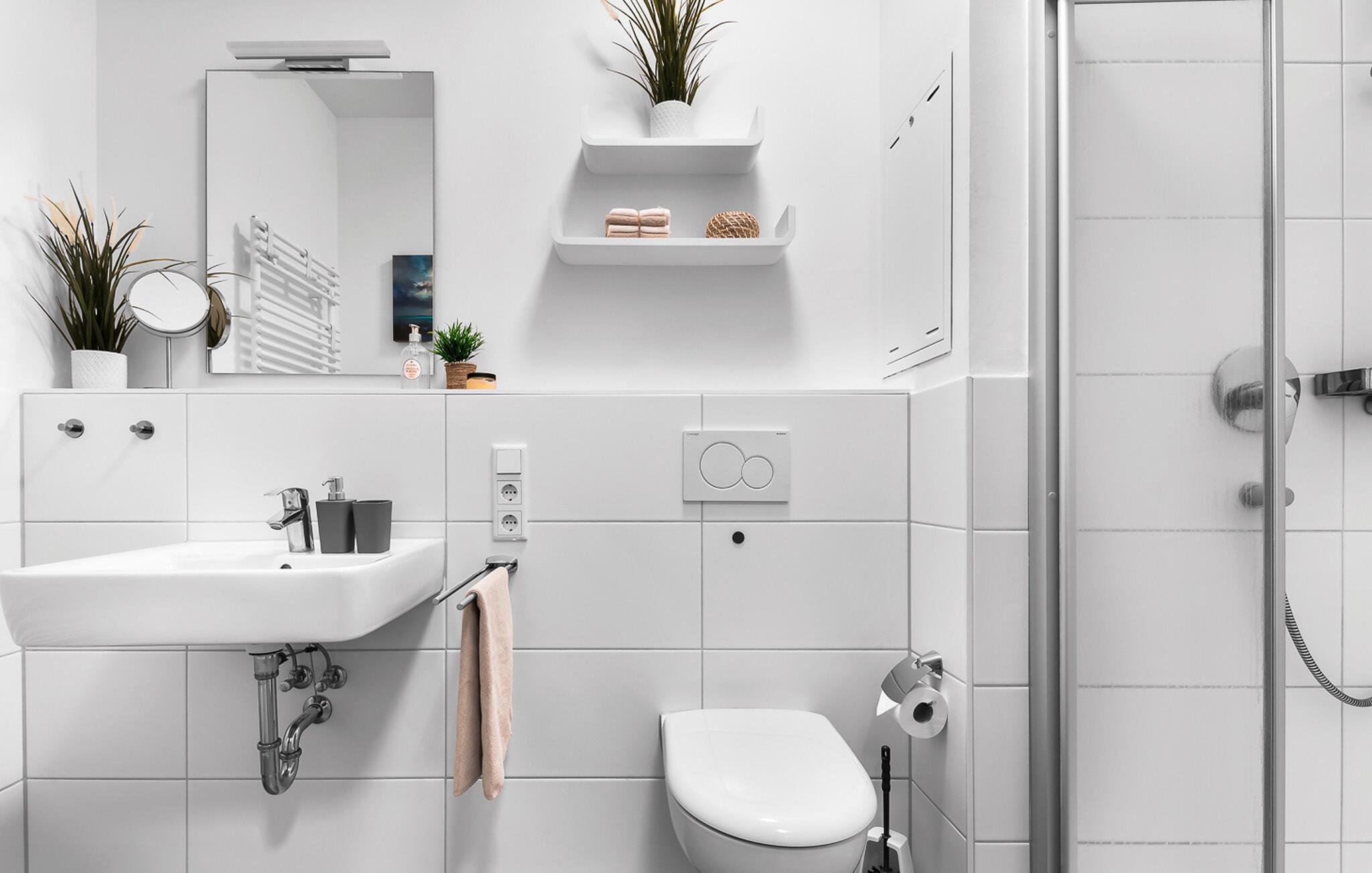 For wellness-elskere: Det moderne badeværelse er udstyret med både et brusebad i gulvniveau og sin egen lille infrarøde varmekabine.