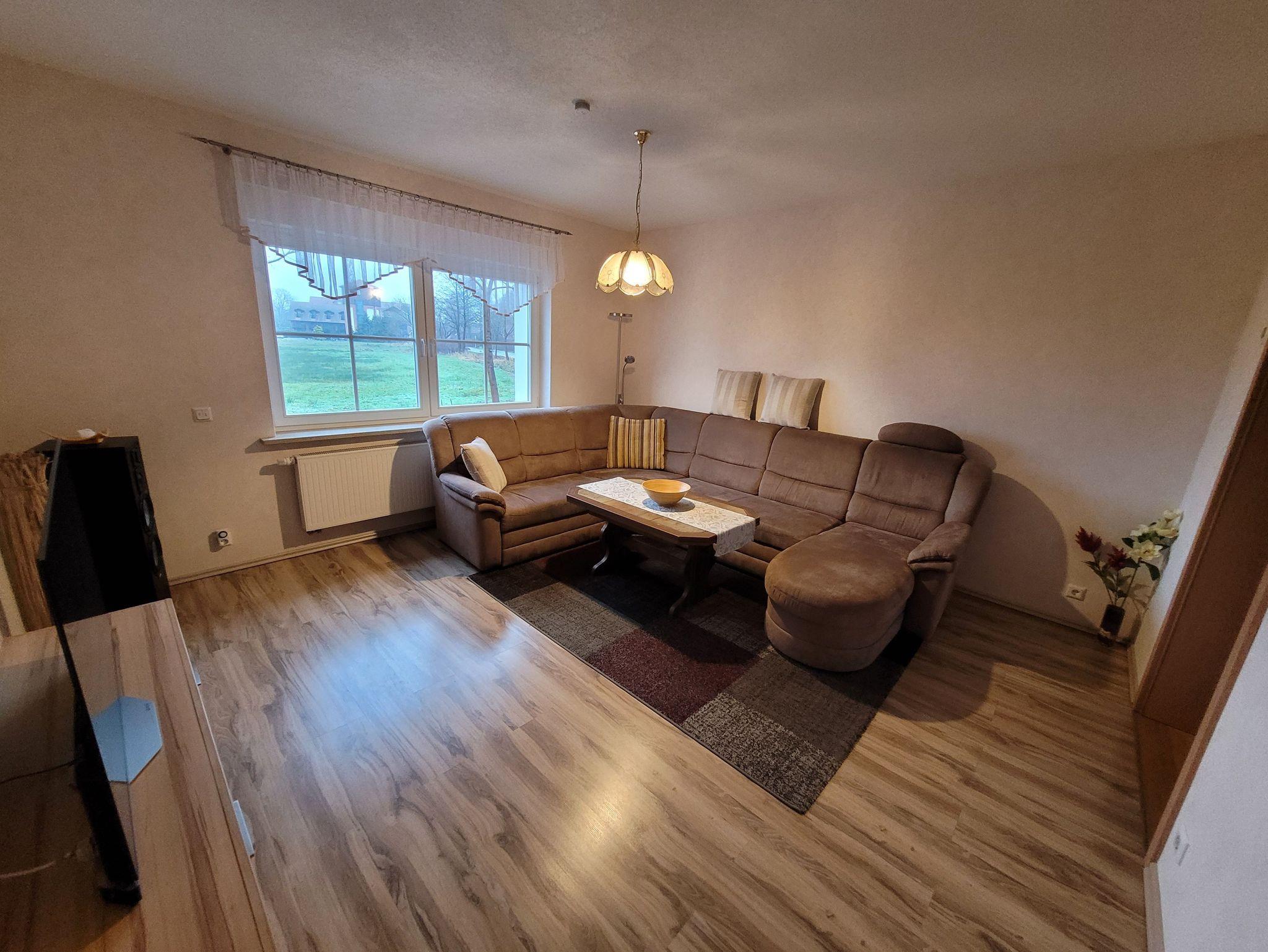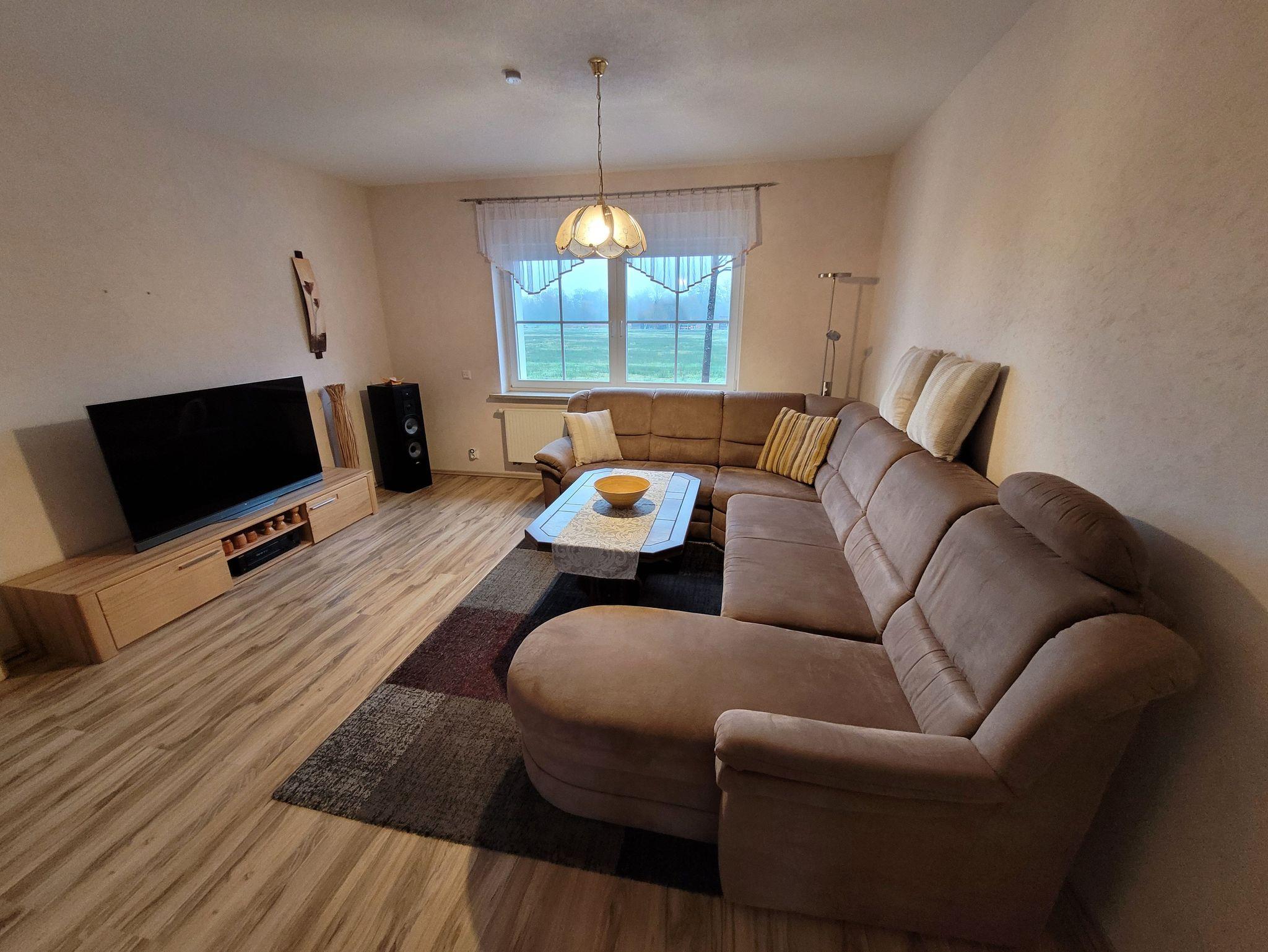 1 Wohnzimmer mit großen TV ,Radio und einer Wohnlandschaft mit Ottomane u. Relax und Schlaffunktion