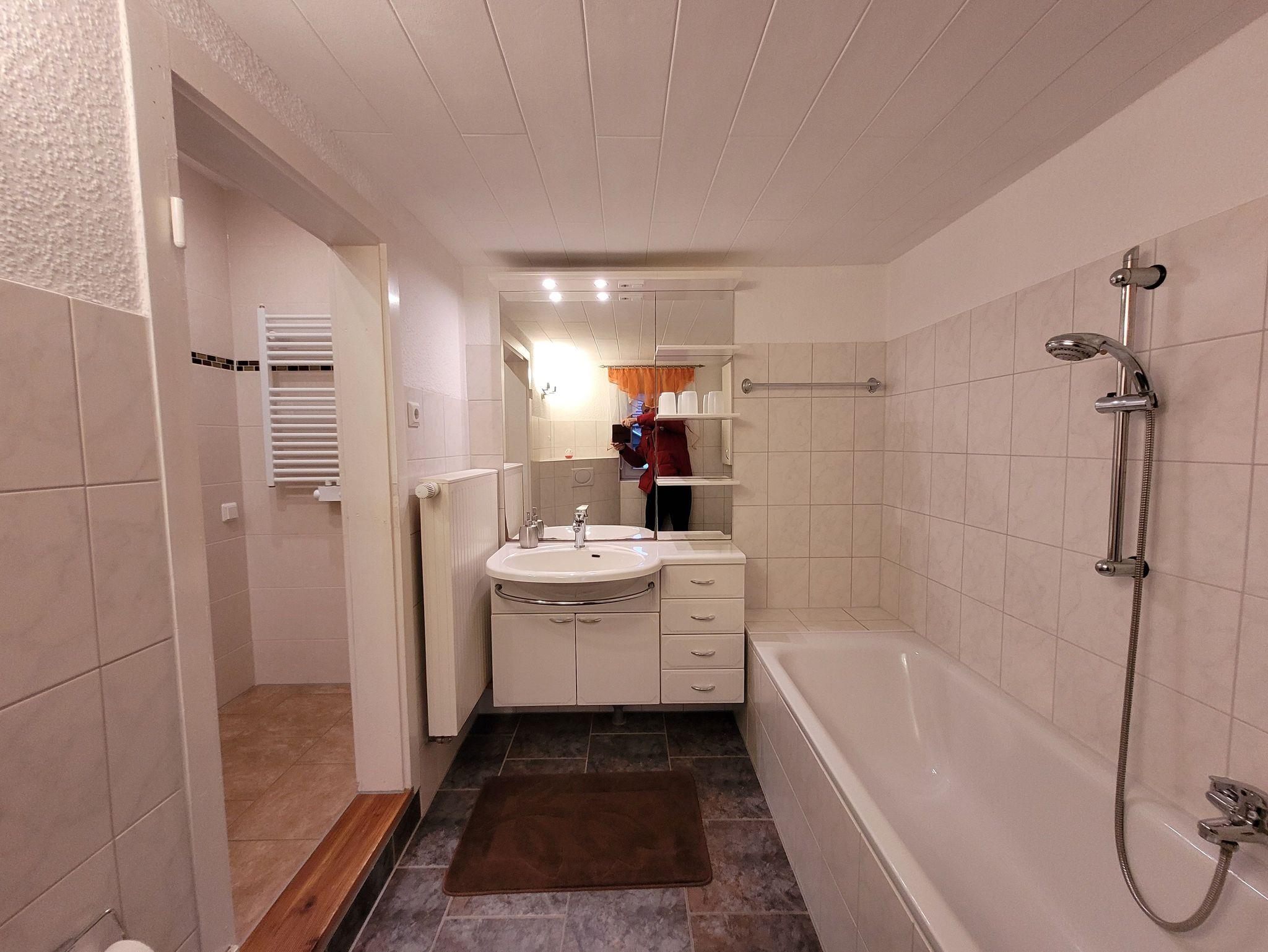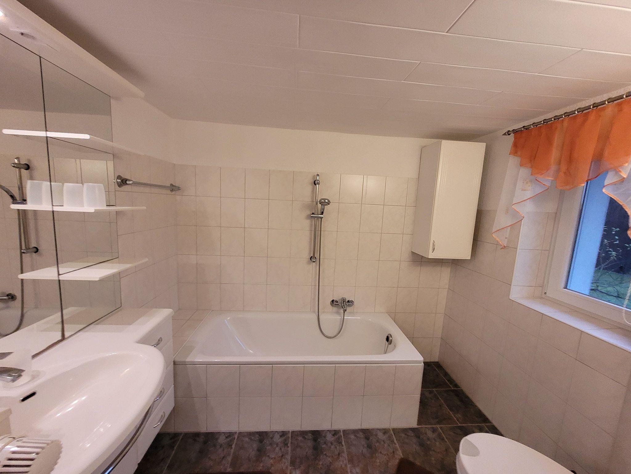 1 Badezimmer mit Anbauwand ,WC, Badewanne und Dusche