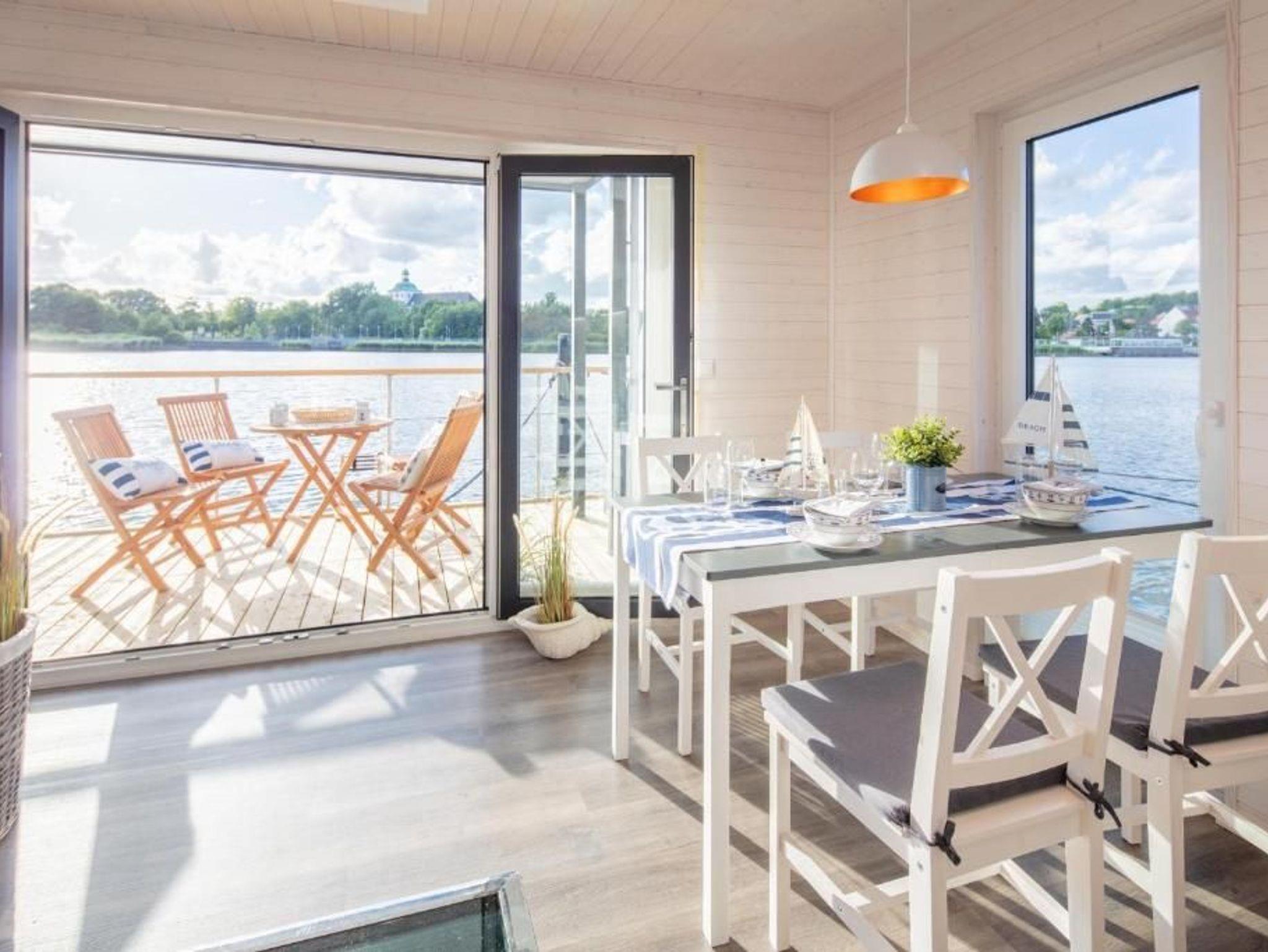 Dieses geräumige festliegende Hausboot bietet Ihnen den ganzen Komfort einer modernen und hochwertigen Ferienwohnung mit Sonnen- und Dachterrasse. Im gemütlichen lichtdurchfluteten Wohnraum mit offener Küche lässt es sich entspannt auf der Couch und im Sessel verweilen oder Sie kommen am großzügigen Tisch zu einem leckeren Essen oder Spieleabend zusammen. Durch ein Fischbodenfenster mit Beleuchtung kann man abends die Fischwelt beobachten.