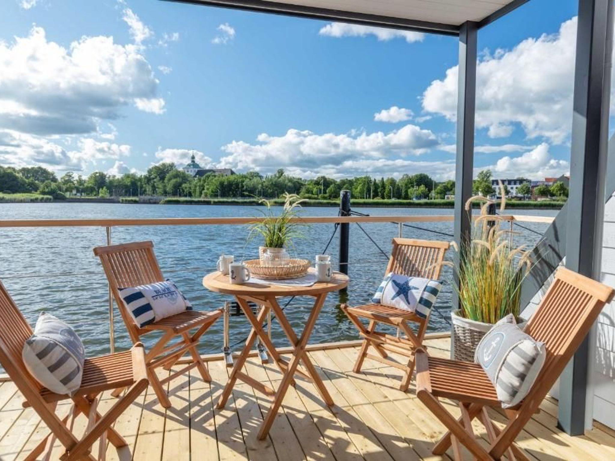 Auf dem großzügigen Oberdeck hat man einen atemberaubenden Rundumblick auf Schleswig und den Ostseefjord Schlei mit dem Naturschutzgebiet Möweninsel. Machen Sie es sich in der kuscheligen Lounge-Ecke oder im gemütlichen XL-Strandkorb bequem und lassen Sie mit Blick aufs Wasser die Seele baumeln. Im unteren Bereich bietet eine überdachte Terrasse mit Holztisch und Stühlen einen herrlichem Blick auf die Schlei und Schleswig. Hier kann man bei Sonnenaufgang das Frühstück genießen und gut in den Tag starten. Abends genießen Sie in vorderster Reihe ganz exklusiv das maritime Flair mit einem Sundowner.