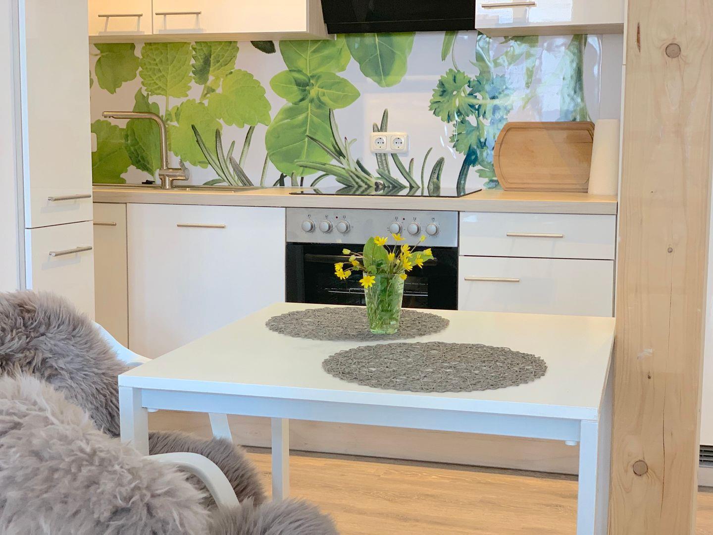 Die neuwertige Küchenzeile ist optisch durch eine Nische leicht von dem Wohn/Schlafbereich abgegrenzt und bieten auf kleinstem Bereich einen hohen Komfort, wie Mikrowelle, Kühl-Gefrierkombi und sogar einem Mini-Geschirrspüler.