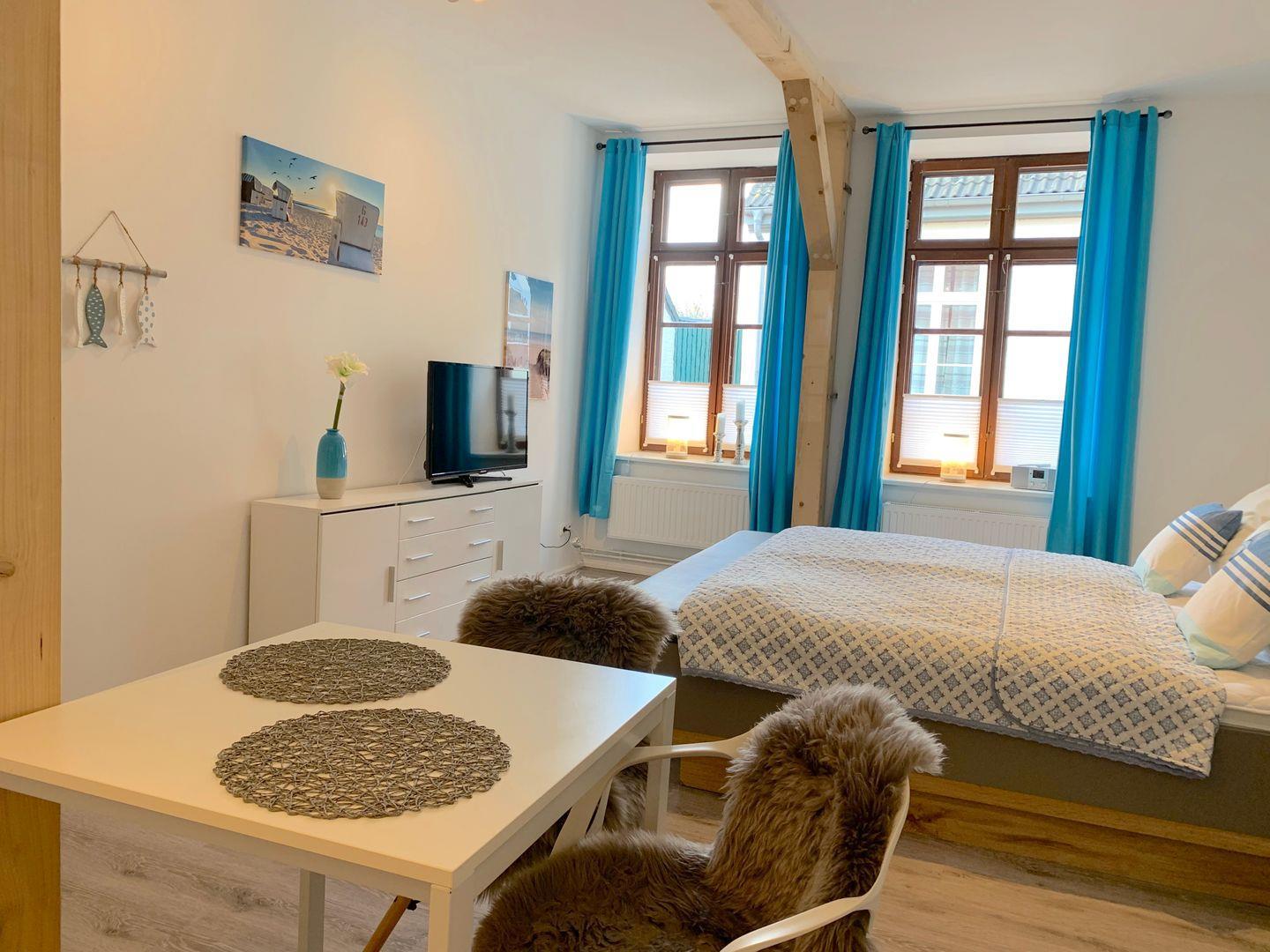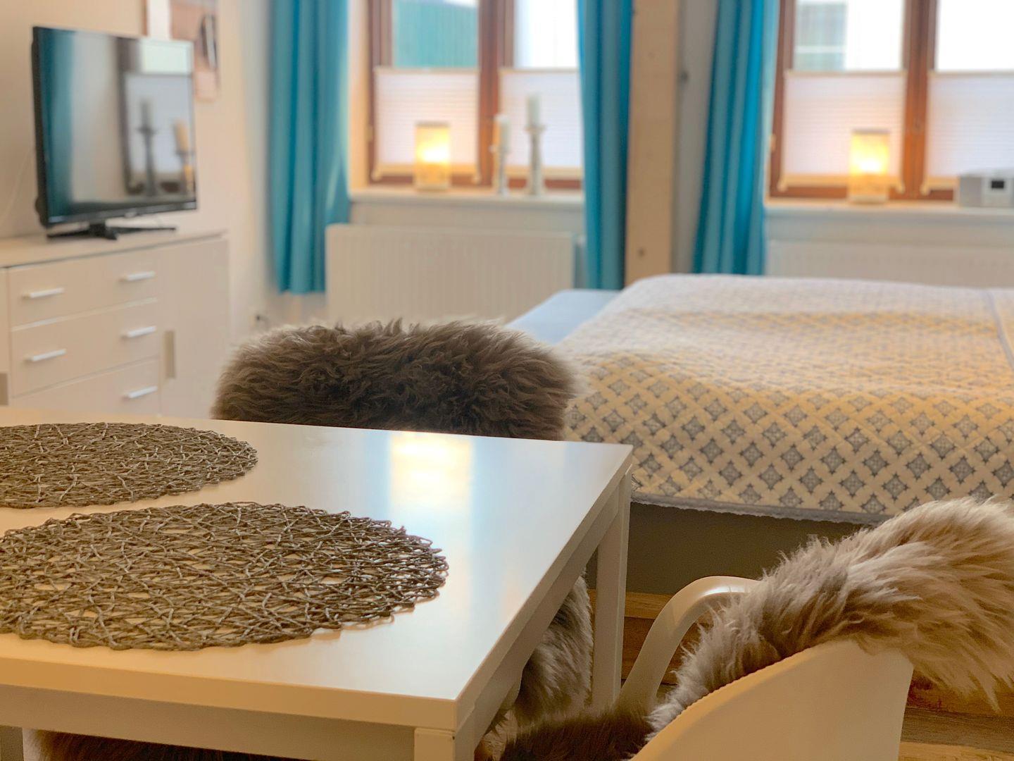 Der helle, freundliche Wohn-Schlaf-Raum ist geschmackvoll eingerichtet. Das Doppelbett sorgt für eine erholsame Nacht.