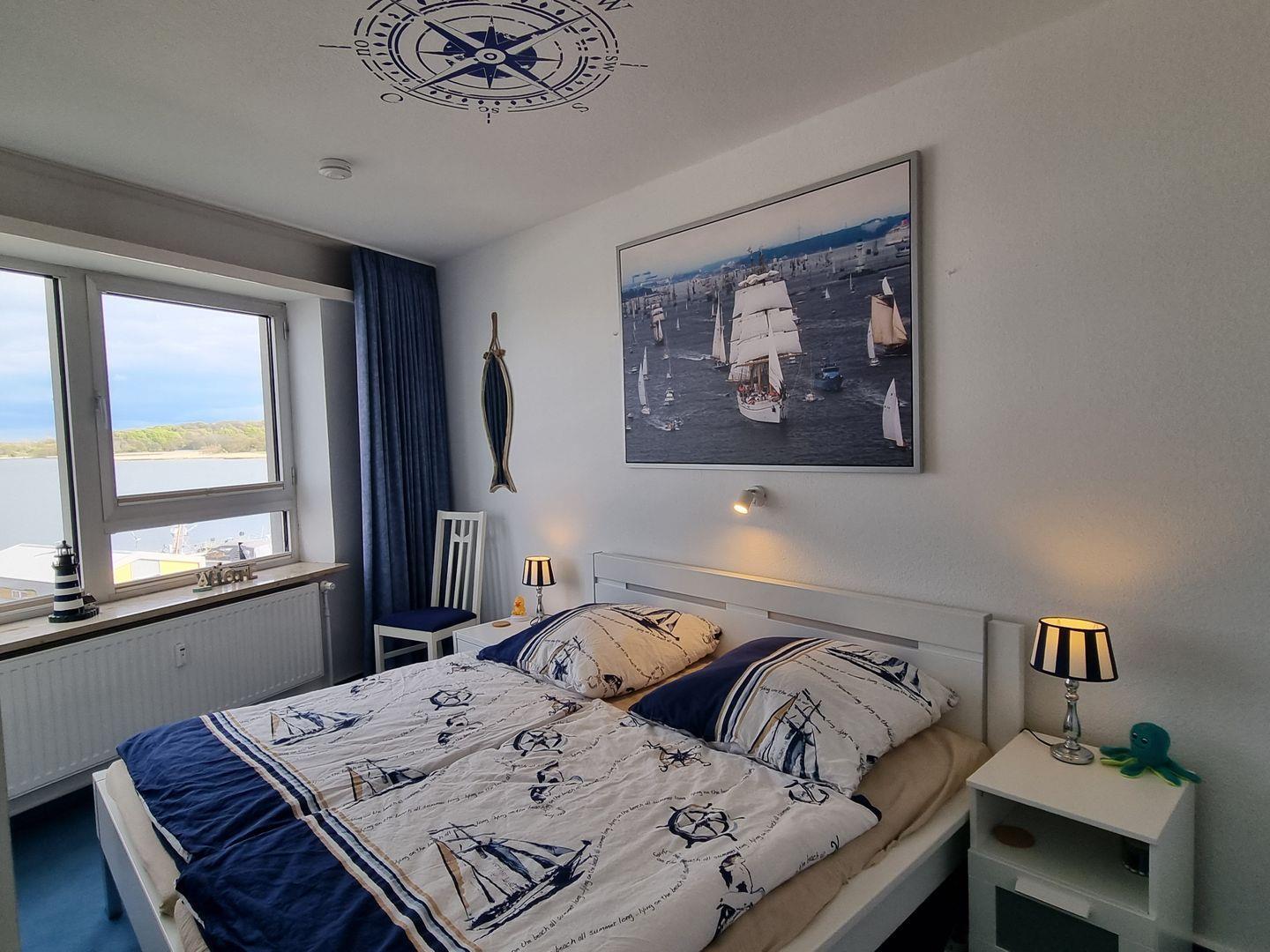 Auch das Schlafzimmer mit seinem großzügigen Doppelbett bietet einen freien Blick auf die Schlei.