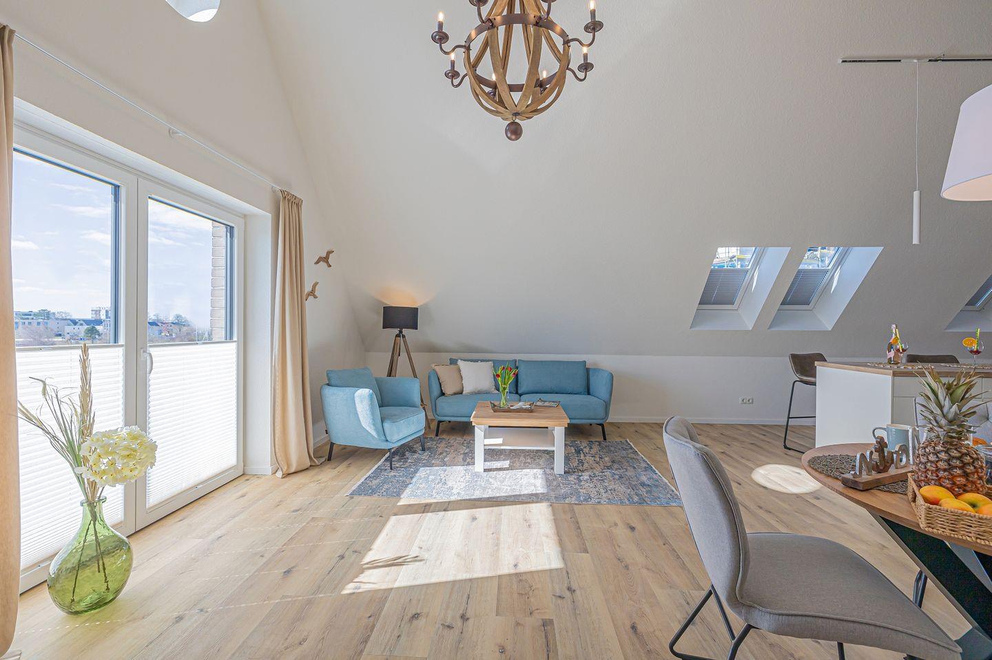 Mit direktem Wasserblick und in einzigartiger Lage direkt an der Schlei bietet die „Fjord-Koje 8“ am Pionierhafen Schleswig den perfekten Ort für Ihren Urlaub. Die Ferienwohnung bietet auf ca. 66m² einen offenen Wohn- und Essbereich mit Küche und Schlafbereich, ein Badezimmer und einen Balkon. Die vollausgestattete Küche lässt keine Wünsche offen und im Wohnzimmer können Sie Ihre Urlaubstage auf dem Sofa vor dem Smart-TV ausklingen lassen. Diesen können Sie bei Bedarf so drehen, dass Sie vom Bett aus fernsehen können. Der Schlafbereich bietet ein gemütliches Doppelbett (180x200cm) sowie Verdunklungsmöglichkeiten für erholsame Nächte. In dem Badezimmer finden Sie einen Föhn und eine fast ebenerdige Dusche vor. Auf dem Balkon können Sie sich entspannen und an lauen Abenden Ihre Urlaubstage ausklingen lassen. Ein eigener Parkplatz steht Ihnen direkt vor dem Haus zur Verfügung. Ihre Fahrräder können Sie im offenen gemeinschaftlich genutzten Fahrradraum unterstellen. Im Erdgeschoss steht eine Waschmaschine zur gemeinschaftlichen Nutzung kostenfrei für Sie zur Verfügung. Am Pionierhafen wird Wert auf Nachhaltigkeit gelegt, daher wird 77 % der Energie durch Erdwärme bezogen. Durch die einzigartige Lage am Ostseefjord Schlei kann auch ein Boot mitgebracht und auf einem Liegeplatz gegen Gebühr direkt am Pionierhafen angelegt werden. Bitte sprechen Sie uns hierfür an.