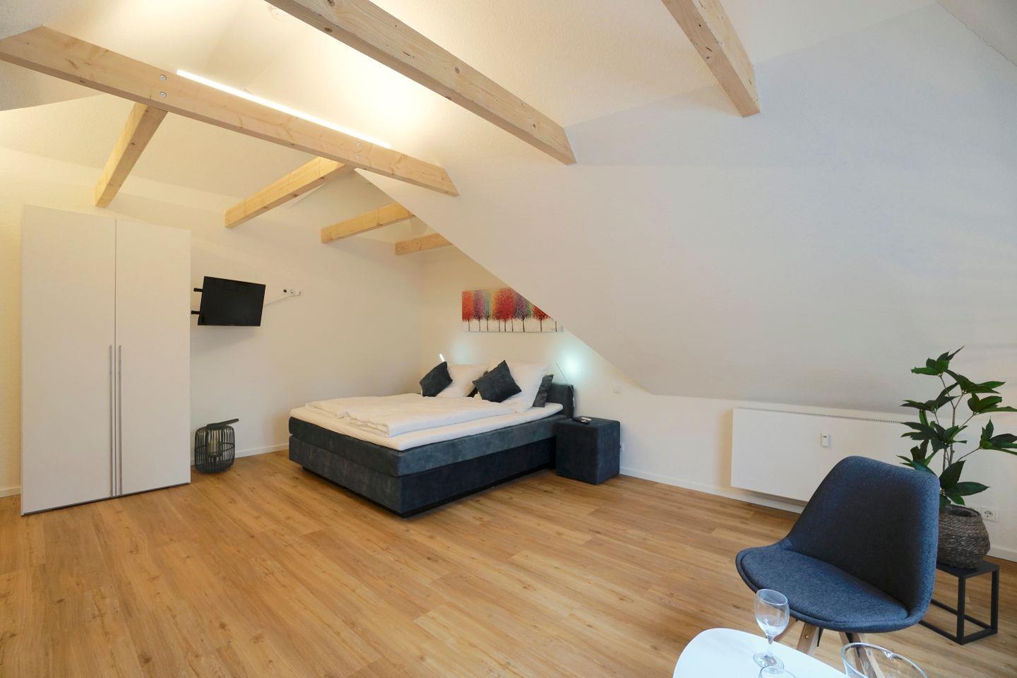 Über eine Holztreppe gelangt man auf die Galerie der Wohnung auf der sich das moderne Boxspringbett befindet und auch hier wird der Raum wieder mit Licht durchflutet und mit Blick auf den Dom belohnt.