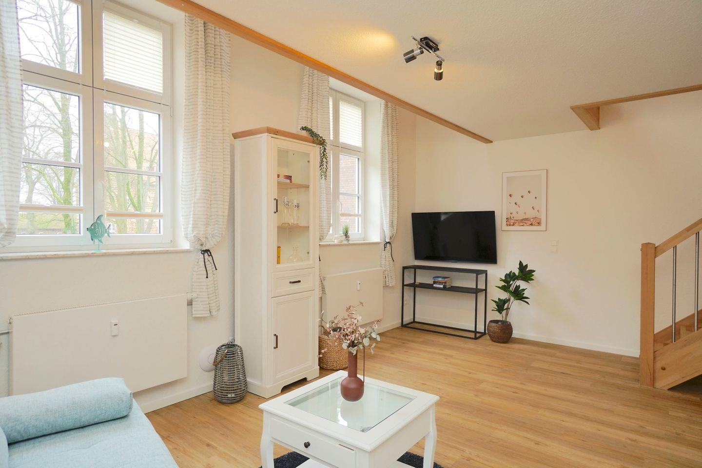 Die helle Maisonette Wohnung im ersten Obergeschoss des gerade frisch sanierten Gebäudes empfängt seine Gäste mit viel Raum und Licht. Die offenen Balken und die sorgfältig zum alten Charme passenden Fenster machen das Wohlgefühl in dieser Wohnung perfekt. Der offene Wohn-Essbereich bietet Platz zum Erholen unter den Türmen des Schleswiger Wahrzeichens, dem Dom.