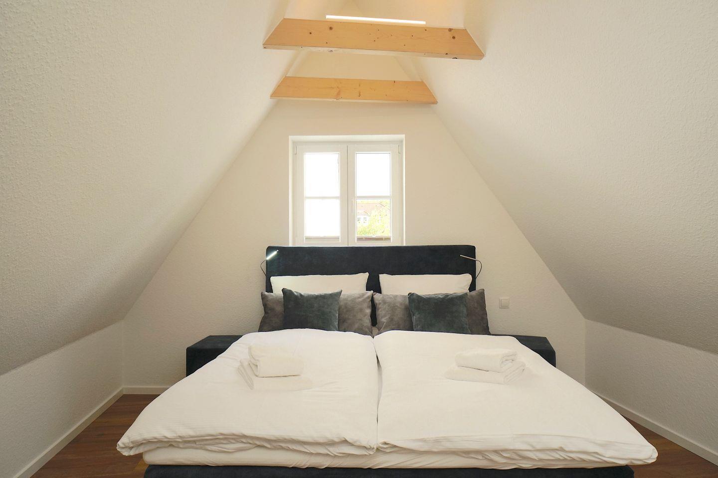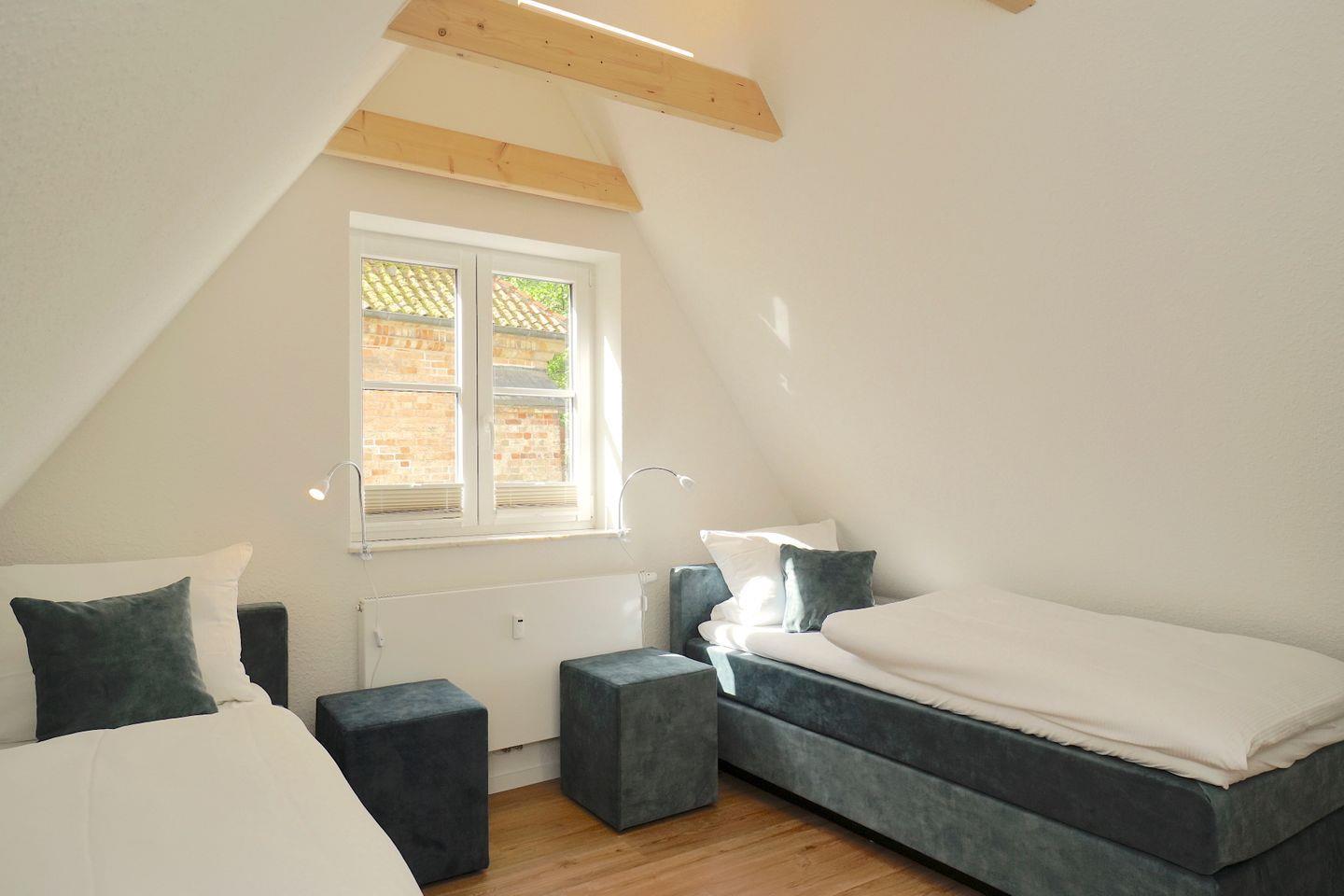 Im oberen Stockwerk des Ferienhauses befinden sich zwei Schlafzimmer, eines mit zwei Einzelbetten und das anderen mit einem gemütlichen Boxspringbett mit einer Breite vom 160cm.
