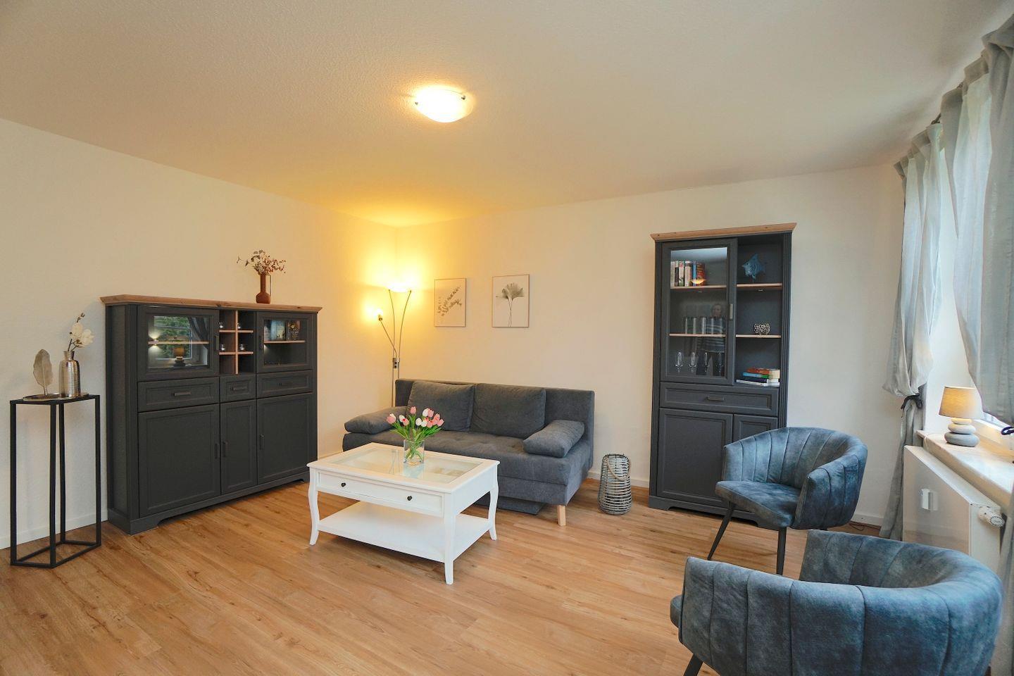 Der Wohnbereich lädt zum Entspannen und Verweilen ein und bietet zusätzlich die Möglichkeit das Sofa zum Schlafen umzubauen.