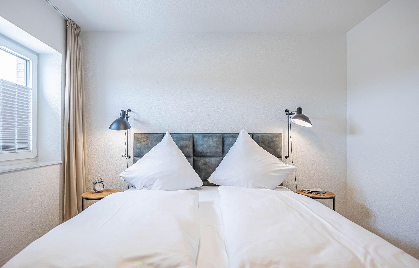 Zwei Schlafzimmer bieten jeweils ein gemütliches Boxspring Doppelbett (180x200cm) sowie eine Verdunkelungsmöglichkeit für erholsame Nächte. Das Badezimmer ist modern gestaltet und bietet eine bodengleiche Dusche mit Haltegriff, sowie eine Fußbodenheizung, die für zusätzlichen Komfort sorgt. Ebenfalls stehen ein Kosmetikspiegel und Föhn bereit. Eine Waschmaschine steht zur gemeinschaftlichen Nutzung im Nachbarhaus zur Verfügung, damit Sie auch bei längeren Aufenthalten immer frisch gewaschene Kleidung haben. Durch die einzigartige Lage am Ostseefjord Schlei kann auch ein Boot mitgebracht und auf einem Liegeplatz gegen Gebühr direkt am Pionierhafen angelegt werden. Bitte sprechen Sie uns hierfür an.