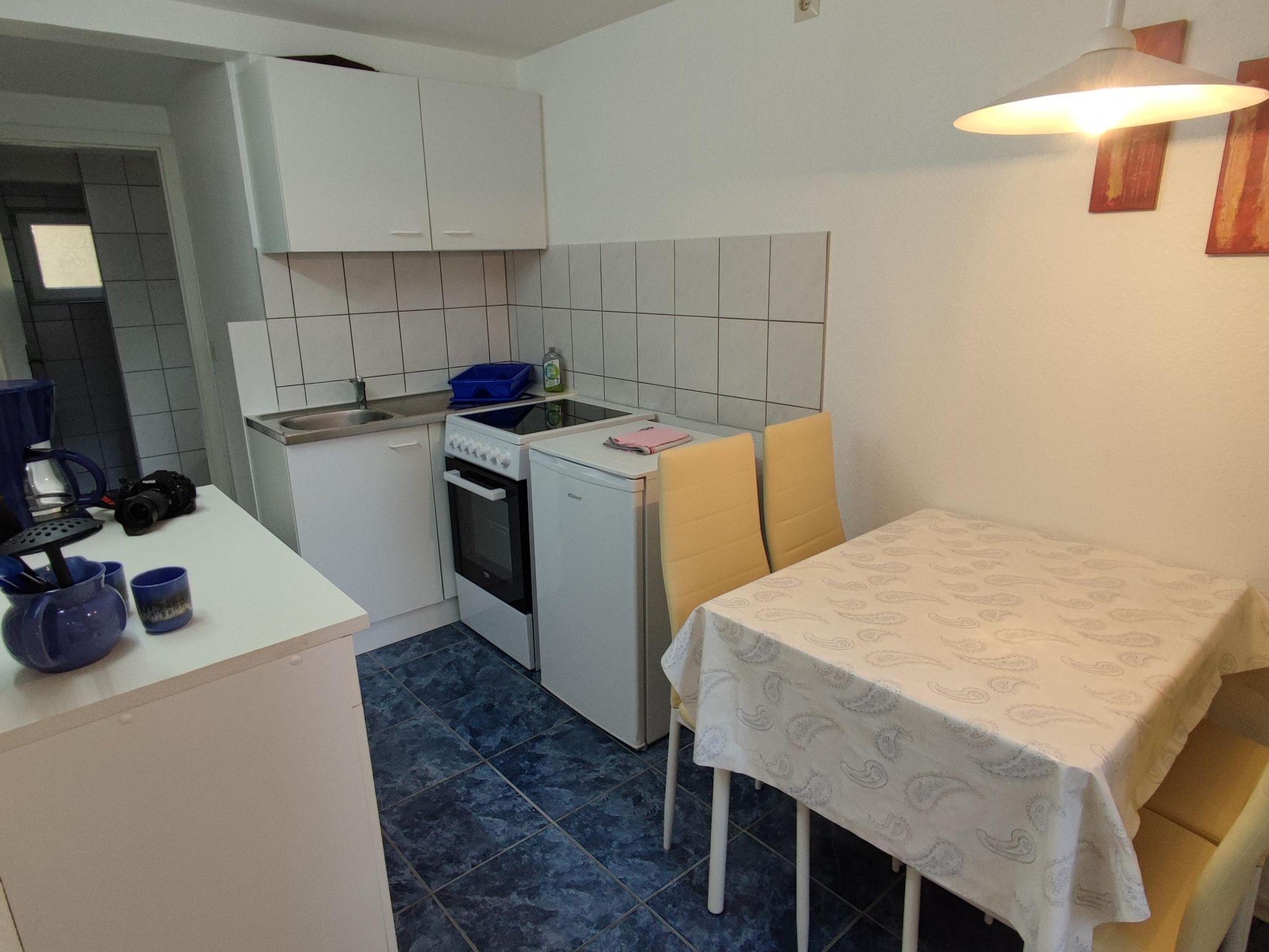 1 Schlafraum mit 1 Ehebett, 1 Schlafraum mit 2 Einzelbetten, Wohnraum mit TV, Bad mit Dusche und WC, Küche mit Herd, Grundausstattung, Kühlschrank, Kaffeemaschine (1x4 Filtermaschine), Toaster, Wasserkocher, Geschirr, Besteck, Gläser, Töpfe, Pfanne. Überdachte Terrasse.