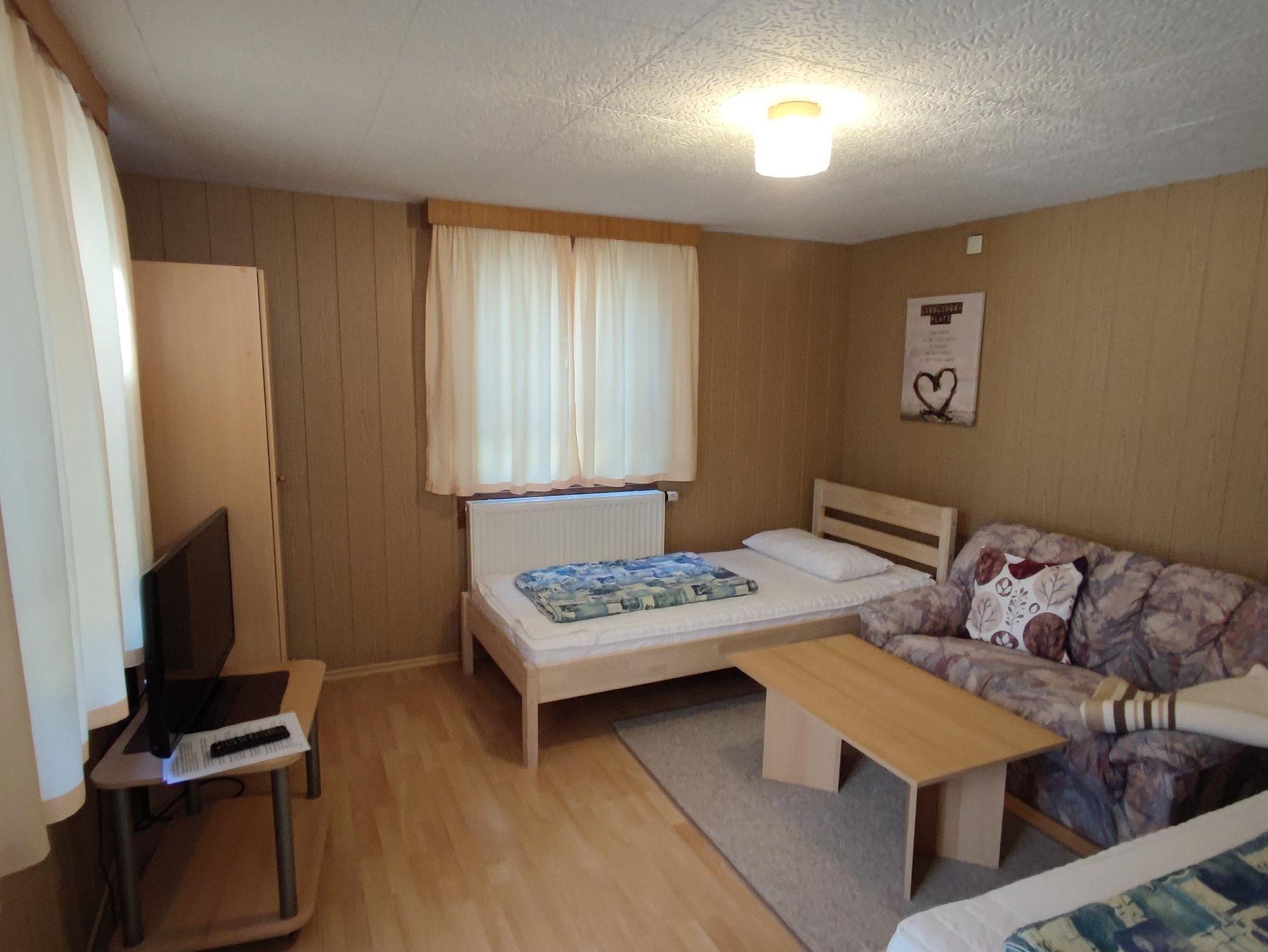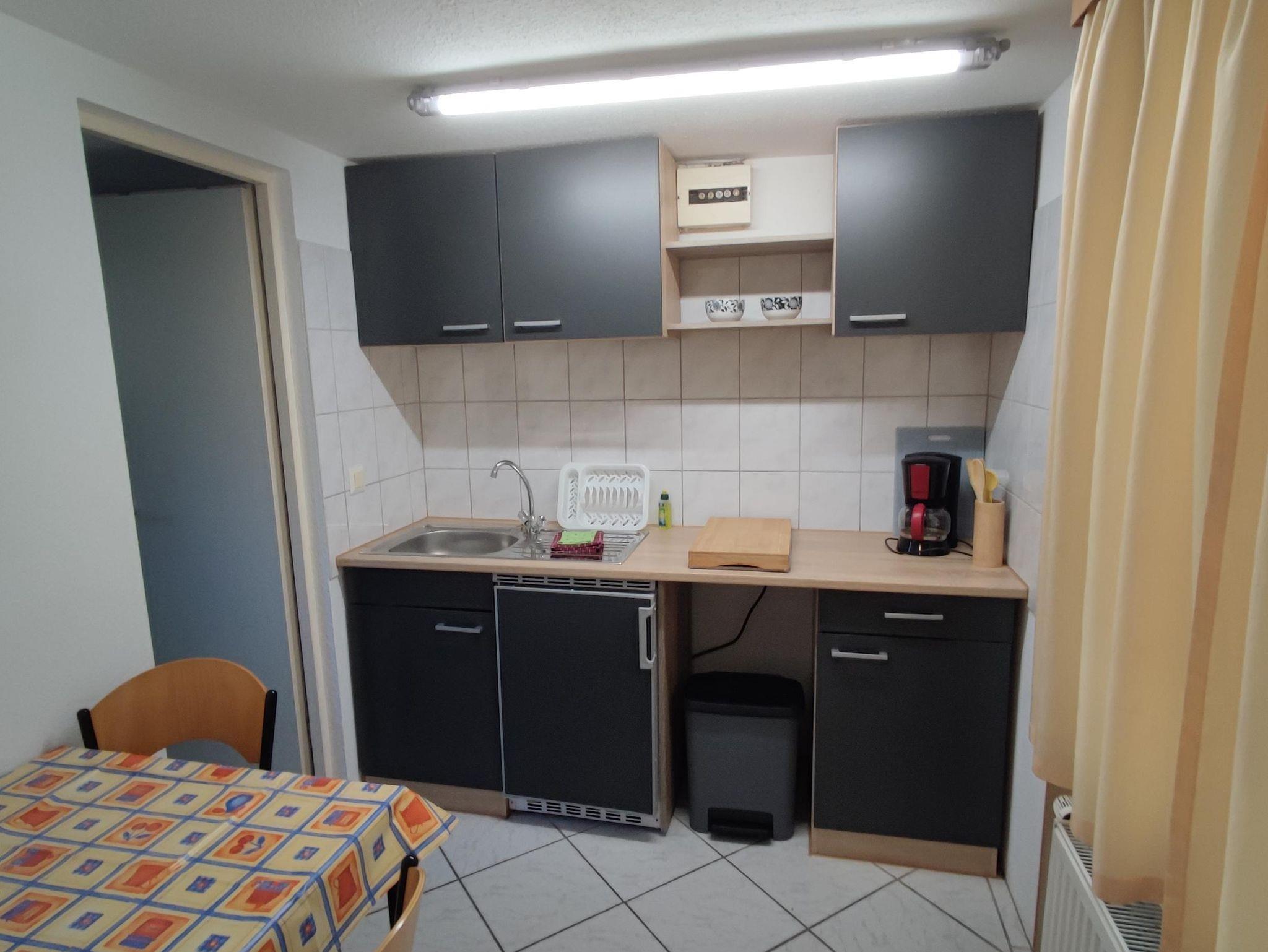 Schlaf-Wohnraum mit Couch, Couchtisch, 2 Einzelbetten und Kabel-TV und kleine Küchenzeile mit elektr. 2 Plattenkochstelle (kein Backofen), Kühlschrank, Spüle, Toaster, Kaffeemaschine (1x4 Filter), Wasserkocher, Besteck, Porzellan und Gläser. Bad mit Dusche / WC, Waschtisch kleine überdachte Terrasse.