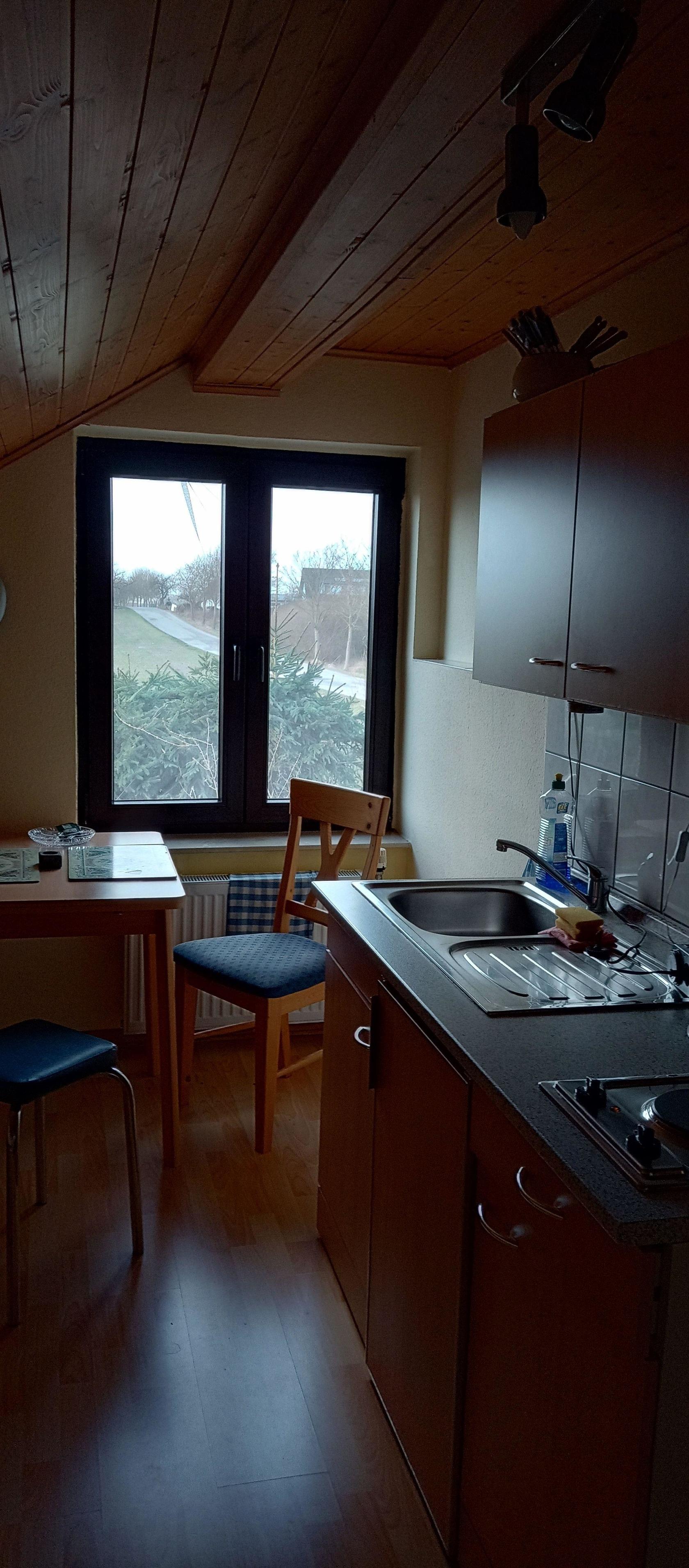 Die Ferienwohnung im Dachgeschoss mit schrägen Wänden verfügt über ein Wohnzimmer mit 25 qm mit Tv,Radio,Kaminofen,Sofa und Sessel.Im ca 10 qm großen Schlafzimmer finden bis zu drei Personen in Doppel-und Kojenbett Erholung.Bettwäsche wird gestellt.Die Küche verfügt über eine Singleküche mit 2-Flammen-Elektroherd,Kühlschrank mit Eisfach, Mikrowelle,Minibackofen,Wasserkocher,Toaster,Eierkocher,diverses Geschirr und ist ca 10 qm groß