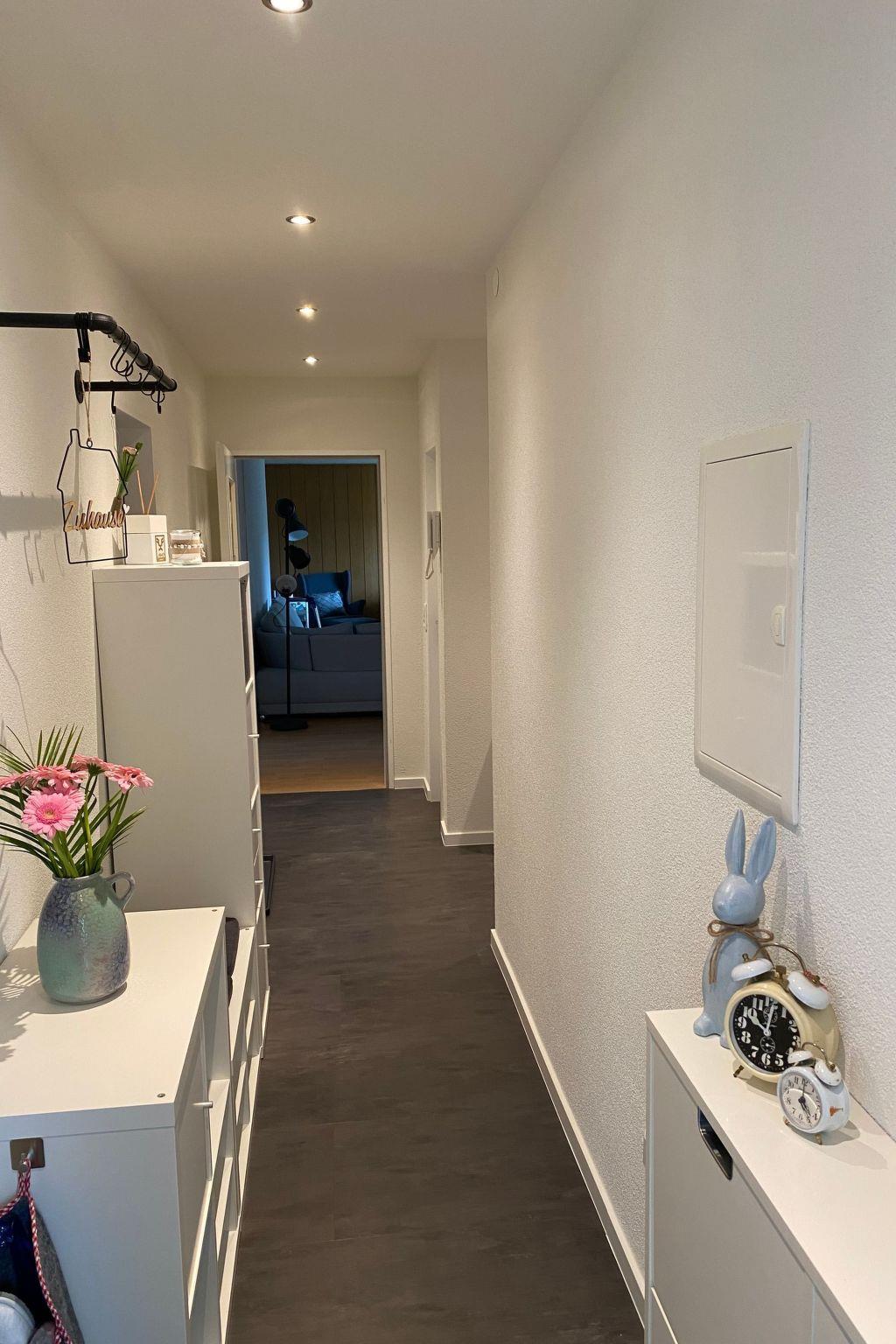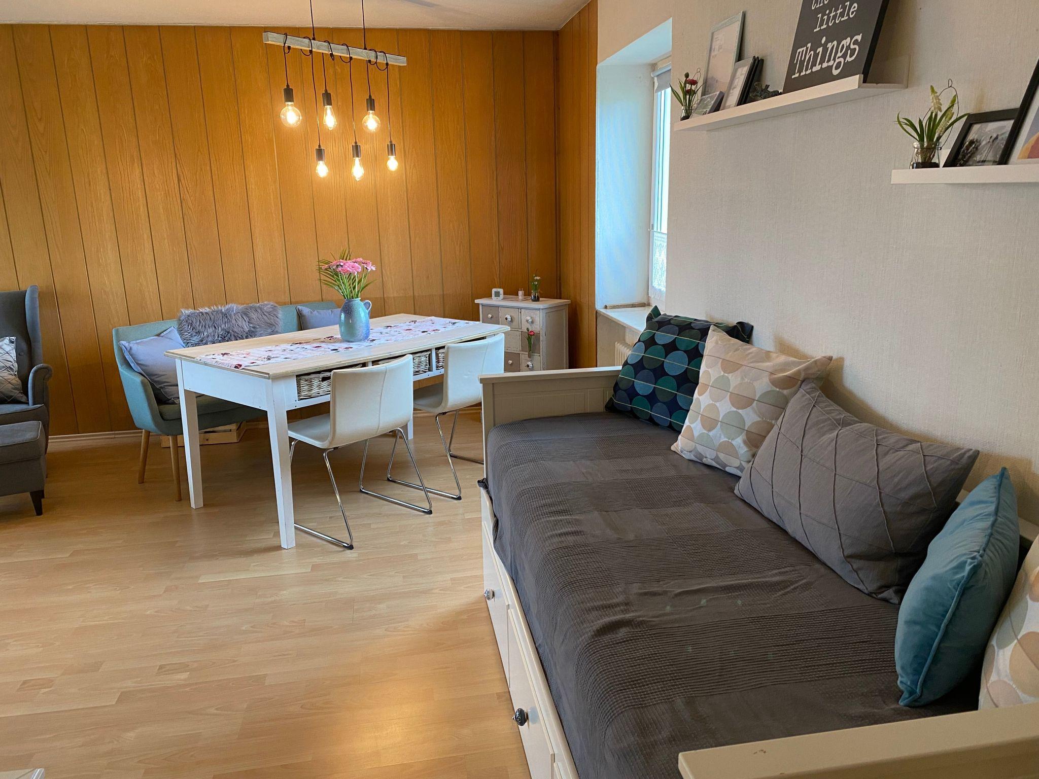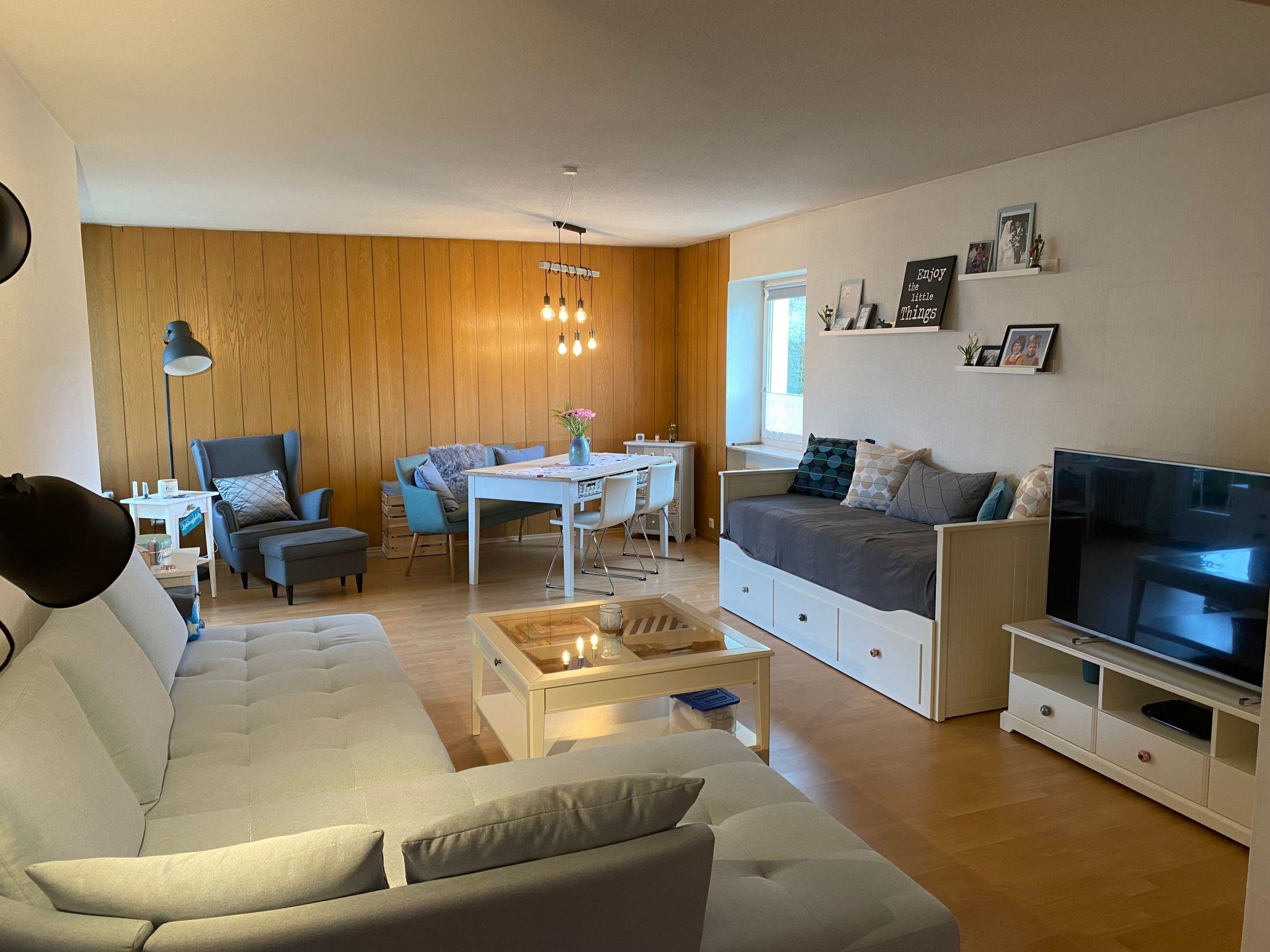 Inside, you will be welcomed by a 2-room flat of approx. 80 m2, which has been recently renovated and impresses with its cosy furnishings. The spacious bedroom is furnished with a double bed, a bunk bed and a spacious wardrobe. A small balcony allows you to enjoy the morning sun. In the living/dining room you will find a comfortable sofa next to a modern flat-screen TV, a pull-out day bed that serves as an additional sleeping option, a dining table and a cosy reading corner. The new kitchen has a ceramic hob, fridge, kettle, oven and dishwasher. A newly renovated bathroom with rain shower and a separate guest WC round off the offer. A parking space in the garage is also available for guests' convenience.