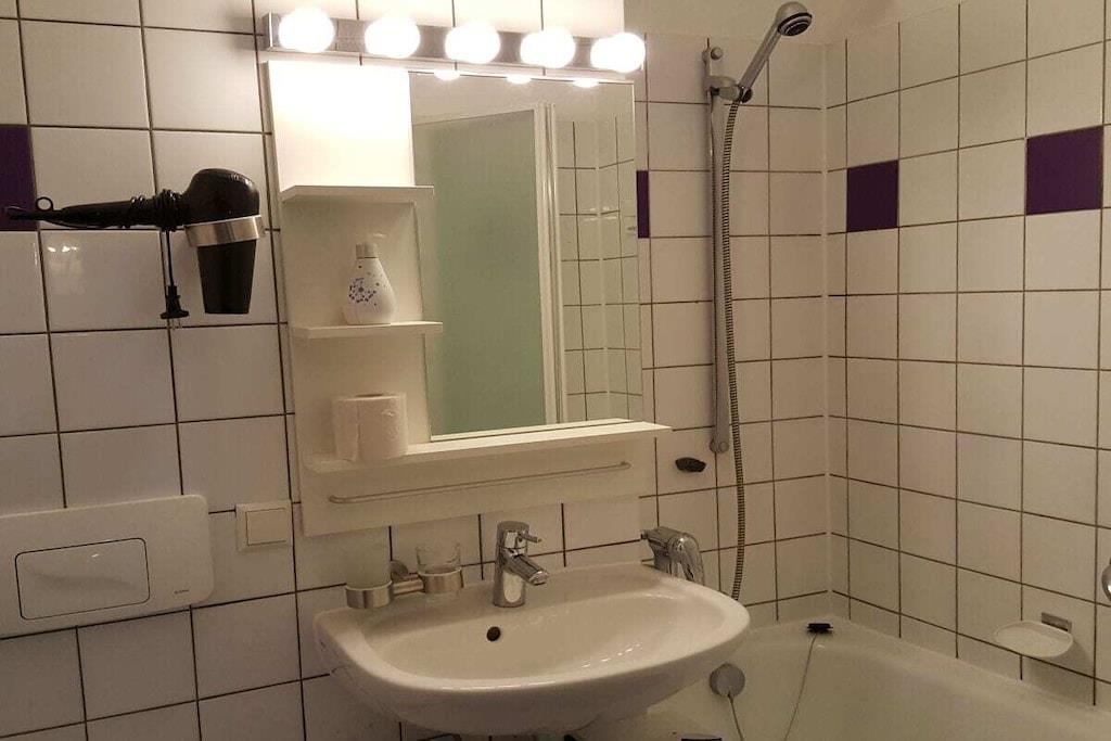 På 1. etage: (entre(, , ), åbent køkken(spisebord, kogeplade, elkedel, brødrister, kaffemaskine, mikrobølgeovn, opvaskemaskine , køleskab, fryser), stue / spisestue(, bibliotek, enkeltsovesofa, Fjernsyn, spisebord, DVD-afspiller, Blu-ray afspiller), soveværelse(dobbeltseng), soveværelse(dobbeltseng), badeværelse(, toilet, badekar, bruser, håndvask, føntørrer)) , , Internetadgang, tørretumbler, vaskemaskine, tørreskab
