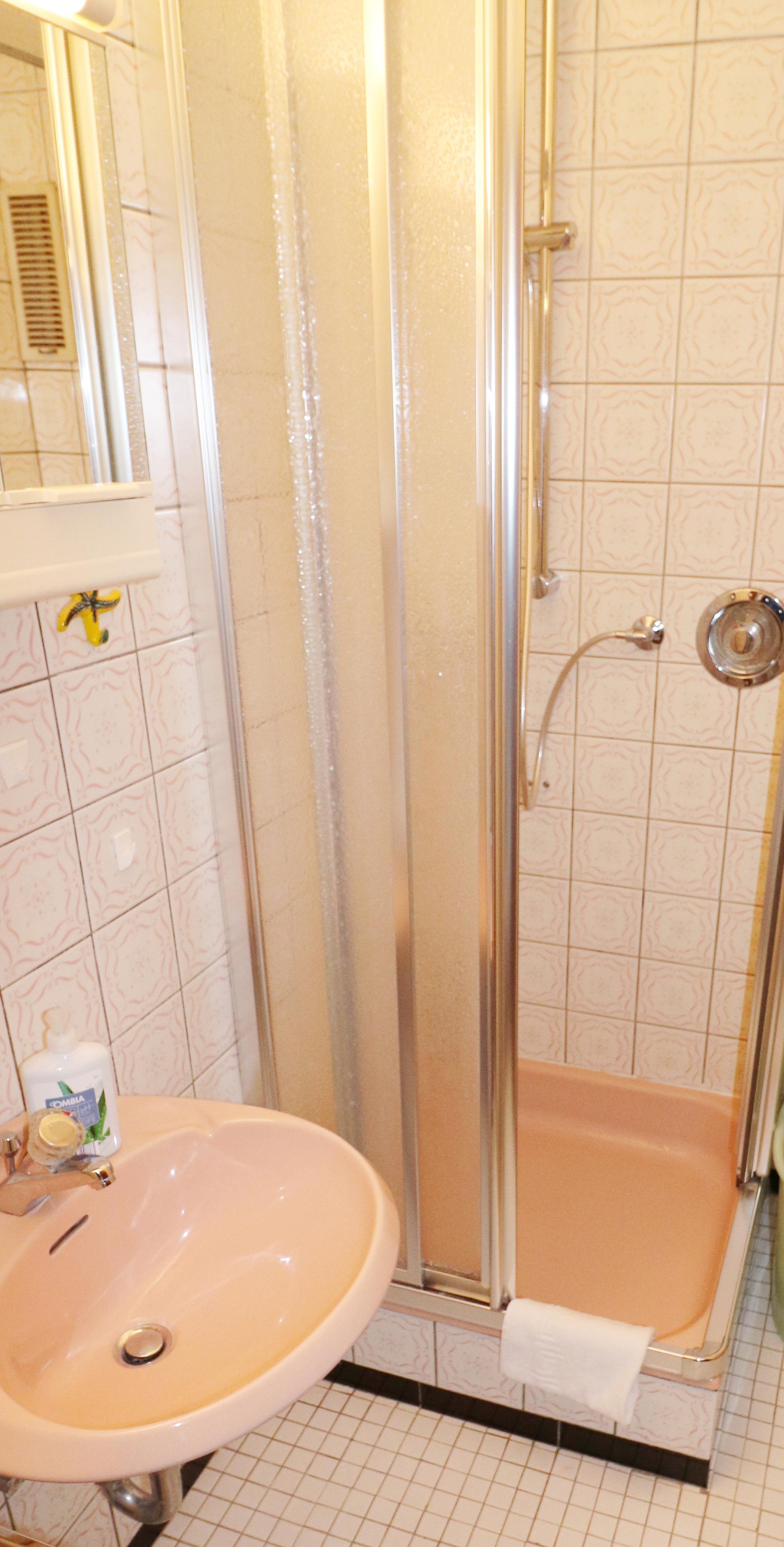 Im Badezimmer befindet sich eine Dusche, das WC ist seperat.