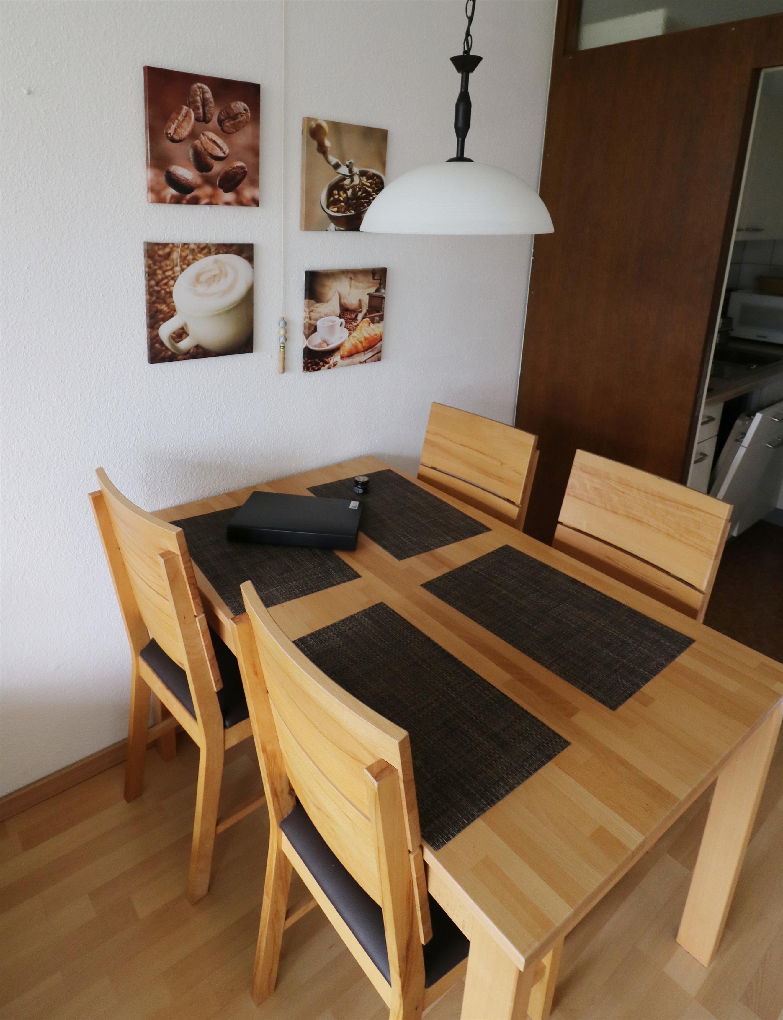 - ein kombiniertes Wohn- und Esszimmer mit Esstisch, einem Flachbildschirm und und ein modernes Schlafsofa ( das man mit wenigen Handgriffen zu einem großen Bett verwandeln kann.