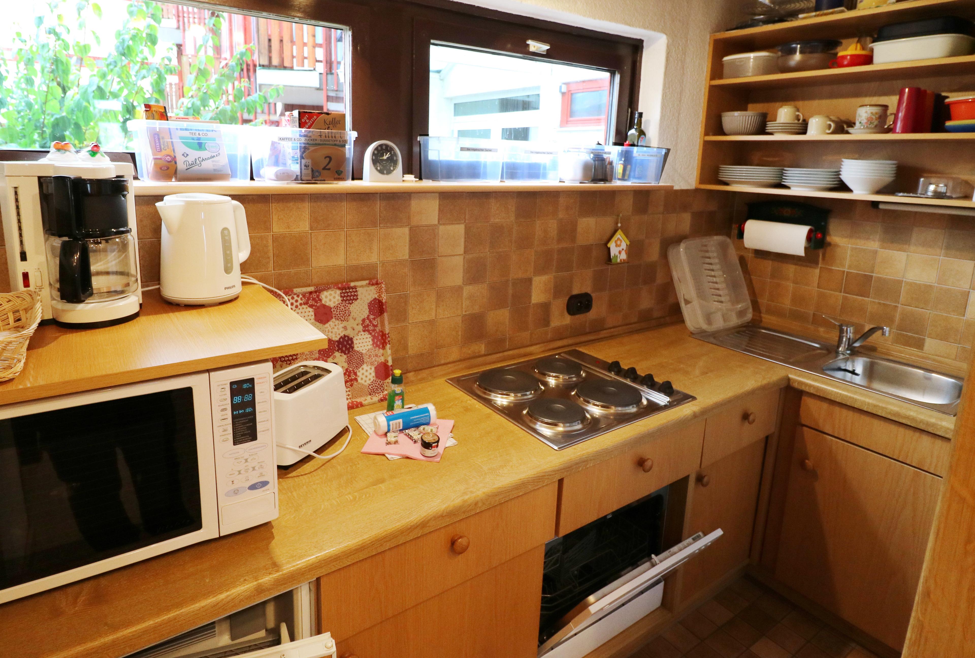 - eine vollausgestattete Küche mit Kühlschrank inkl. Gefrierfach, Herd mit 4 Kochfeldern, Backofen, Mikrowelle mit Heißluftfritteuse, Geschirrspüler, Wasserkocher, Toaster, Filterkaffeemaschine und Küchengrundausstattung