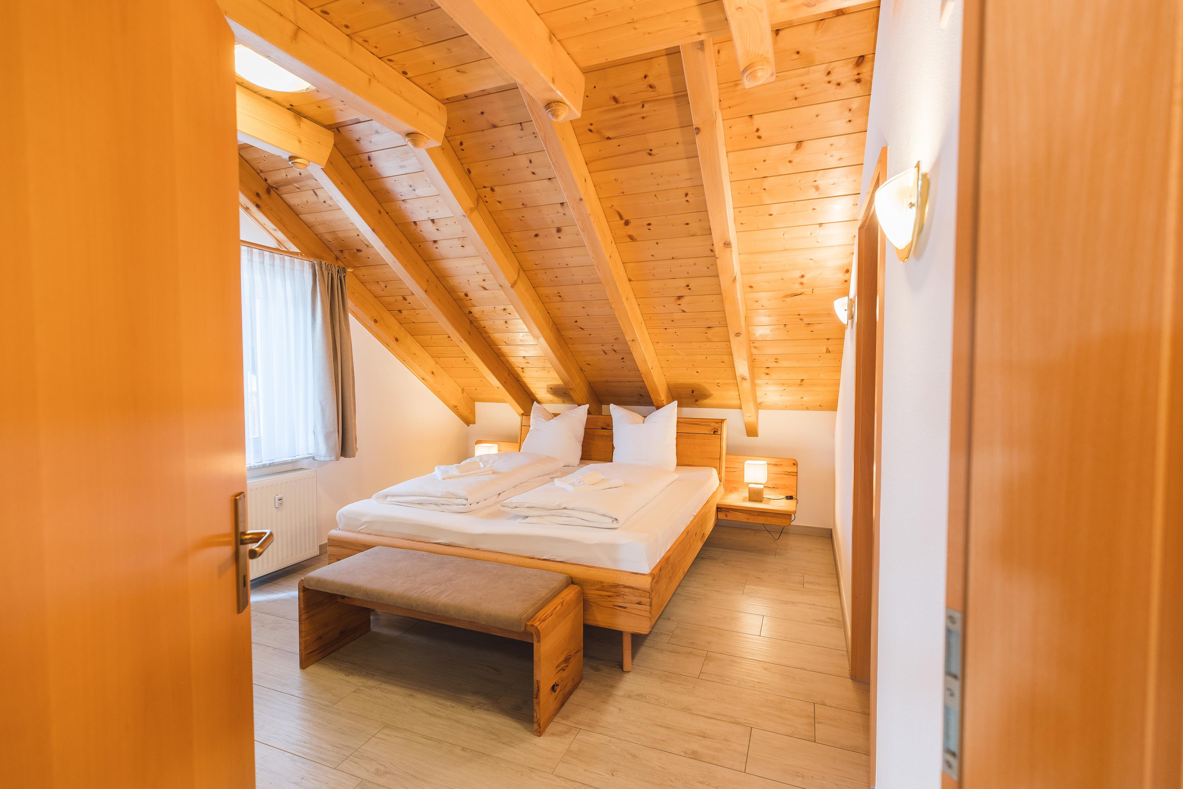 Im Dachgeschoss bildet eine großzügige Galerie das dritte Schlafzimmer mit Doppelbett (Liegefläche 1,80 x 2,00 m), Schrank, Regalen, und einem kleinen Schreibtisch im Schwarzwald-Design. Der helle Raum mit großzügigen Dachfenstern ist offen gestaltet und bietet durch einen Luftraum den Blick nach unten ins Wohnzimmer. Angrenzend befindet sich ein weiteres Badezimmer mit Dusche,