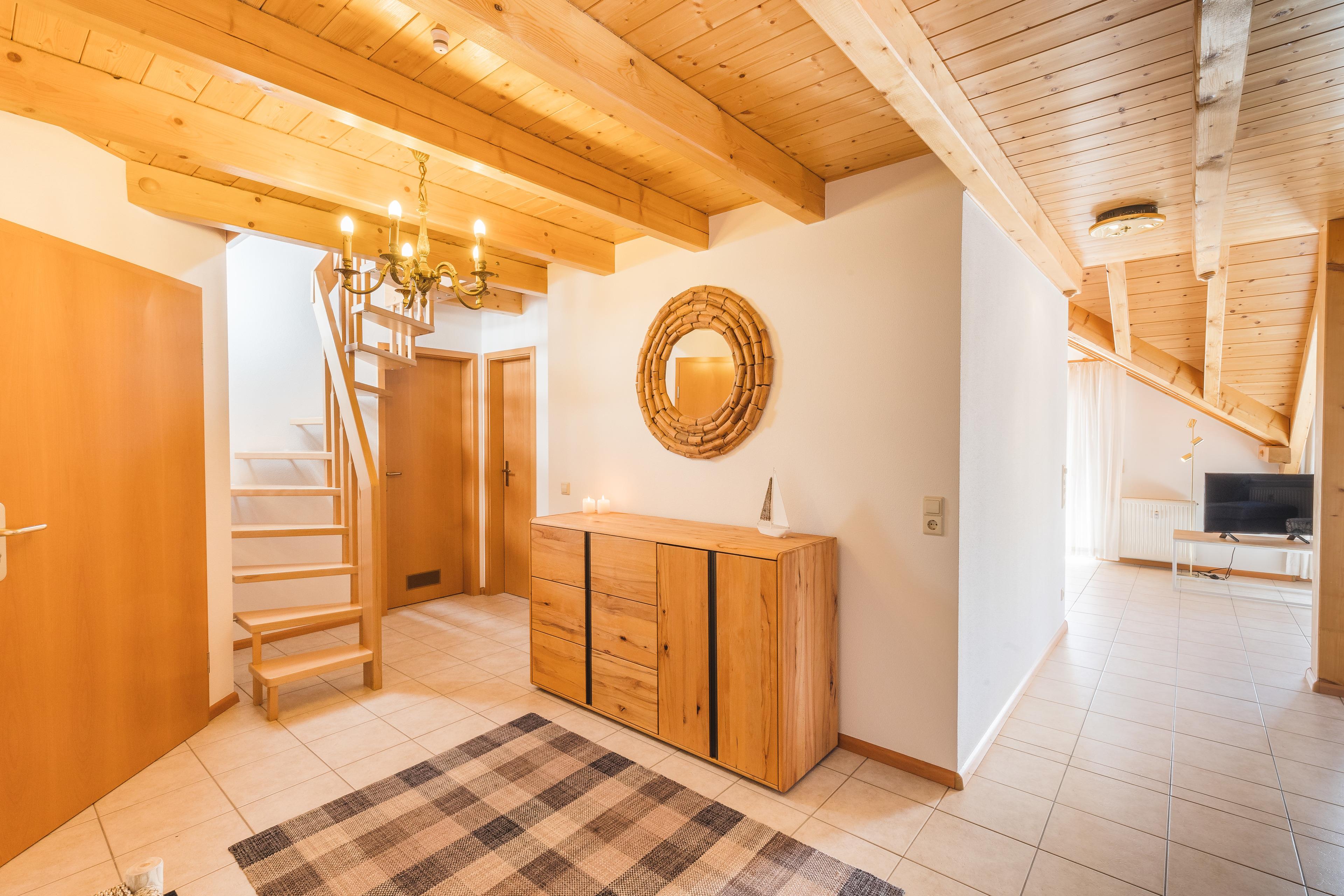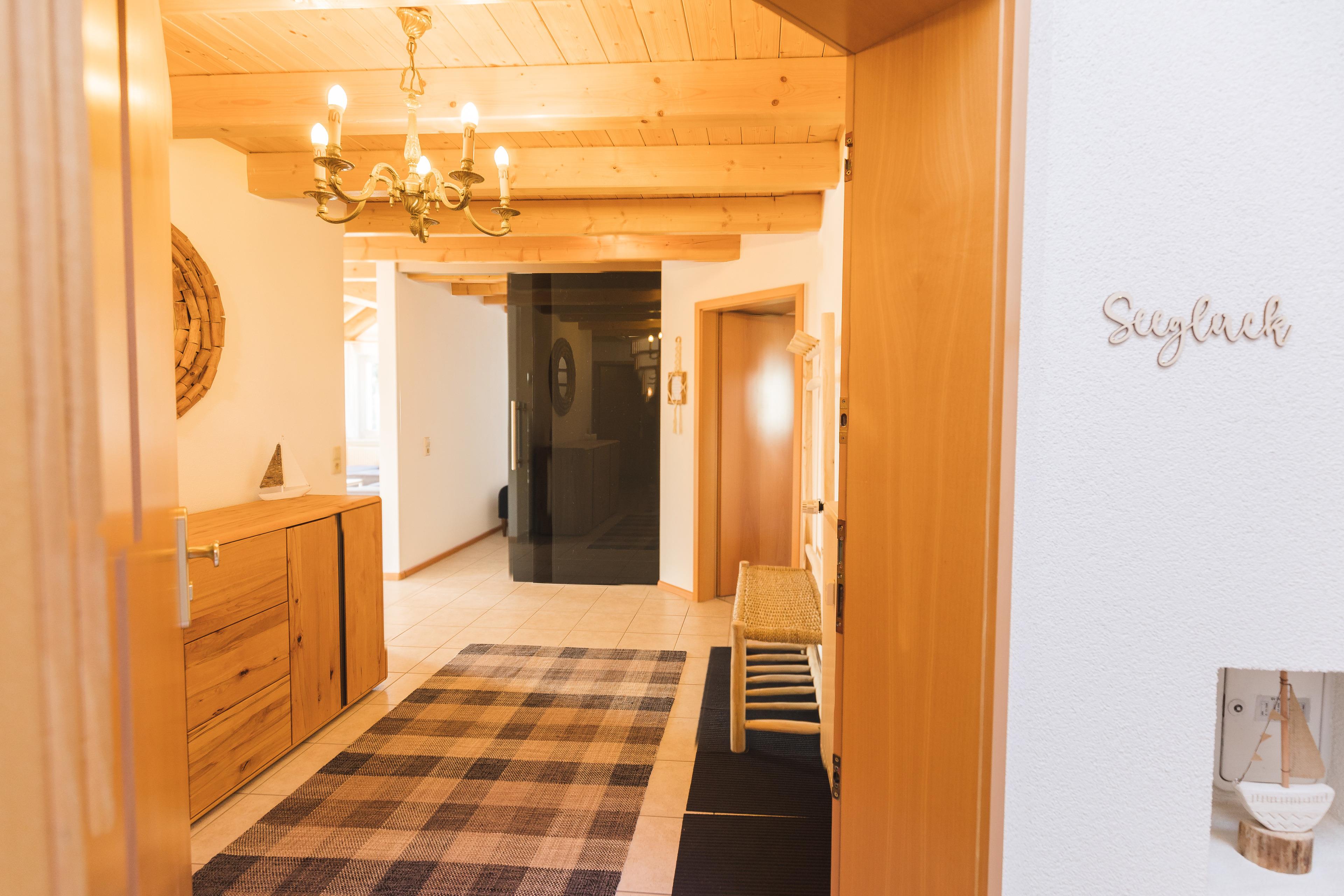 The light-flooded vacation apartment Seeglück has free parking and a covered bicycle stand directly in front of the house entrance. It comprises about 105m² of living space, which is distributed over 4.5 rooms in the 1st 0G and attic.