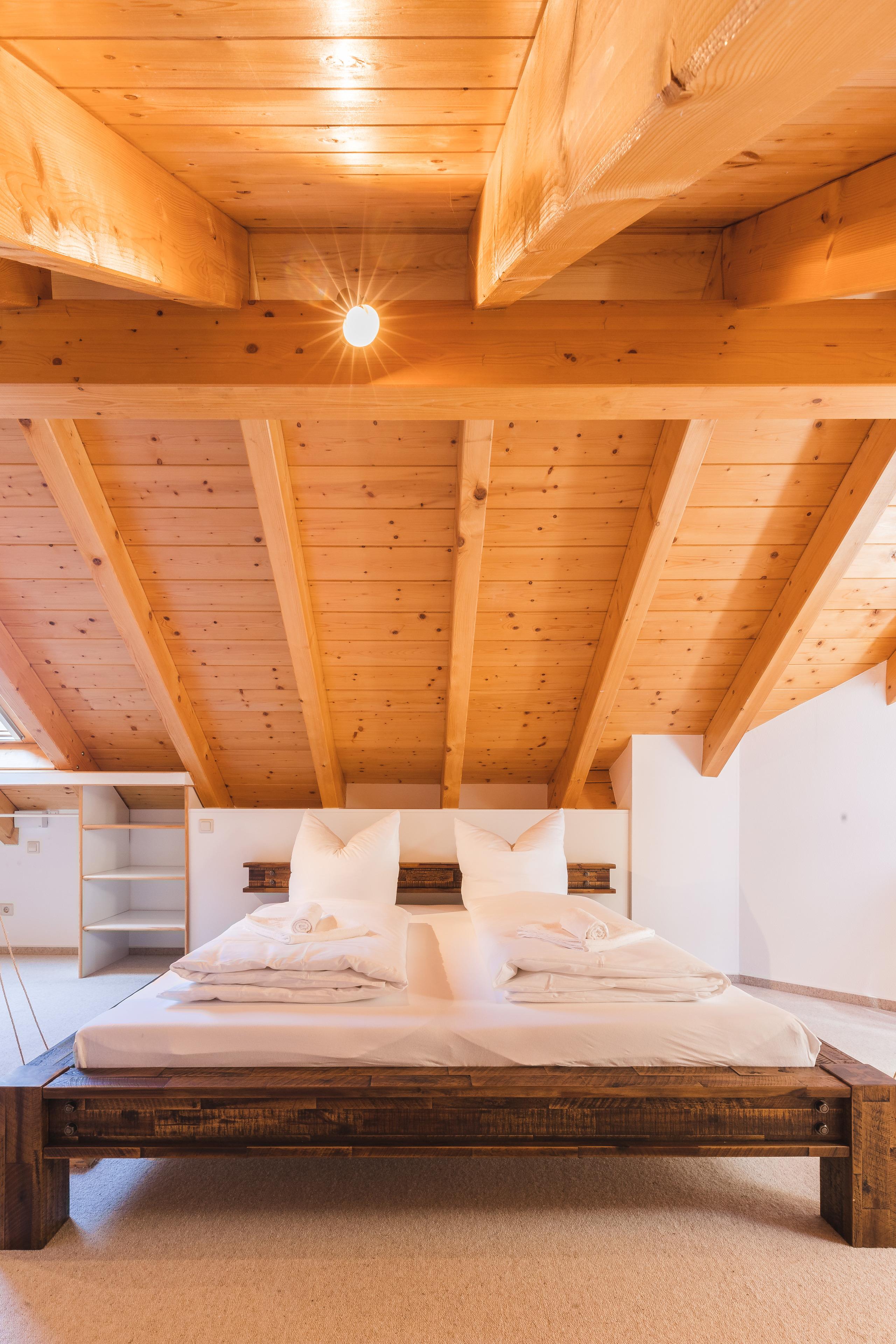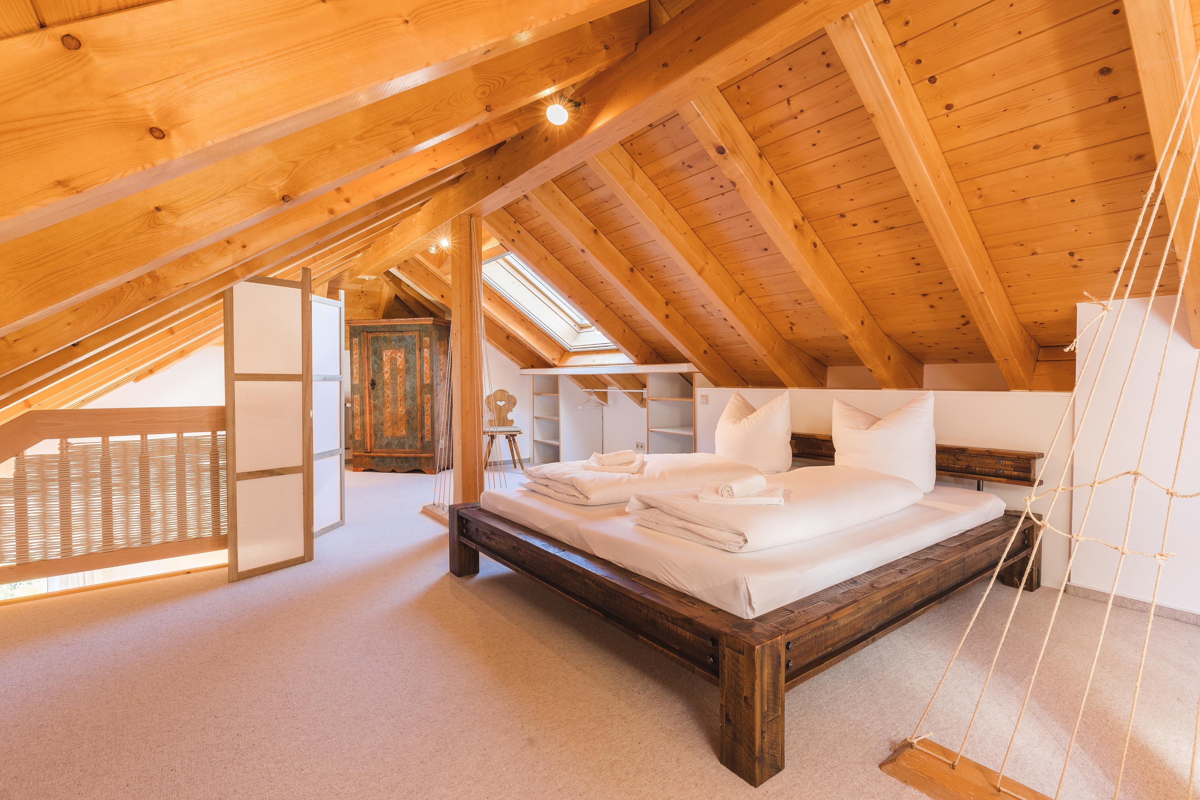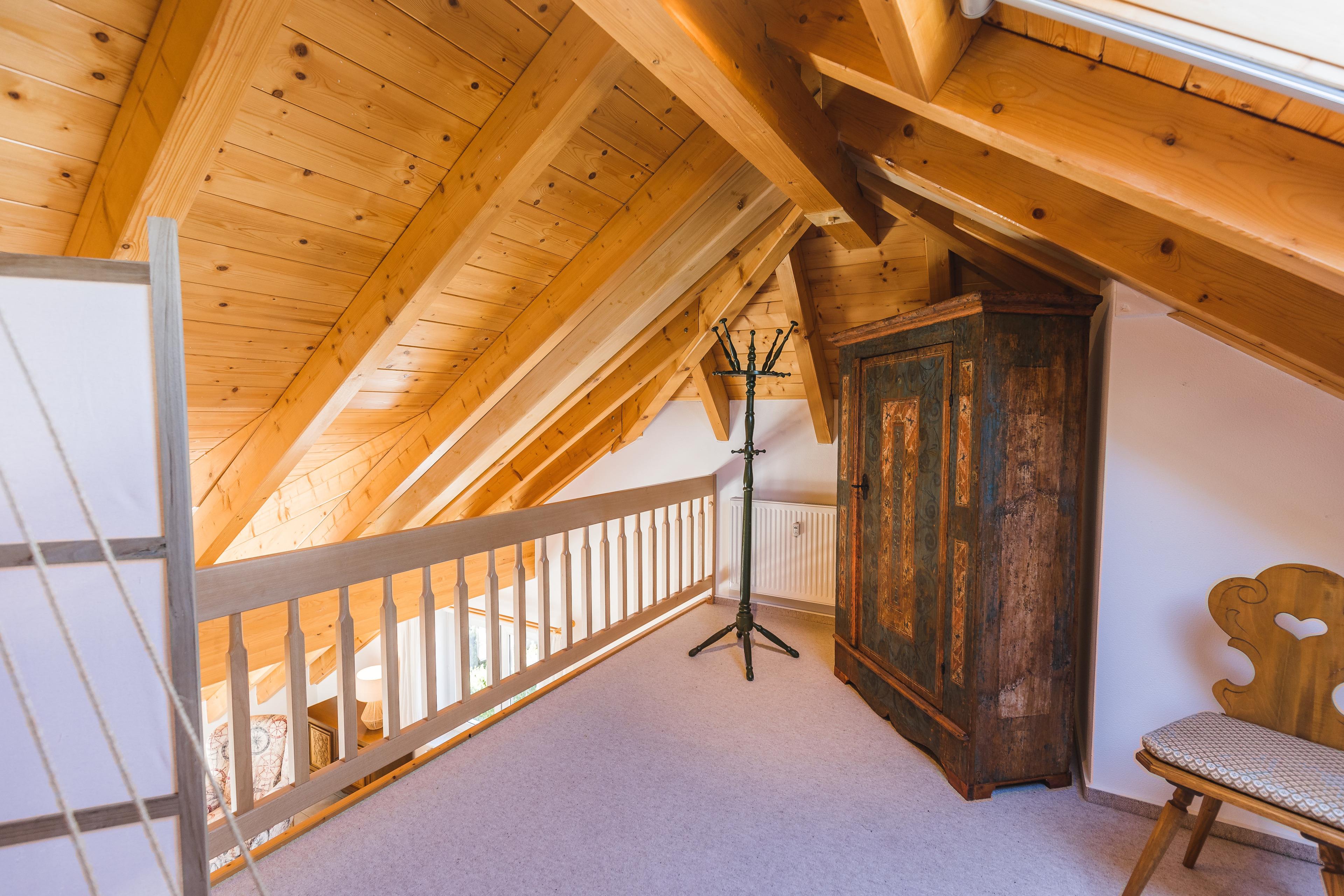 In the attic, a spacious gallery forms the third bedroom with a double bed (lying surface 1.80 x 2.00 m), wardrobe, shelves, and a small desk in Black Forest design. The bright room with generous skylights has an open design and offers a view down into the living room through an air space. Adjacent is another bathroom with shower,