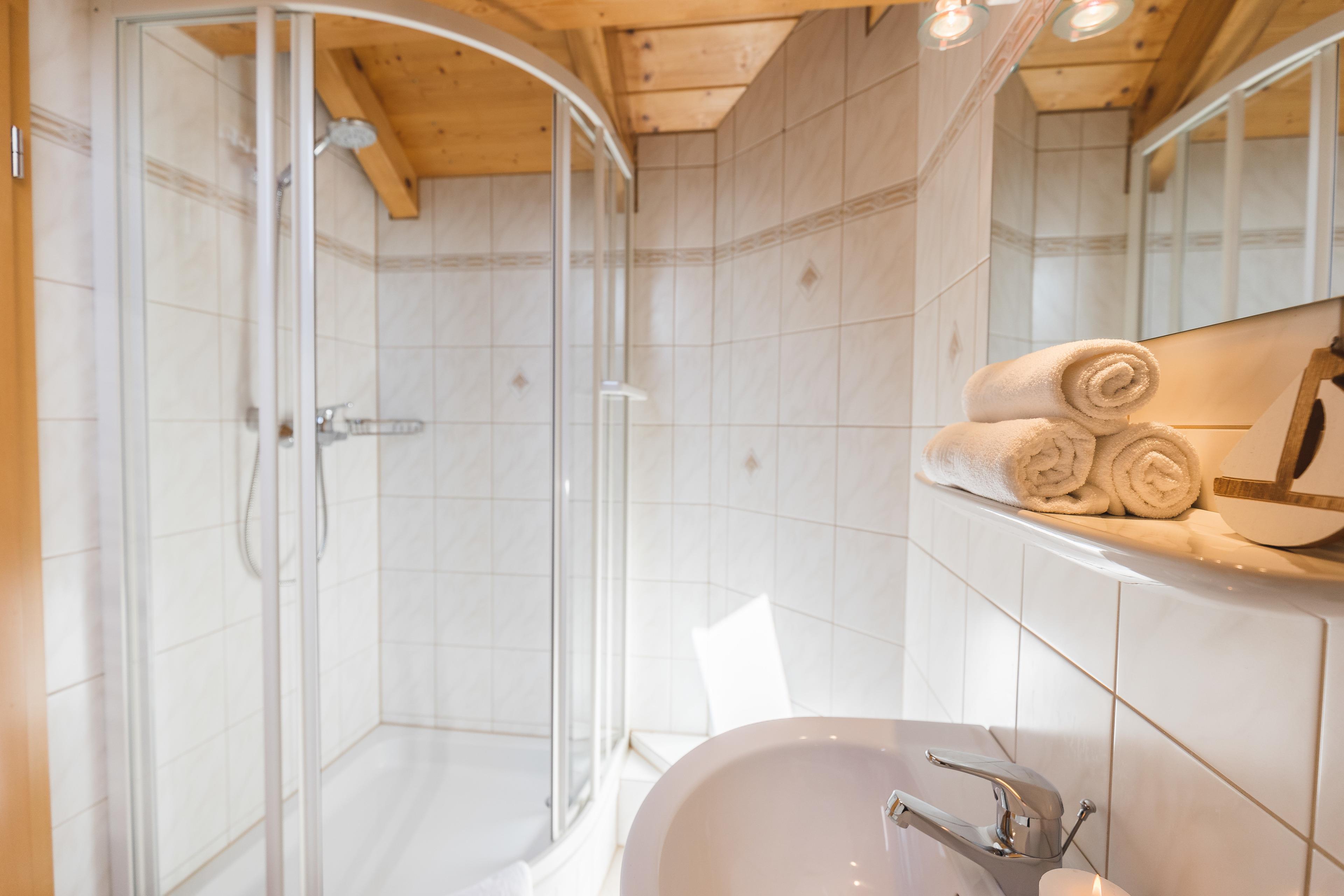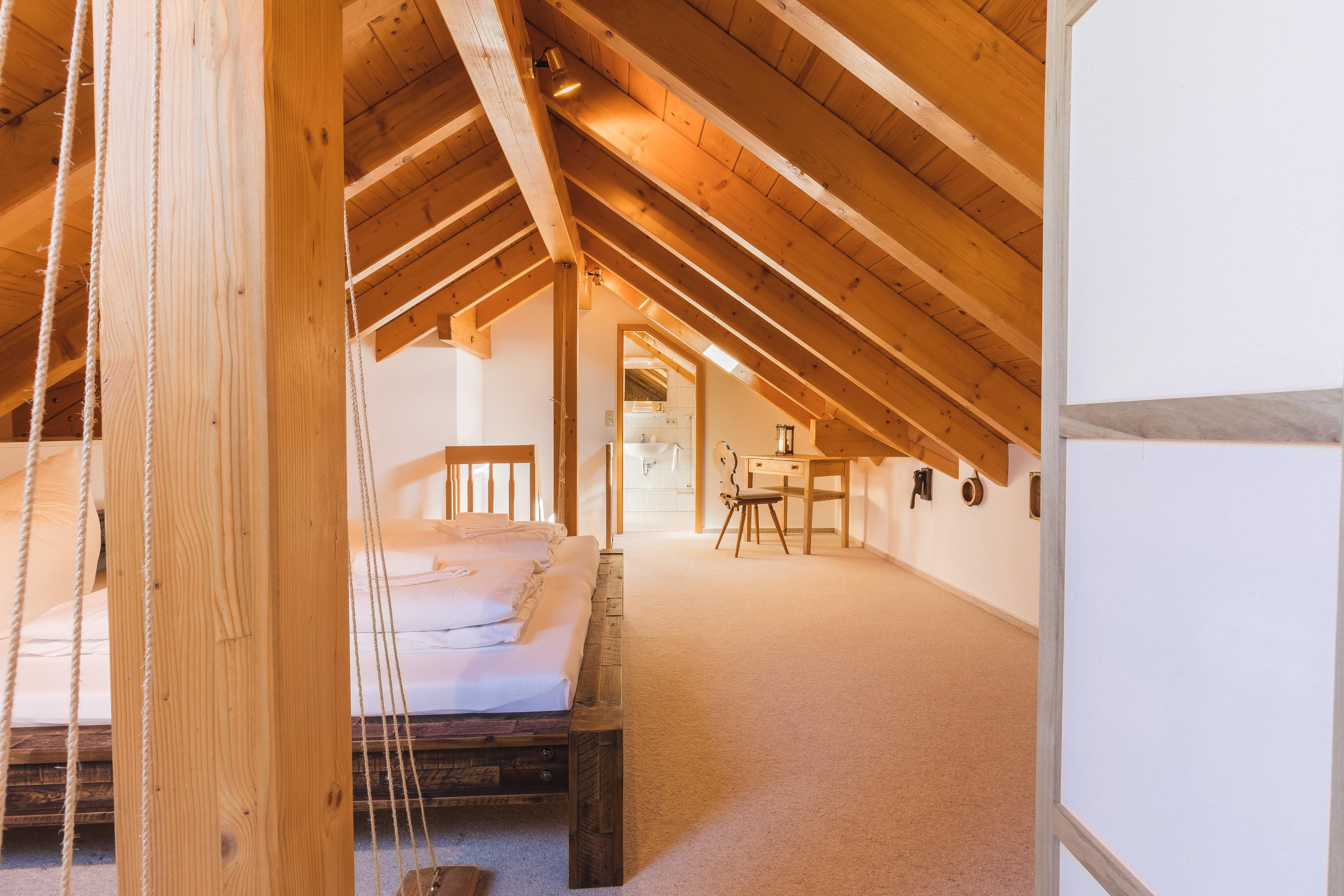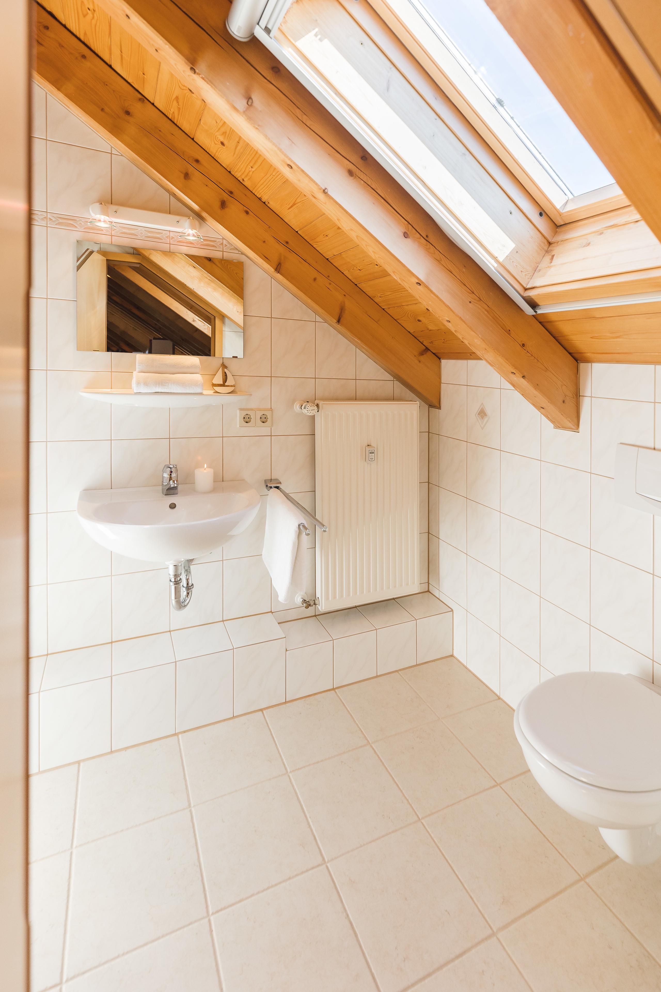 In the attic, a spacious gallery forms the third bedroom with a double bed (lying surface 1.80 x 2.00 m), wardrobe, shelves, and a small desk in Black Forest design. The bright room with generous skylights has an open design and offers a view down into the living room through an air space. Adjacent is another bathroom with shower,