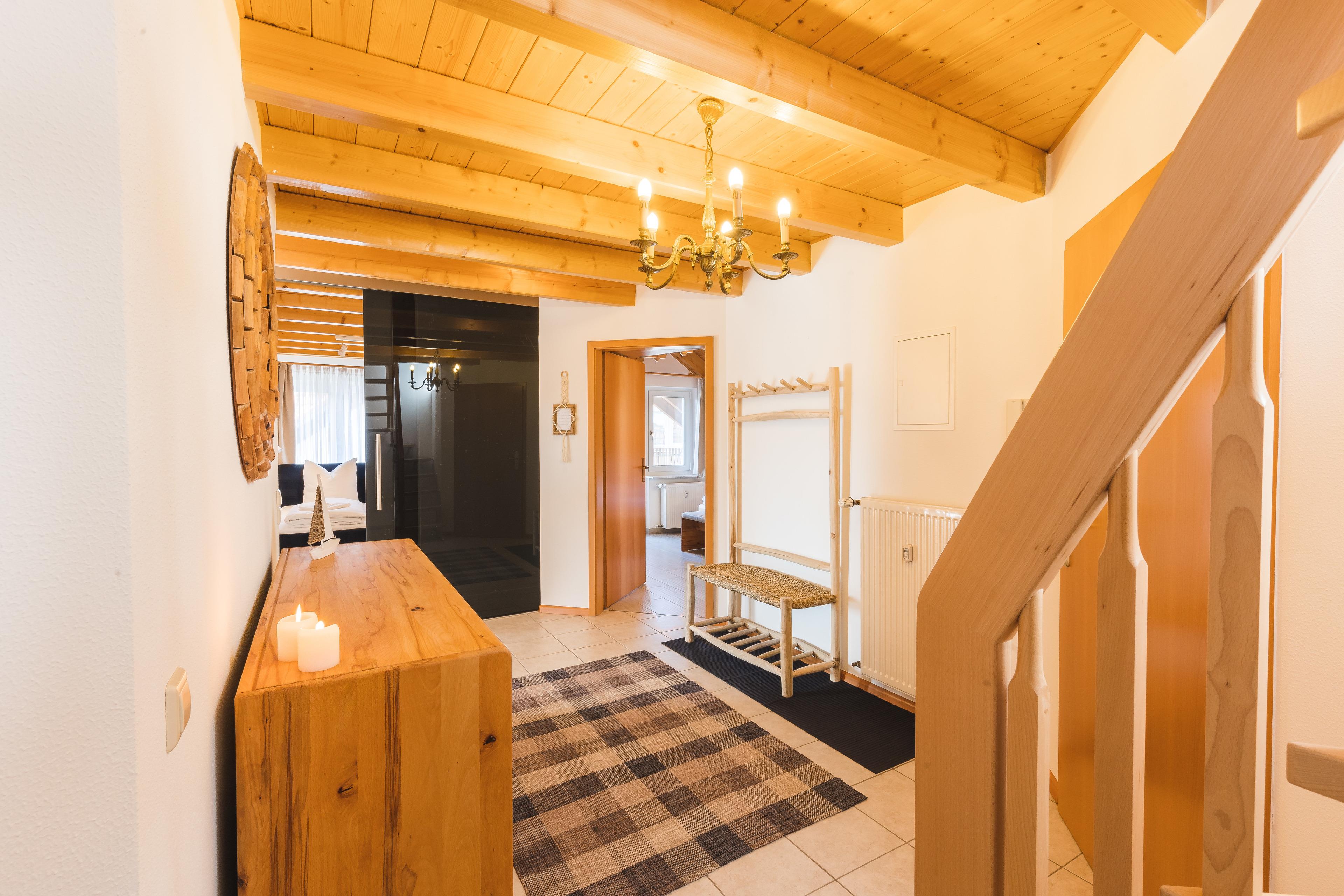 The sociable dining area includes the open-plan eat-in kitchen in true Black Forest ambience with oven, four hotplates, refrigerator, kettle, De'Longhi Nespresso capsule machine and ample crockery and kitchen accessories. The cooking/dining area flows into the bright and open living room, which invites you to linger comfortably on the spacious couch as well as the comfortable armchair.