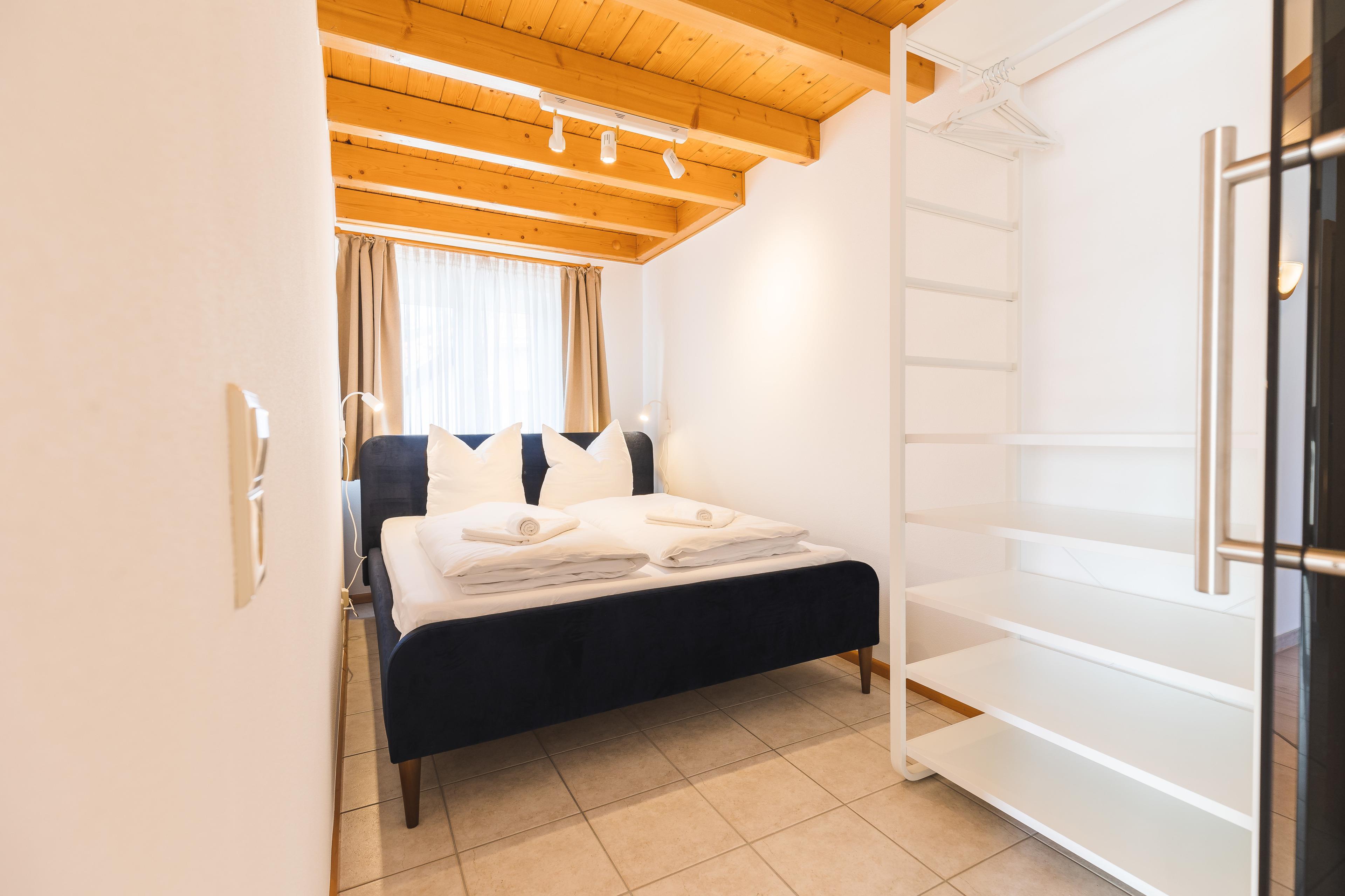 Next door is the second bedroom, which has a double bed (lying surface 1.60 x 2.00 m), an open shelf system and a sliding door. On the 1st floor there is also a separate bathroom with sink and toilet.