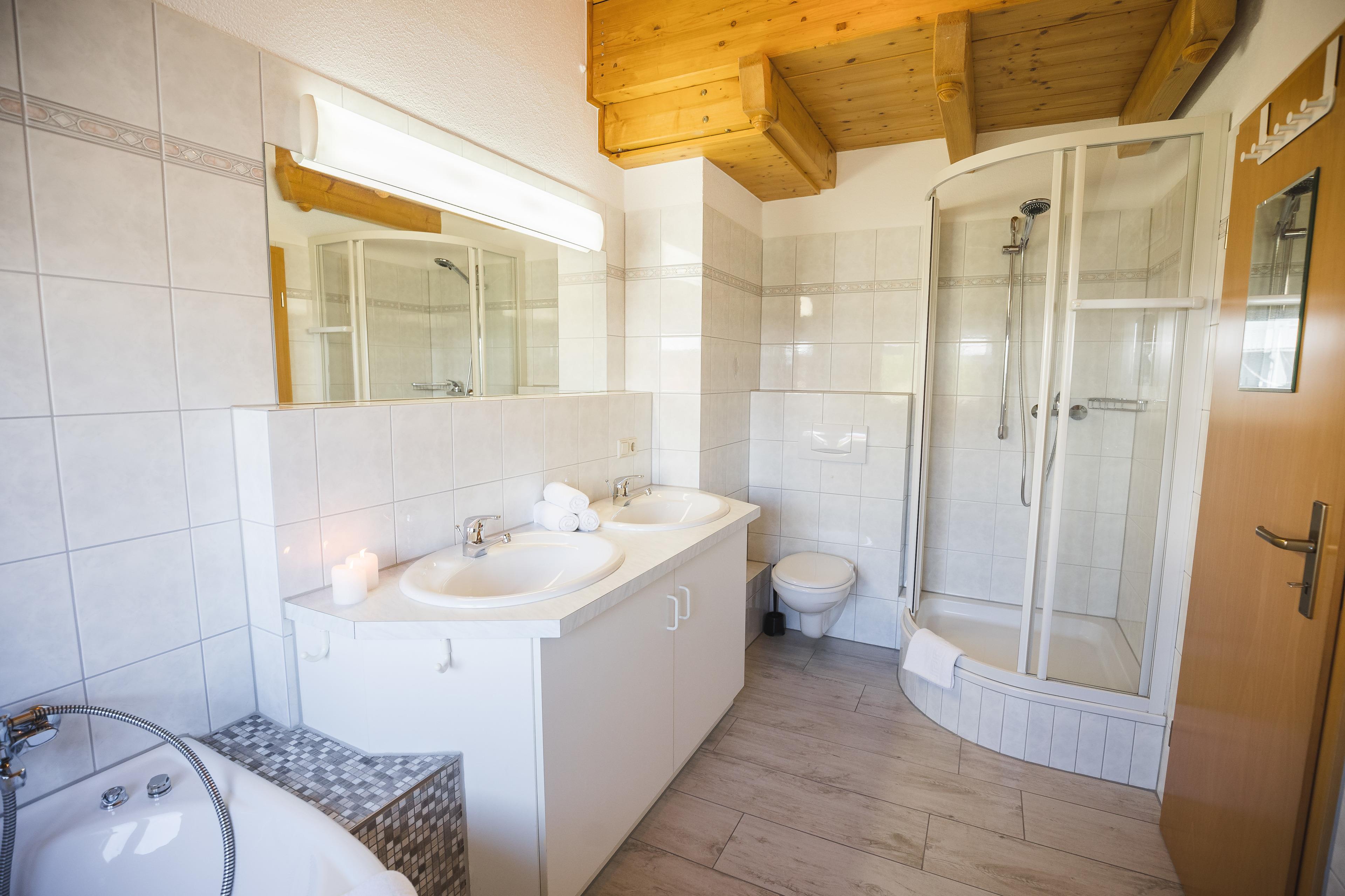 The first bedroom, which is located on the 1st floor, has a third balcony, as well as a double bed (lying surface 1.80 x 2.00 m), and a spacious wardrobe. Through this bedroom you enter the wellness bathroom with whirlpool corner bath, shower, 2 sinks and toilet.