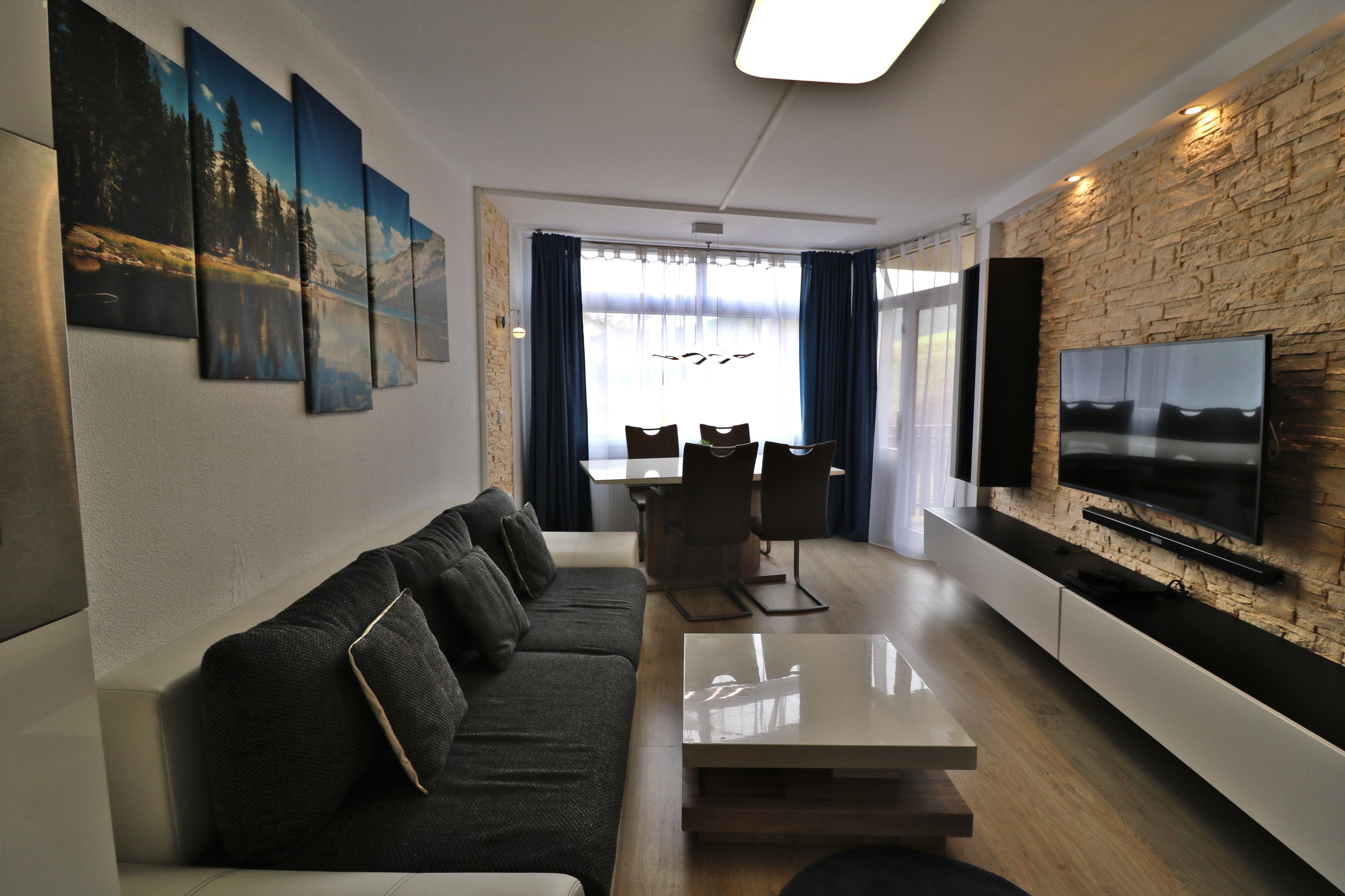 - ein kombiniertes Wohn- und Esszimmer, ein TV und ein Schlafsofa (160x200)