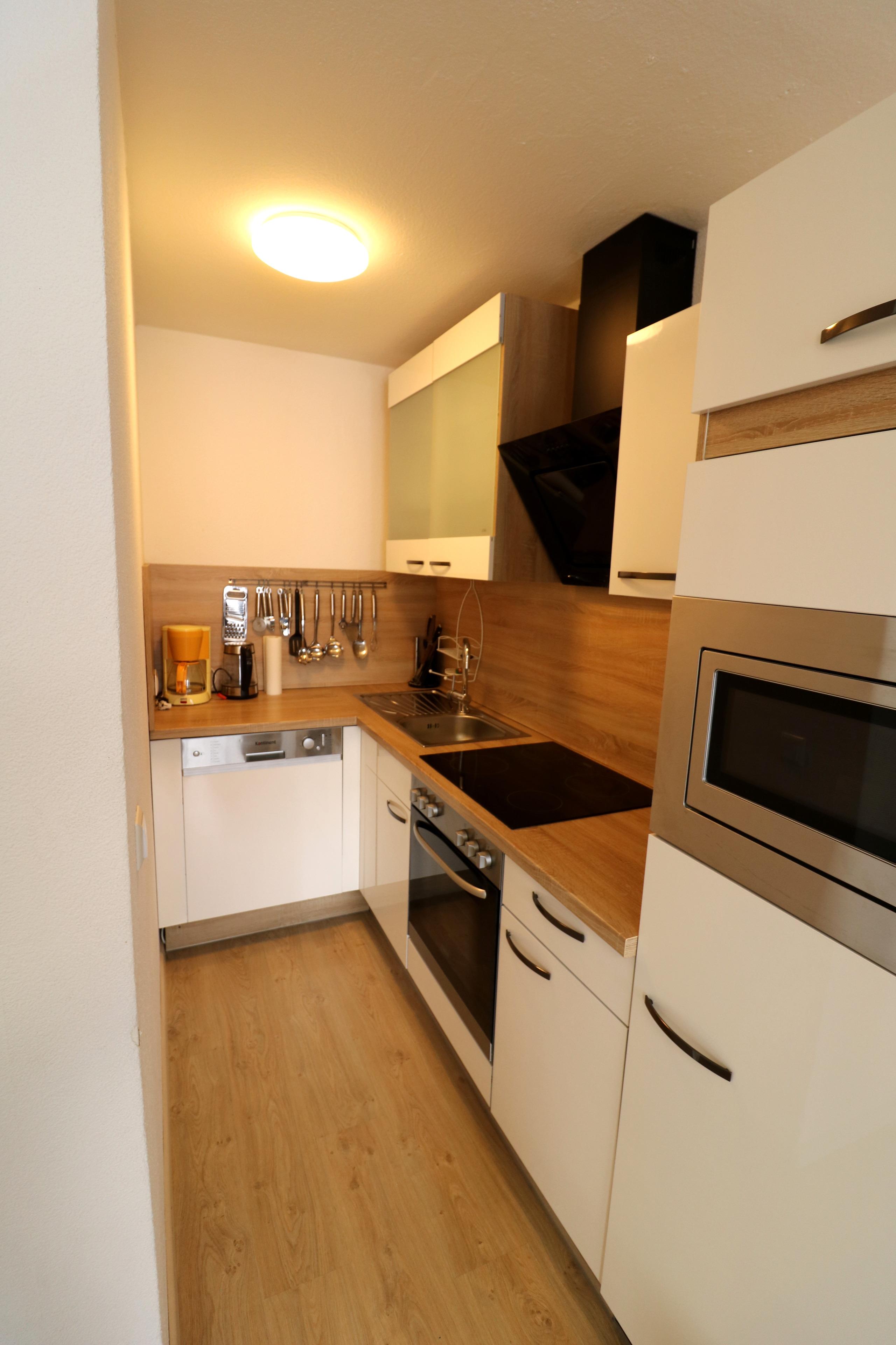 - eine vollausgestattete Küche mit Kühlschrank, Herd mit 4 Kochfeldern, Minibackofen, Mikrowelle, Wasserkocher, Toaster, Filter-Kaffeemaschine, Spülmaschine und Küchengrundausstattung