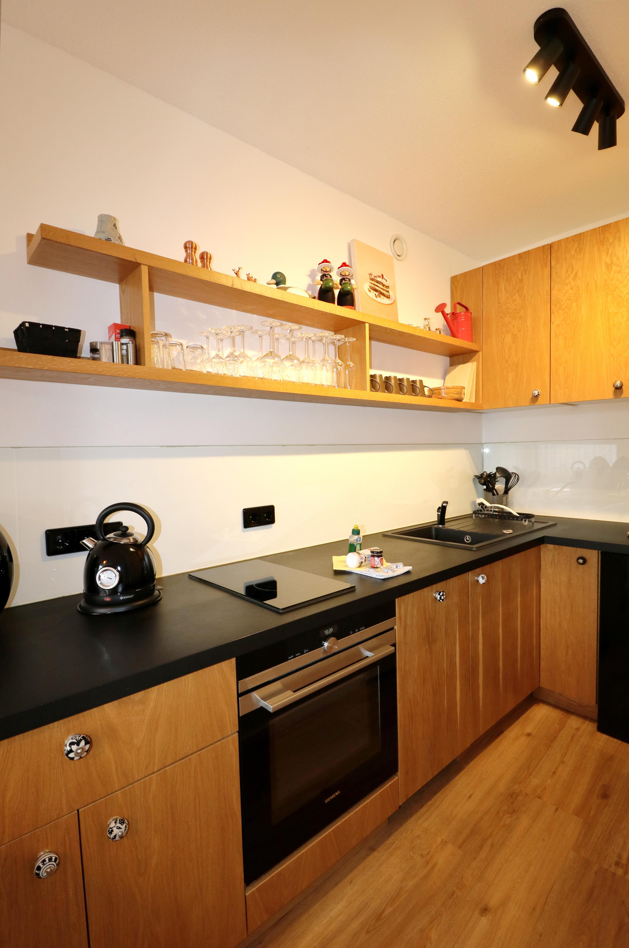 - eine offene Küchenzeile mit Kühlschrank inkl. Eisfach, Ceran-Kochfeld, Geschirrspüler, Backofen, Wasserkocher, Toaster, Dolce-Gusto-Kapselkaffeemaschine und Küchengrundausstattung