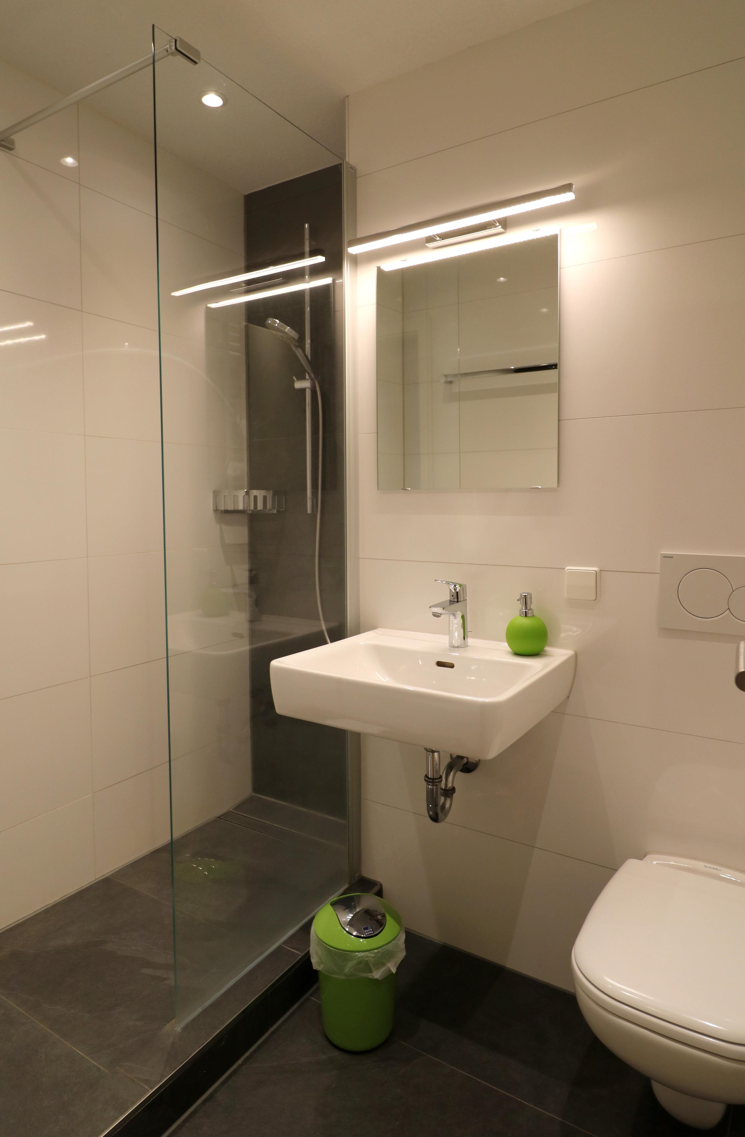 - ein Badezimmer mit Waschbecken, ebenerdiger Dusche und WC
