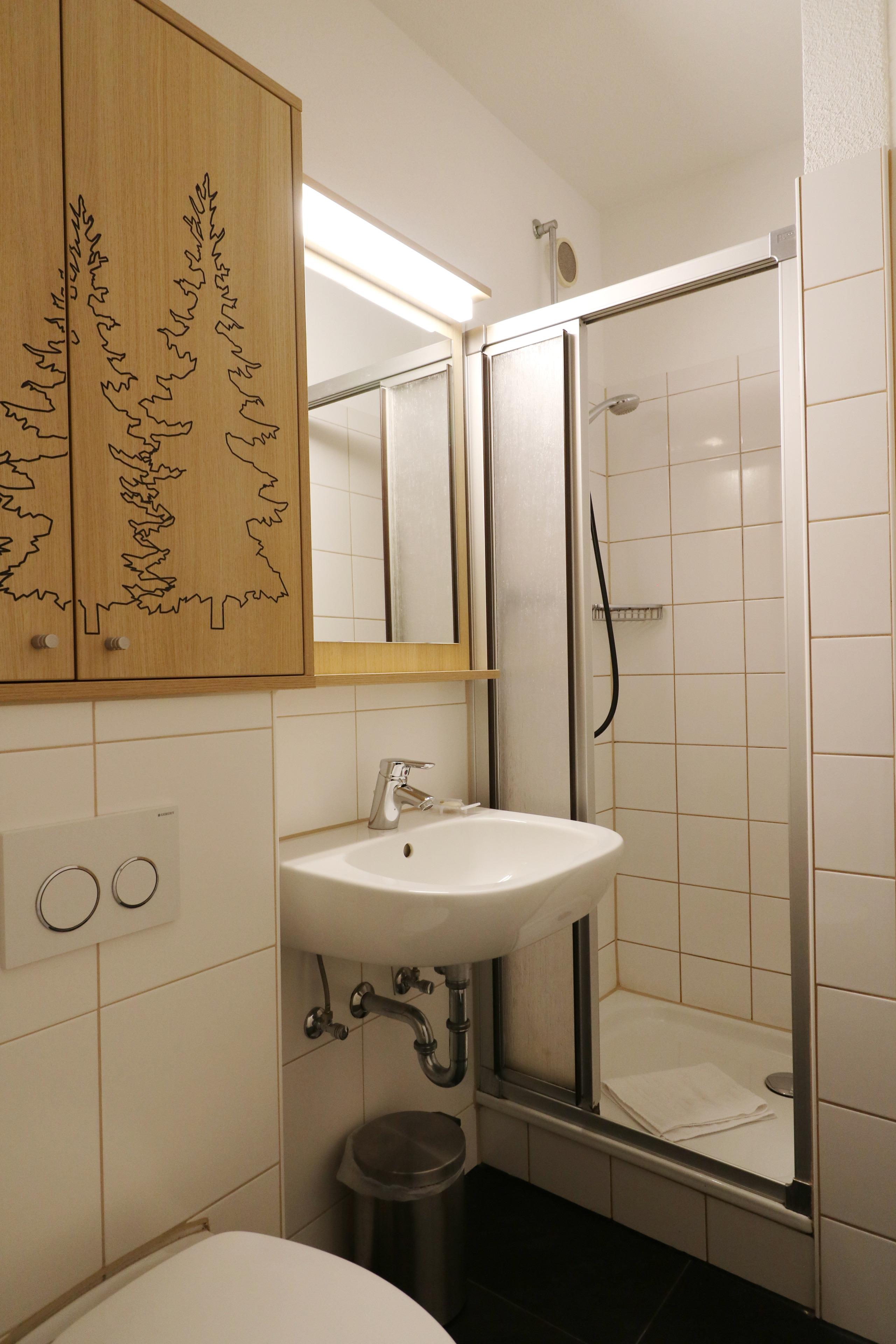 - ein Bad mit Dusche, Waschbecken, WC und Haartrockner