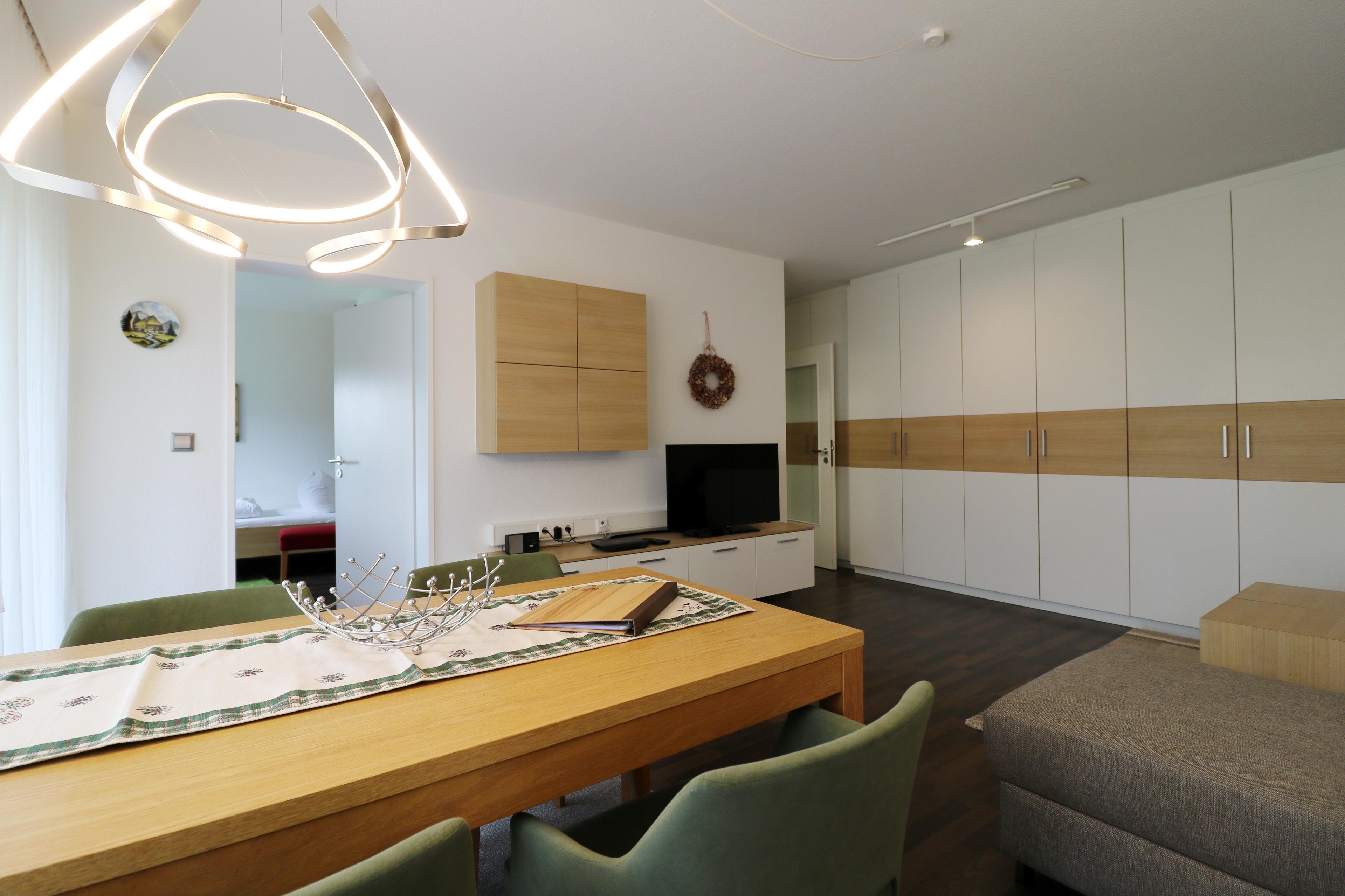 - ein kombiniertes Wohn- und Schlafzimmer mit Schlafsofa (160x200), TV und Essplatz