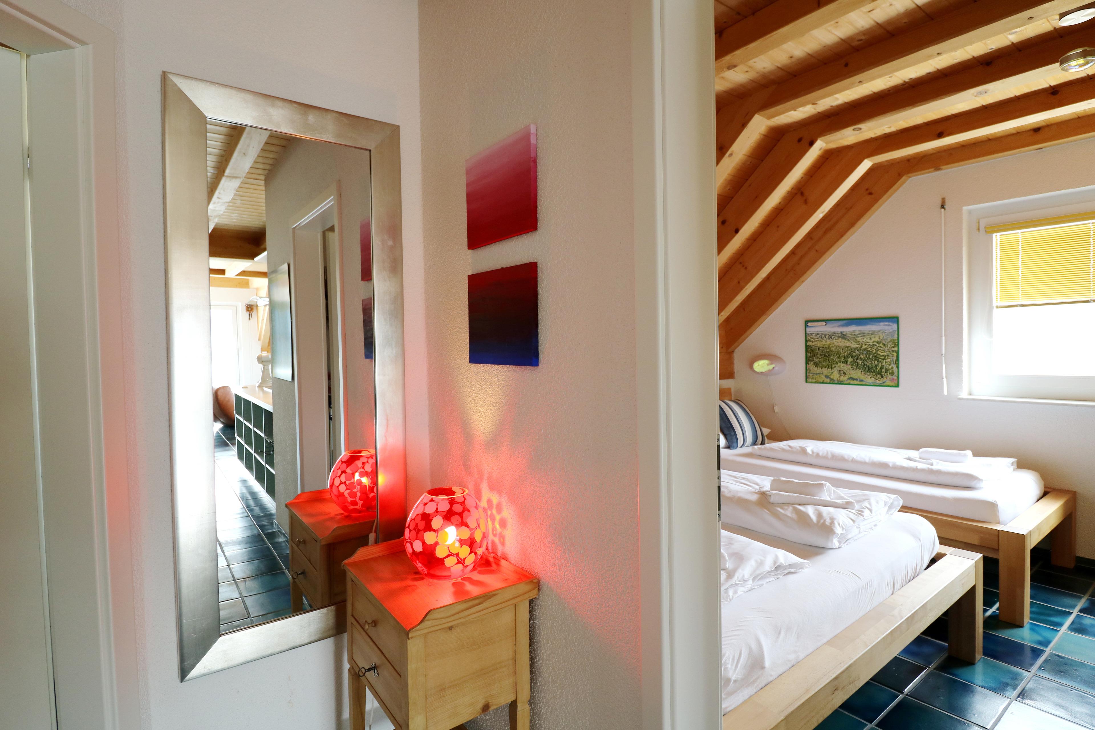 Ebenfalls befindet sich auf dieser Ebene ein abschließbares Schlafzimmer mit Doppelbett (160x200) und Einzelbett (90x200), ein Bad mit bodengleicher Dusche und eine große Südterrasse mit freiem Blick auf den See.