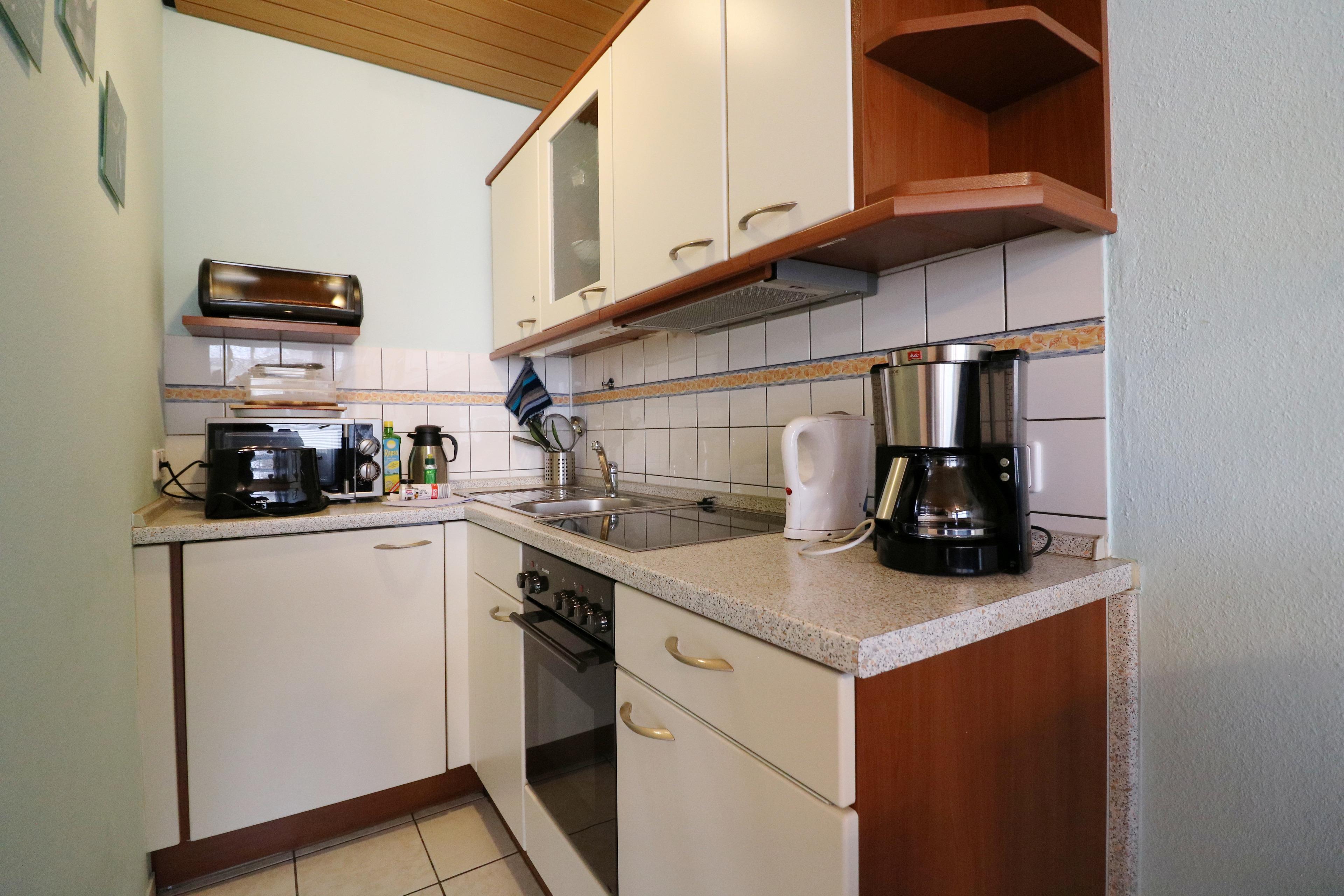 - eine vollausgestattete Küche mit Kühlschrank, Herd mit 4 Kochfeldern, Backofen, Wasserkocher, Toaster, Filter-Kaffeemaschine und Küchengrundausstattung