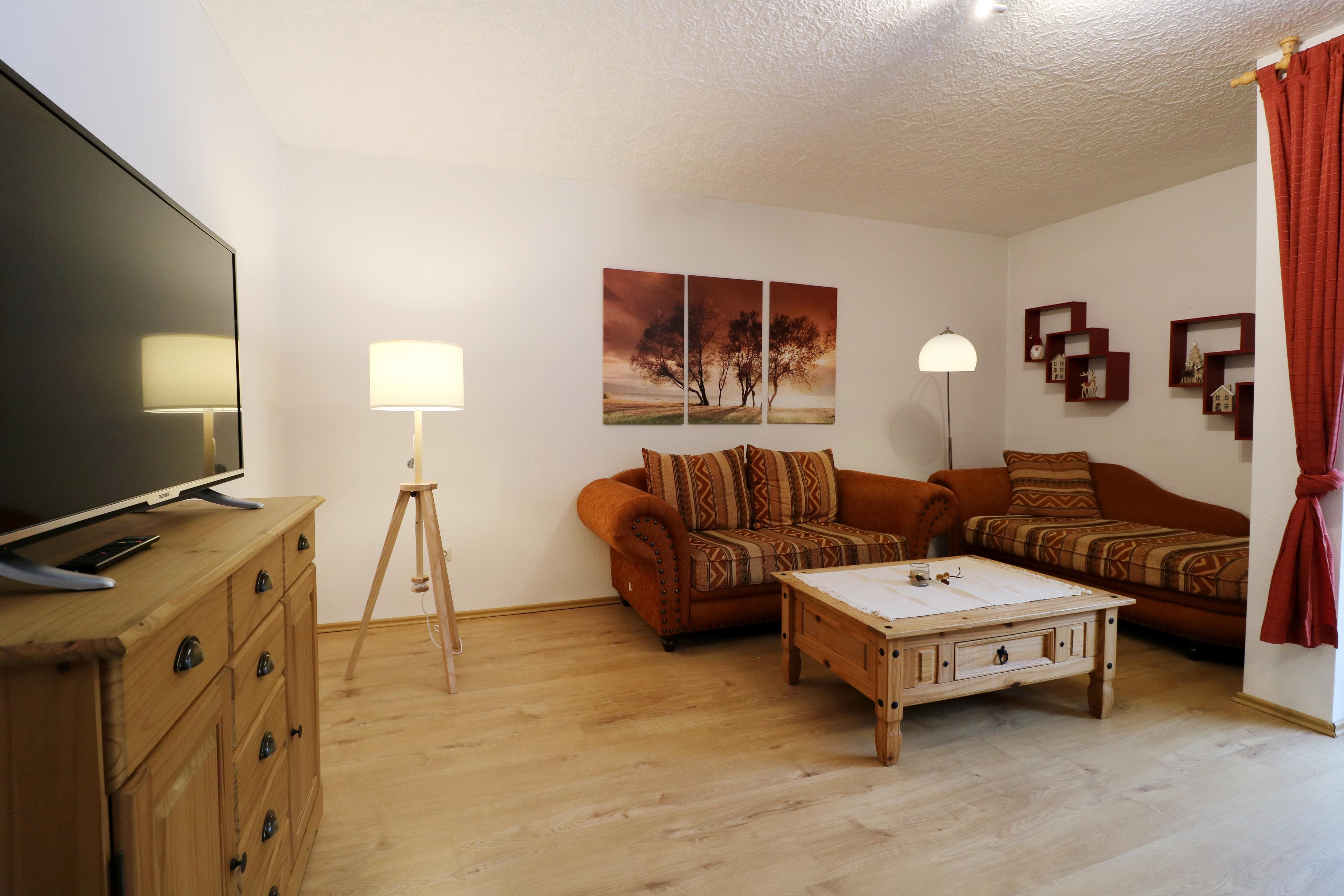 - ein Wohnzimmer mit Sofa, TV und Essecke