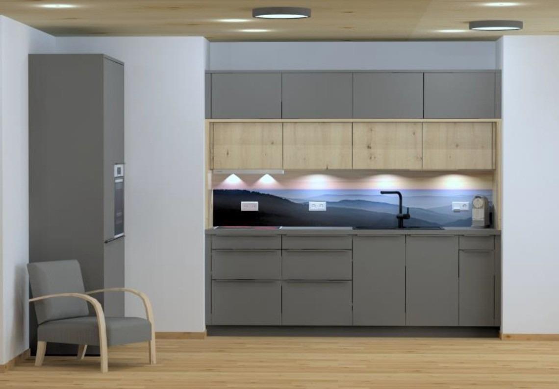 - eine Küchenzeile mit Herd (4 Kochfeldern), Kühlschrank mit Gefrierfach, Kapsel- Kaffeemaschine, Toaster, Wasserkocher, Geschirrspüler, Geschirr und Besteck und Küchengrundutensilien