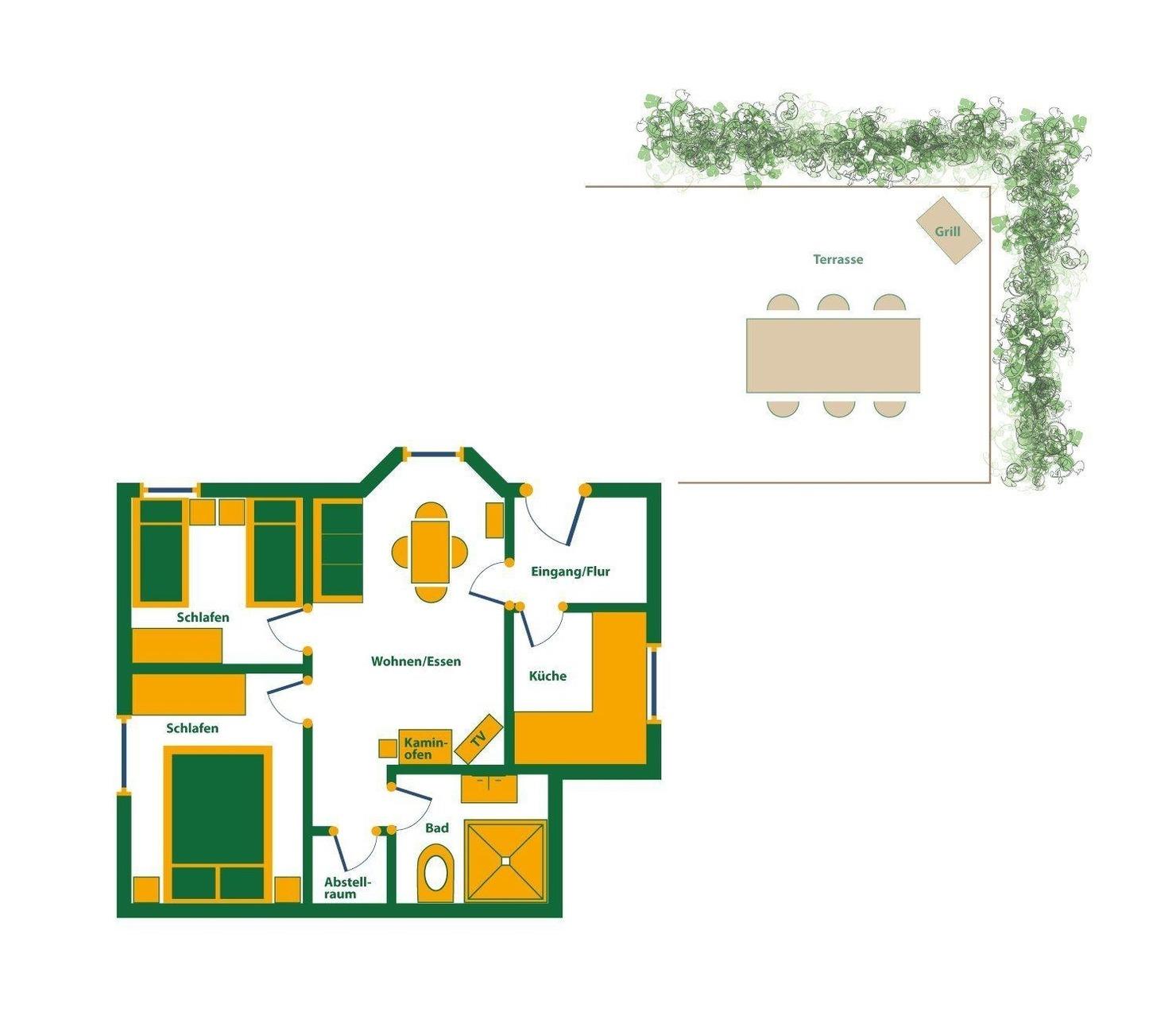 Sie ist modern ausgestattet mit einer Einbauküche (Geschirrspüler, Backofen, Eierkocher, Mixer, Mikrowelle, Toaster, Kaffeemaschine usw.), einem großen hellen Wohn-Essraum mit Kaminofen DVD-Player, großem Flachbildschirm; zwei Doppelzimmer sowie einem Bad mit Dusche/WC, Fön, verstellbarem Kosmetikspiegel, Handtüchern und einem Abstellraum mit Staubsauger, Kinderbett, Kinderhochstuhl.