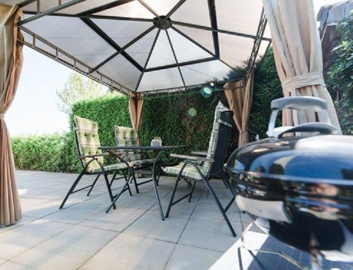 Die großzügige Terrasse mit Grill ist barrierefrei und ebenerdig. Ausgestattet mit Garten- und Liegemöbeln direkt am Haus lädt sie zum Entspannen ein.