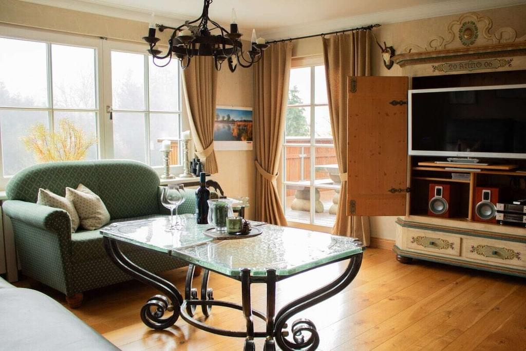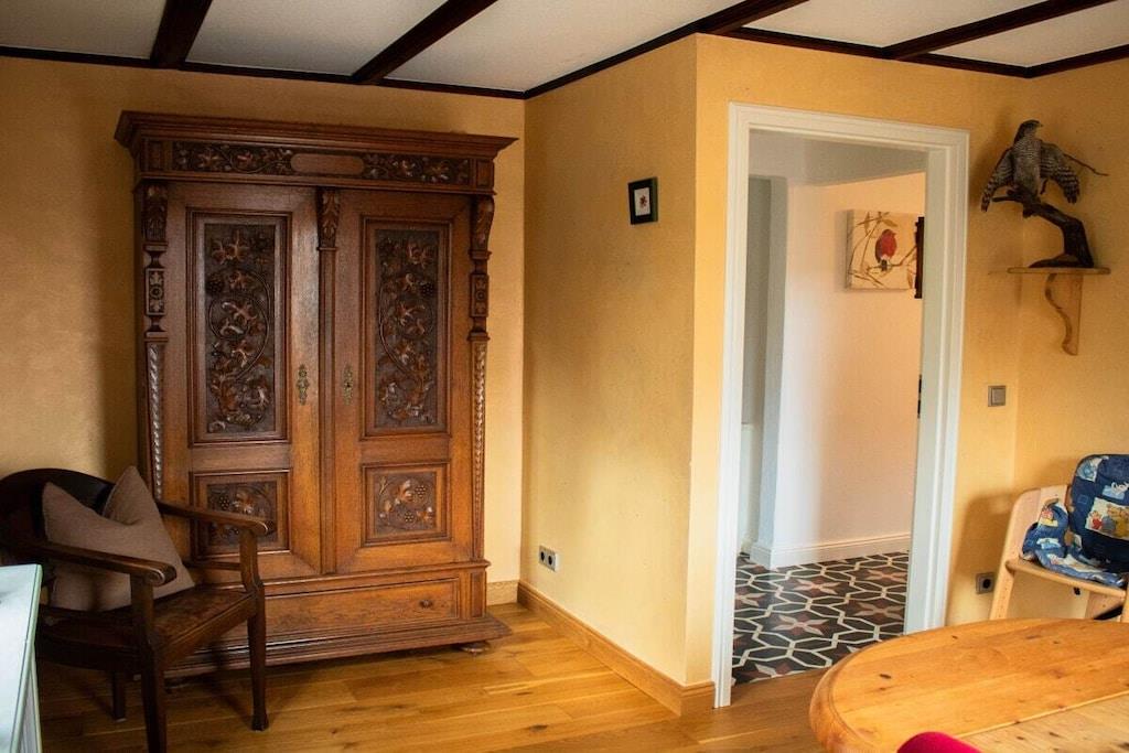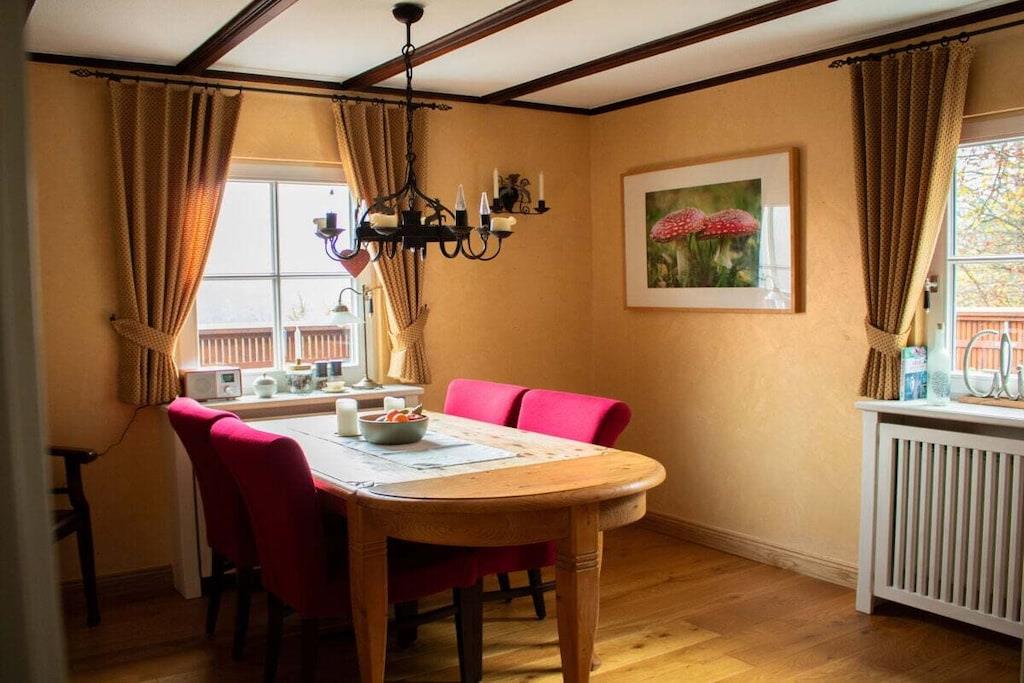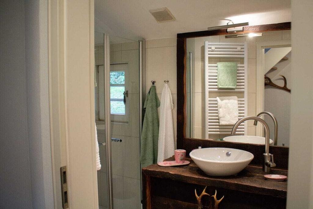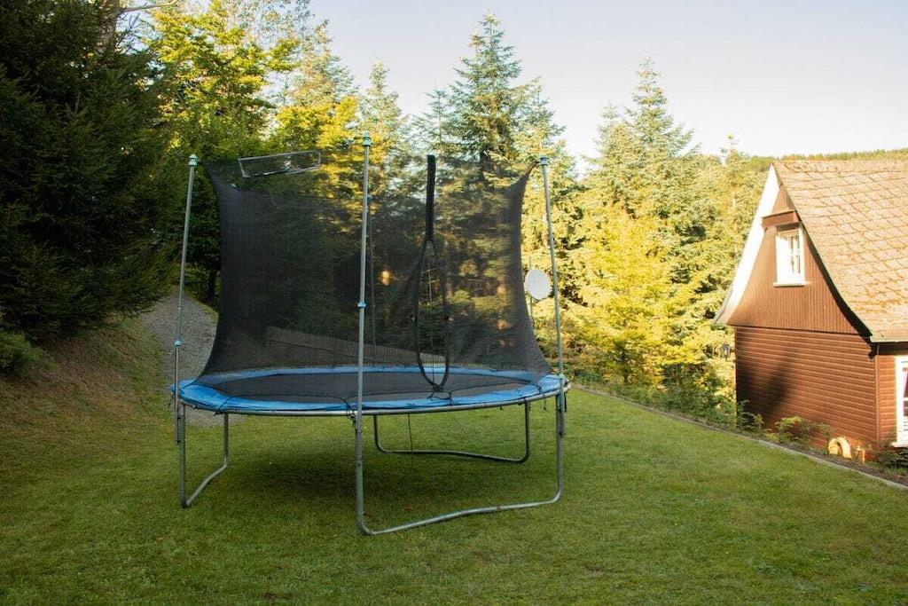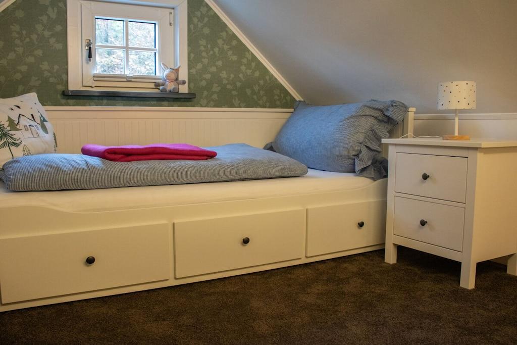 Vores fyrretræshytte har plads til op til 4 voksne, 2 børn og en baby eller et lille barn. I stueetagen er der et soveværelse med en himmelseng (2,00 m x 2,20 m) plus en baby-/småbørns-himmelseng (70 cm x 140 cm), en stue med pejs, et køkken, en spisestue, en gang og et badeværelse med bruser. Ovenpå er der et soveværelse med to enkeltsenge (hver 1,00 m x 2,00 m), et legerum til børn med skrånende loft og en loftshøjde på 1,80 m, møbleret med en seng (80 cm x 2,00 m, udtrækkelig til 1,60 m x 2,00 m), en gang, et badeværelse med bruser, et walk-in closet og en legeplads. Hytten er også perfekt til en ferie for to personer, da alle de nødvendige værelser til to personer er placeret i stueetagen.
