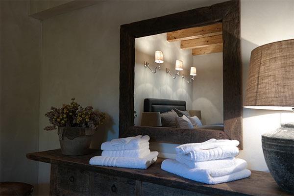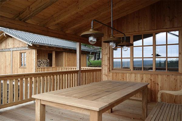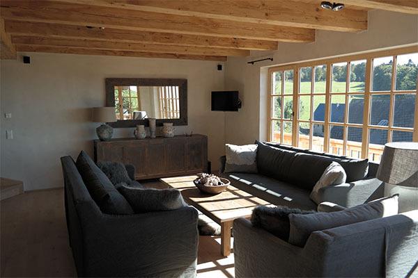 Auch im Inneren finden unsere Gäste all das vor, was man sich von einem Chalet erwartet. Viel altes Holz, Eichendielenböden, urige Steinböden, gemütliche Chalet-Holzmöbel, einen Holzkamin und viele schöne Kissen und Felle. Trotz allem finden Sie hier aber auch eine moderne Küche mit allem Drum- und Dran ebenso wie hochwertige Boxspringbetten, Daunendecken und eine freistehende Badewanne. Bis hin zur Sauna mit Panoramablick ist alles vorhanden. Das Wohnzimmer bietet einen kilometerweiten Blick über die Wälder und Wiesen. Im Winter kann man hier die Skifahrer auf der Piste beobachten. Neben dem Wohnzimmer gelangt man auf eine ca. 40 m2 große überdachte Terrasse mit Tisch und Bänken. In der wärmeren Jahreszeit lässt es sich hier gut frühstücken – traumhafter Weitblick über das Tal und die umliegenden Wälder inklusive.