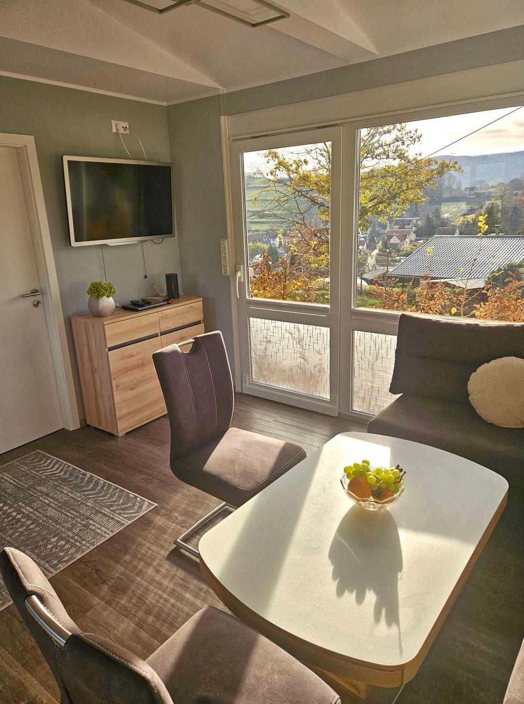 Das offene Wohnzimmer verbindet Wohn- und Küchenbereich zu einem lichtdurchfluteten Wohlfühlraum. Eine große Fensterfront öffnet den Blick über Schmerbach bis zum Inselsberg – und dank außen verspiegelter Scheiben bleibst du dabei jederzeit geschützt vor neugierigen Blicken. Die bequeme Couch lädt zum Ausruhen, Lesen oder Fernsehen ein. Der clevere Esstisch lässt sich flexibel anpassen: niedrig als Couchtisch oder ausgezogen für gemeinsame Mahlzeiten.